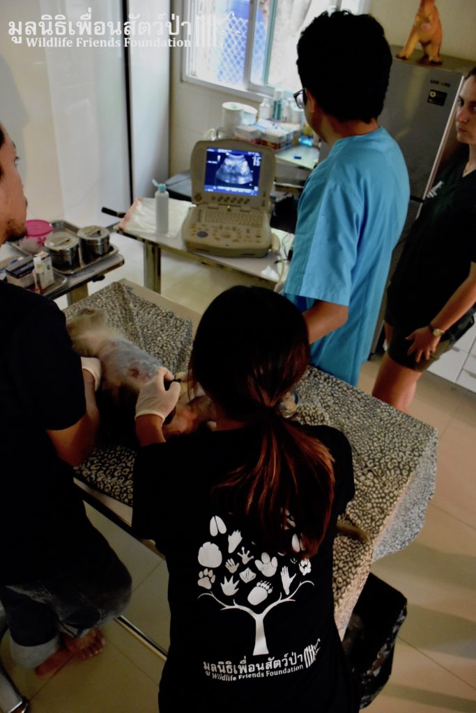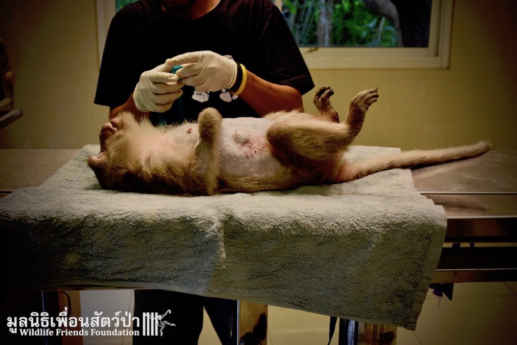 We have named this macaque Chomsin, after the road she was found on. Upon arrival to the WFFT Wildlife Hospital the vet team performed an ultrasound to check on the health of the unborn infant. Sadly, the ultrasound reveled that the infant was dead. Chomsin was rushed into emergency surgery to perform an abortion in the hope that we could at least save her life. The infant was successfully removed and less than 24 hours later, Chomsin is now sat up eating and drinking. However, this does not mean she is out of the woods yet, we will only be able to tell over the next few days if she will make it, and if she does she will be released back to the wild. We will keep you posted on her progress.