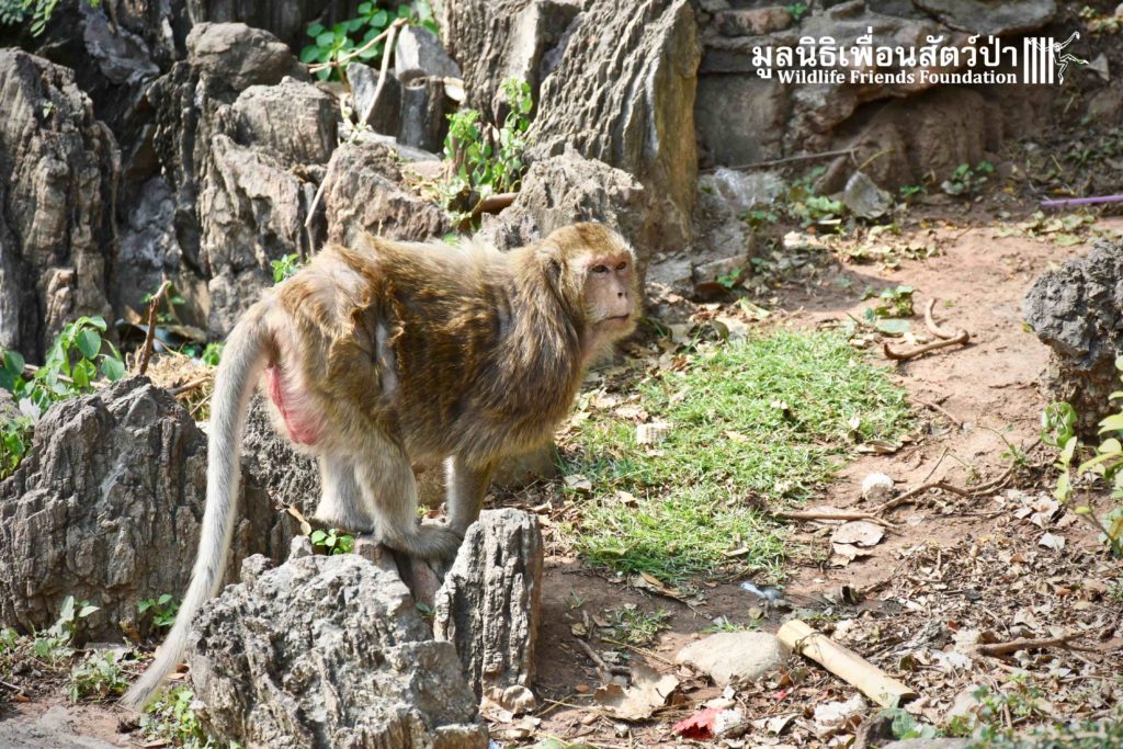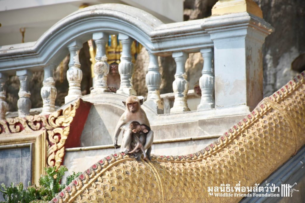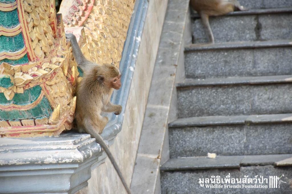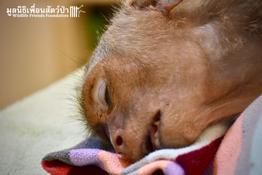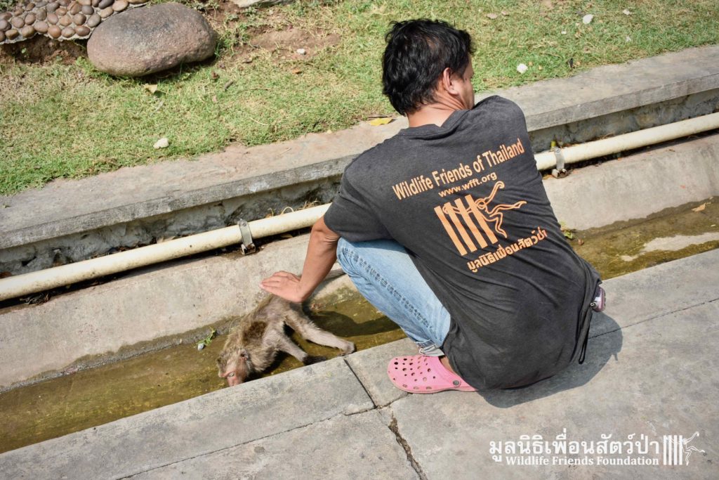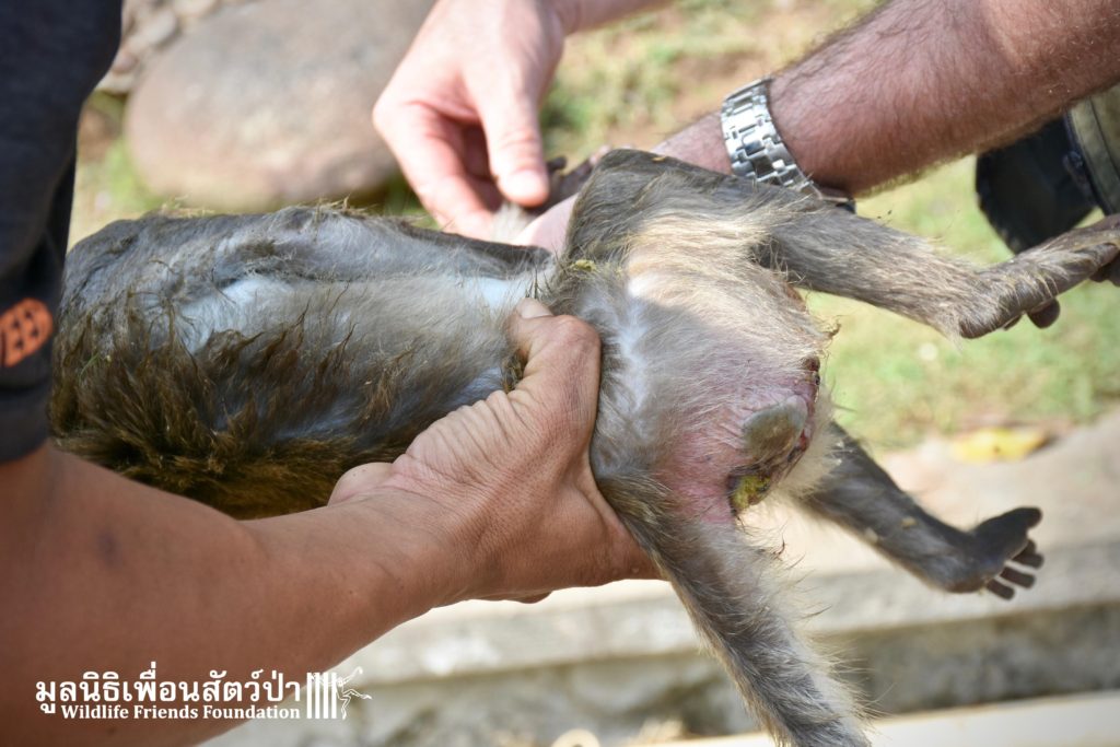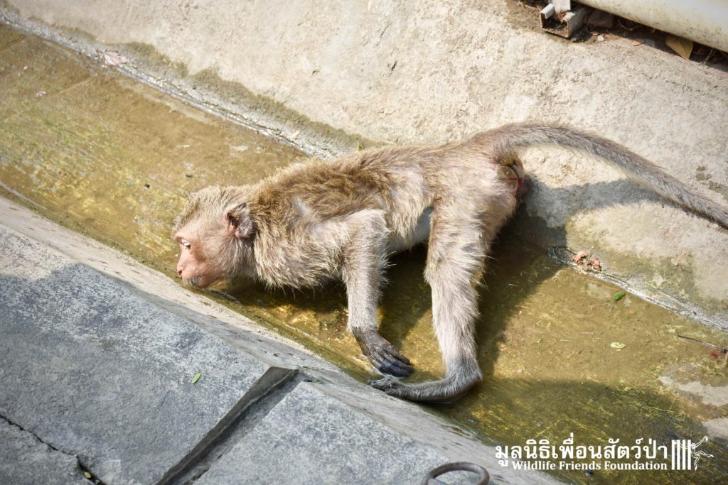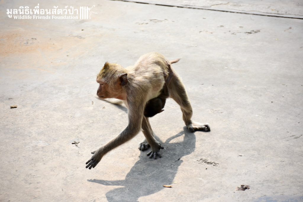 Recently the WFFT Wildlife Hospital Rescue Team were called by a local woman working at Khao Yoi Temple about a female long-tailed macaque who fell from a tree and could not move. The macaque in question had a young infant so the situation was even more urgent. When the Rescue Team arrived on site, they found a poor monkey laying in a gutter. The woman who called us and kept an eye on the injured mother macaque told us the baby was now holding onto another female that we could see walking away with the infant. She was in bad condition. Fast breathing, almost unanimated, the Vet Team decided to give her a light sedative to ensure her safety.
