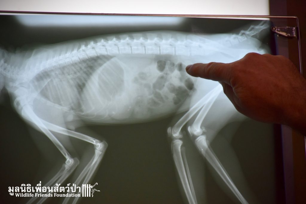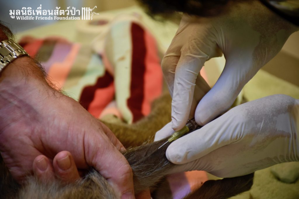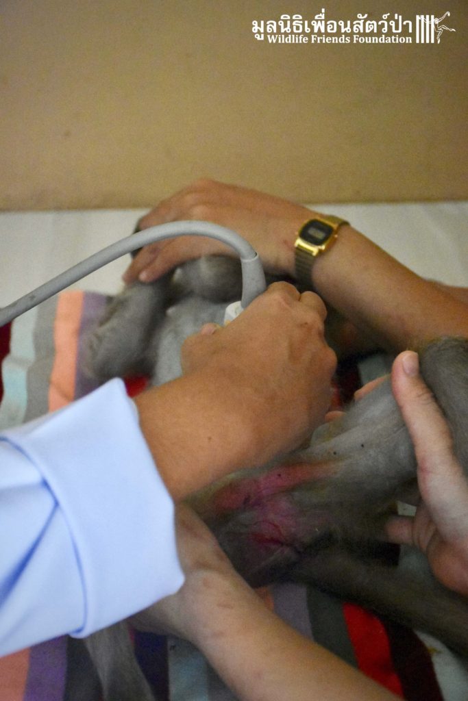This temple is inhabited by a large population of macaques. Since the rescue team arrived they were observing the situation, many of the monkeys took an interest in what the team were doing, they needed to act fast to avoid any conflict with the concerned monkeys. Once the monkey had been transported to the rescue vehicle, the decision has been made to take her to a clinic to take on x-ray to access her further. The X-ray didn’t reveal any major broken limbs, just a small fracture on a toe but because had big secreting fluid from the anus, the vet decided to ask for further examinations.