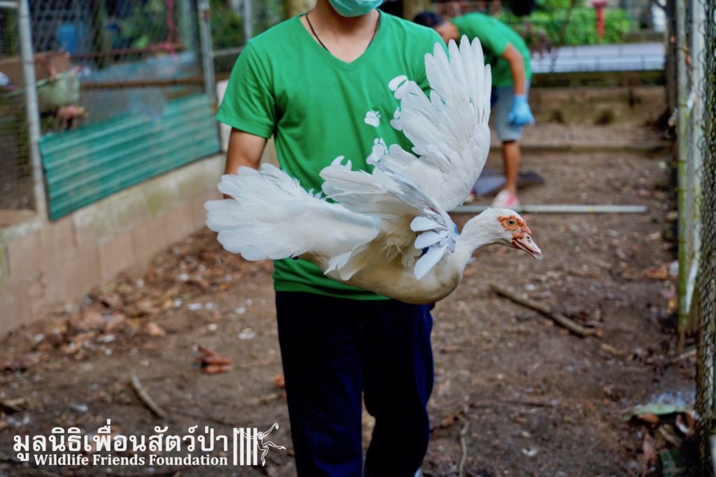 The goat proved a bit more frisky but once secured was gentle and relaxed. Two porcupines were netted and popped in a cage with ease and the Peafowl quickly followed. The goose was at the gate of his enclosure waiting to be let out so he was quickly restrained along with two of the ducks. The third duck had disappeared but luckily was spotted before the team finished and joined her friends. The Guineafowl was standing over her dead mate when the team visited previously and showed little resistance to leave this hell hole.
