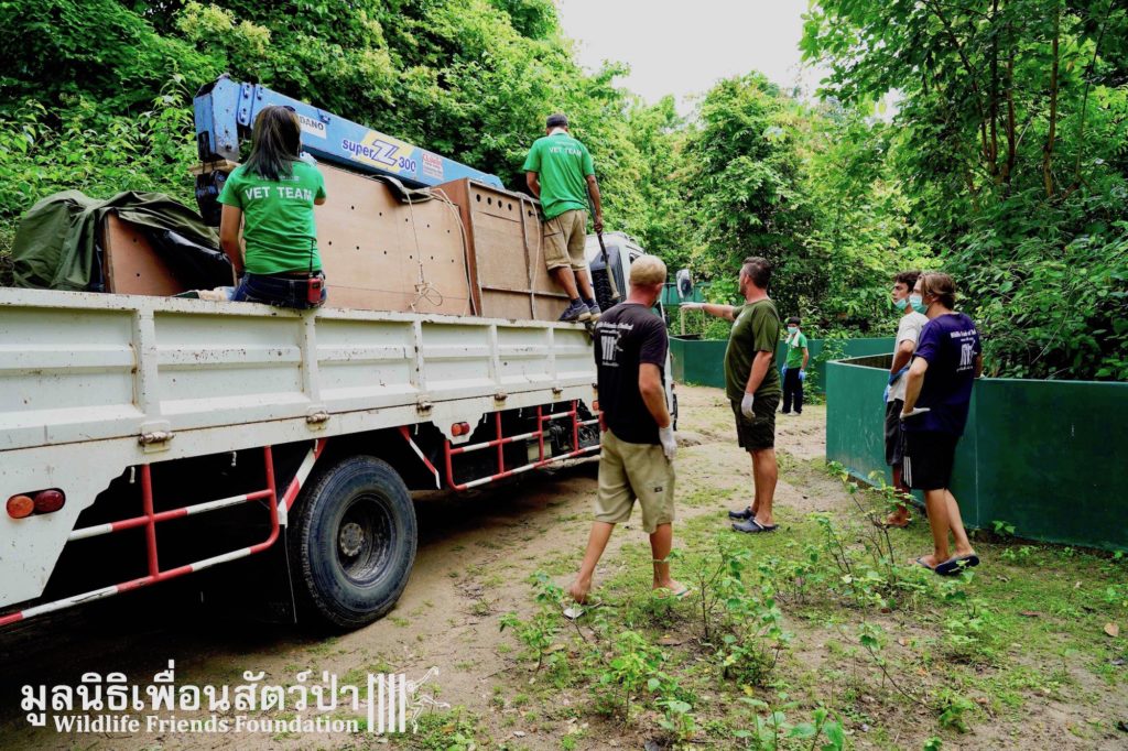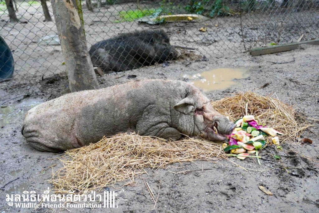 The first vehicle arrived back and WFFT at 3pm and the last animal placed in his new pen at 5pm. A very long and exhausting day for the team but to end the day watching the wild boar take his first mud bath in many years made it all worthwhile.