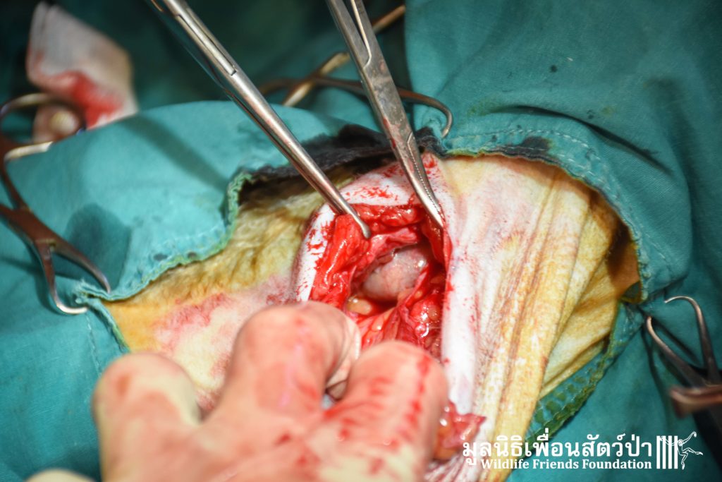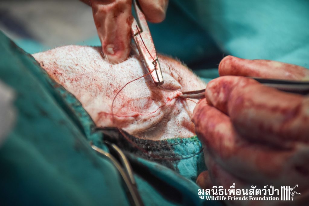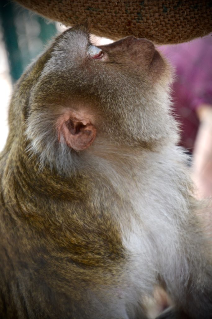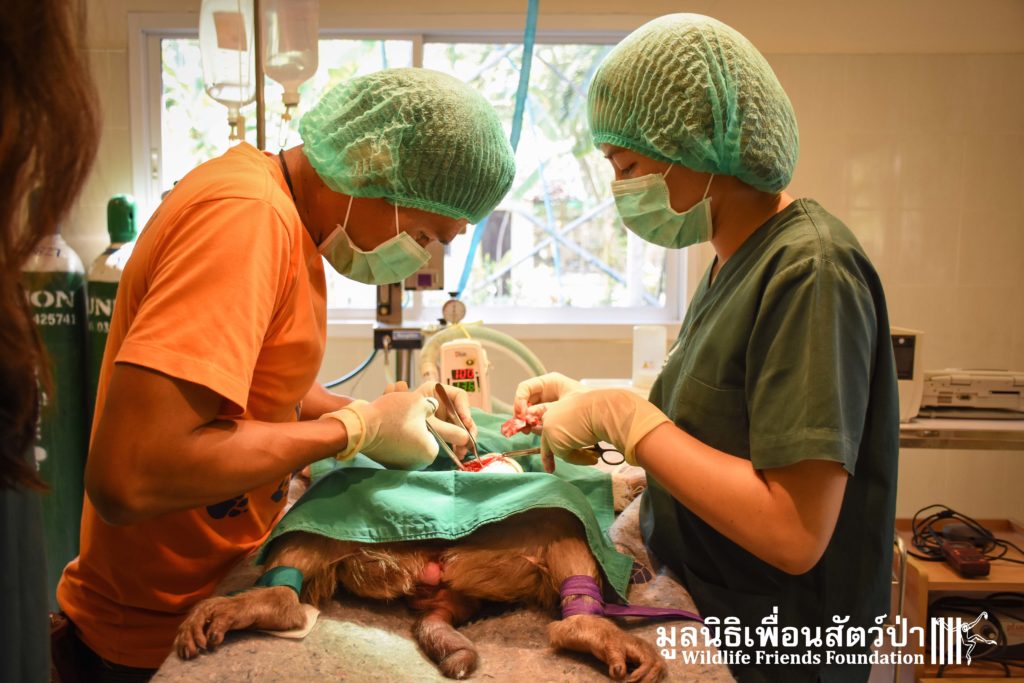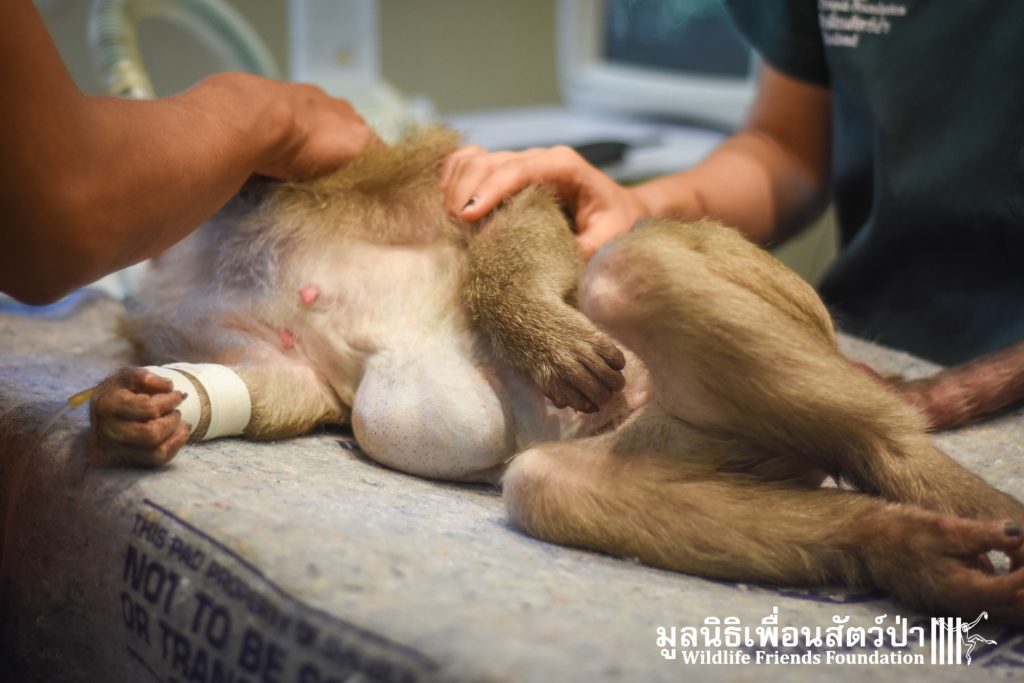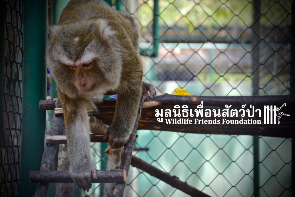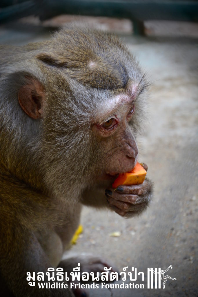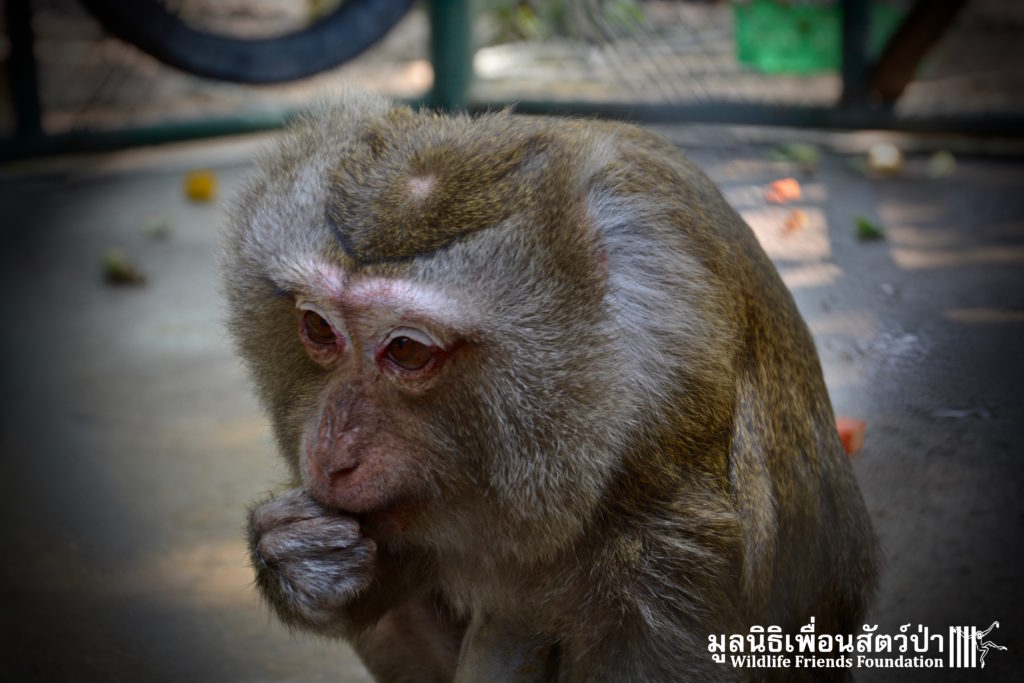Jaw the elderly female Northern pig-tailed macaque (Macaca leonina) was rescued just over three weeks ago after spending the last 15 years of her life in solitary confinement at a temple in Northern Thailand. After a health check was performed on Jaw it was found that she had a large hernia on her abdomen. She spent the first few days adapting to a chain free life in WFFT’s Quarantine Area, with proper care and diet. We decided to perform surgery to correct the hernia after this settling in period. Its been three days since the operation was performed and Jaw is recovering well. The pain she has felt for years is slowly going away, this old lady has inspired us all with her resilience and strength. She is eating well and exploring her enclosure more and more, even climbing on her environmental enrichments. We cannot wait to be able to introduce her to some other macaques here at the WFFT Wildlife Rescue Centre. See her rescue story here http://bit.ly/1MSfNwy. We will keep you updated on her progress.