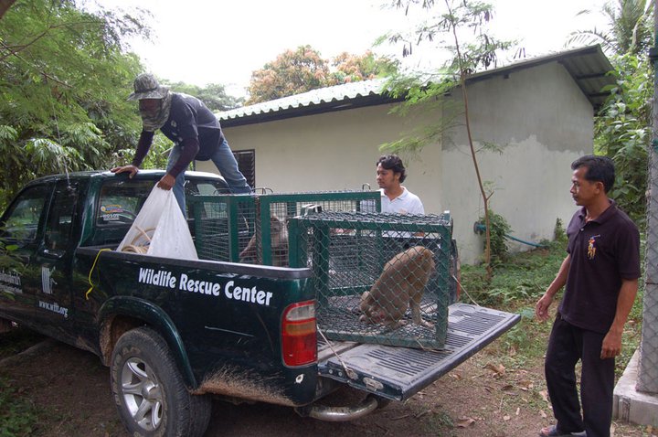 First to be transported up to the new field were Long-tailed macaques Namfon, Sue, Mia and Shirley, who many past and present volunteers know collectively as ‘the old ladies’. Whilst Sue and Namfon disappeared into the bushes after being released into the field, Shirley – who is already looking likely to be the head of the group – and Mia had a full explore of their environment.