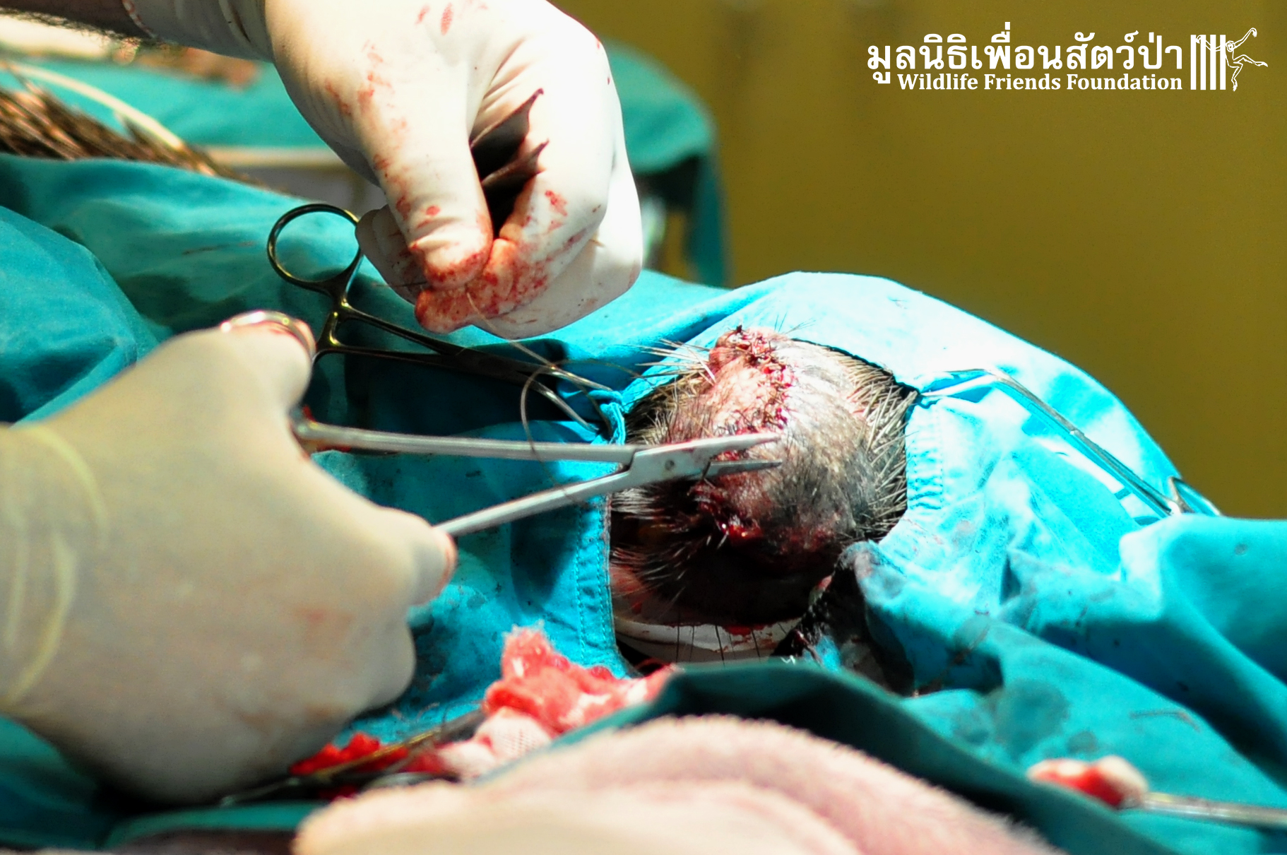 This Monday morning our week started with a busy day in our wildlife hospital. A malayan porcupine that was kept at a temple in Prachuapkhirikhan province was brought in with a bleeding nose and our veterinary team quickly started with a diagnose and treatment. The porcupine has a huge swelling on the nose which turned out to be a tumor.