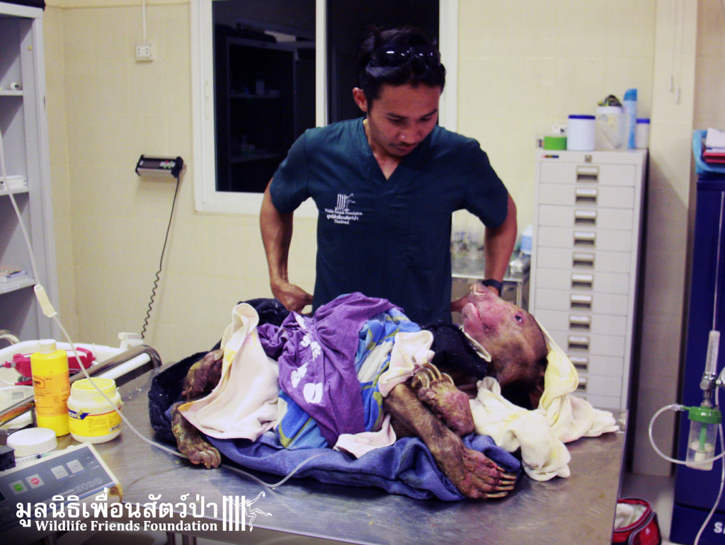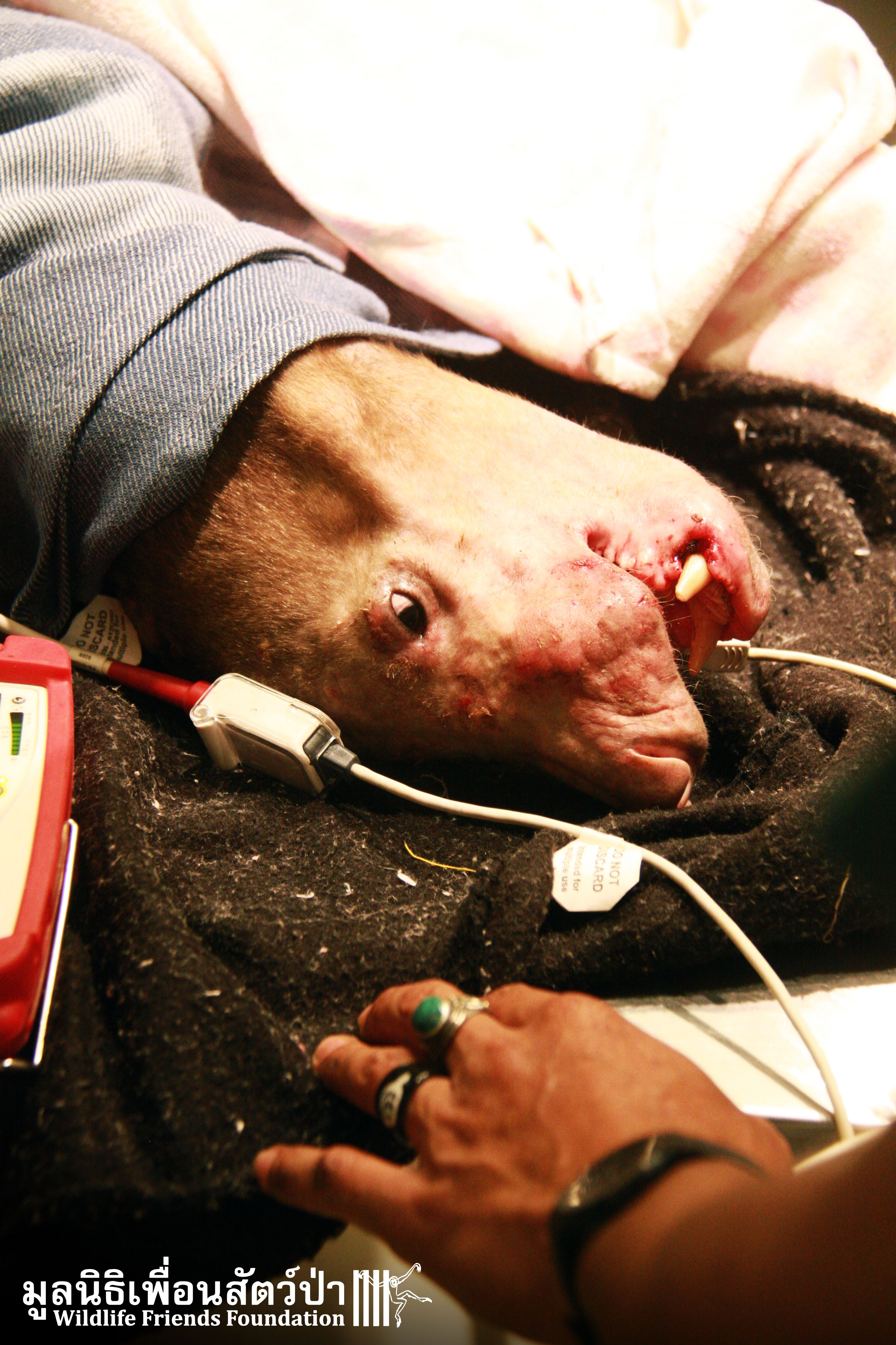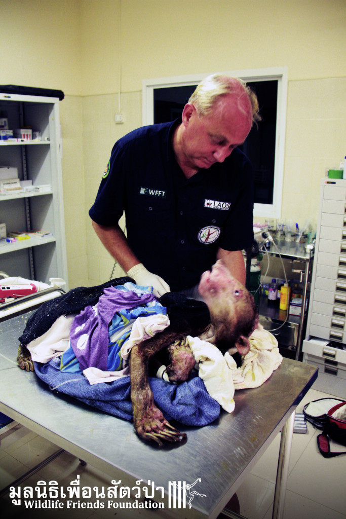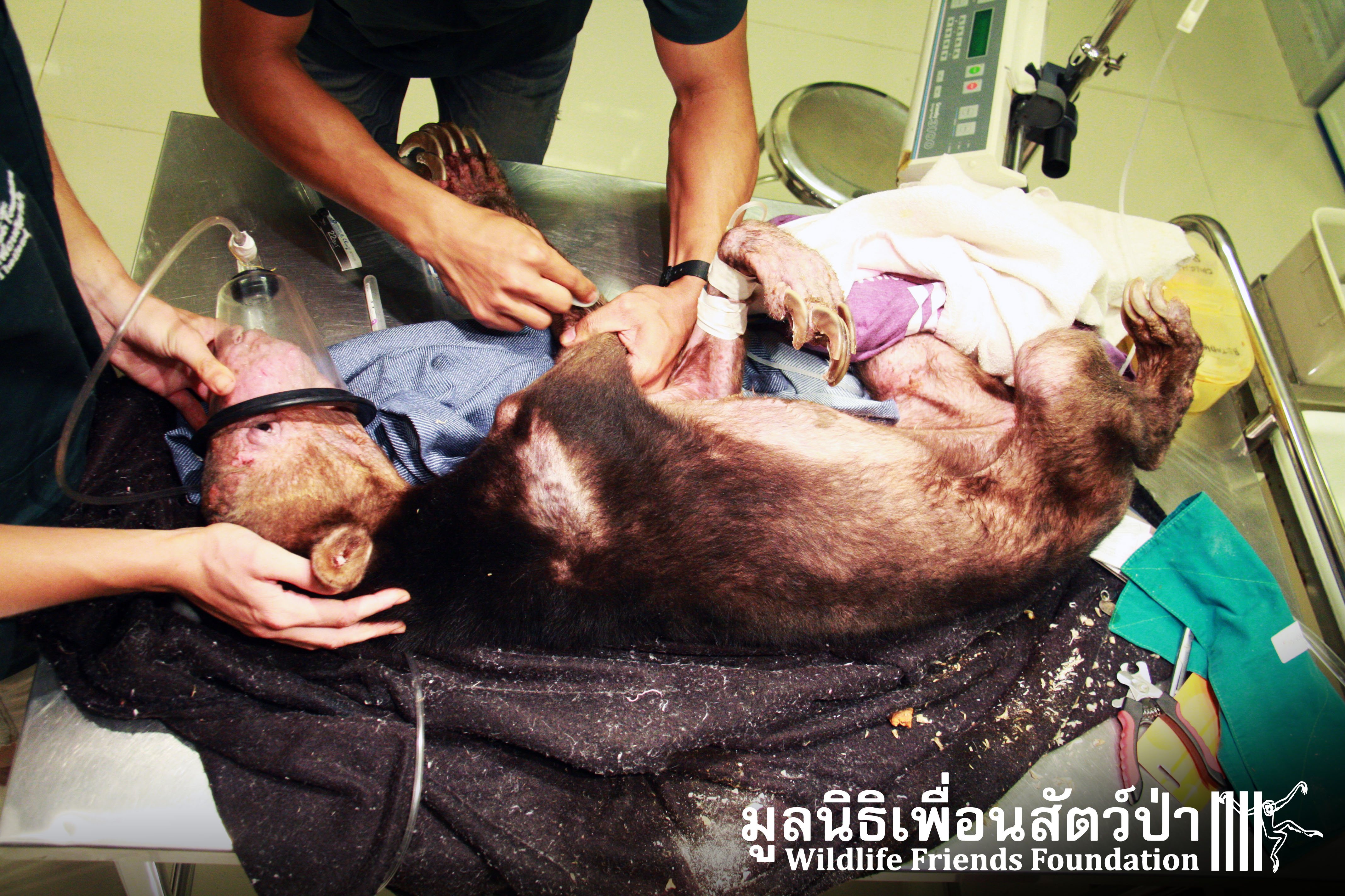 The sun bear is very ill and can hardly walk, she is literally skin over bones and needs urgent care, but team feels we might be too late to safe her. As the little bear is surely not going to make it at the temple we decide to take her to WFFT wildlife hospital. On arrival at WFFT the bear is recovering from anaestiesa but show signs if stress and weakness. She is put under intensive care.
