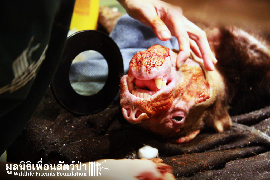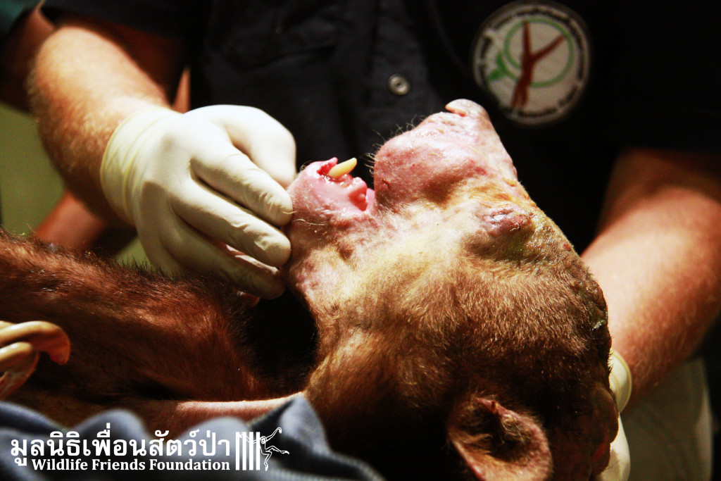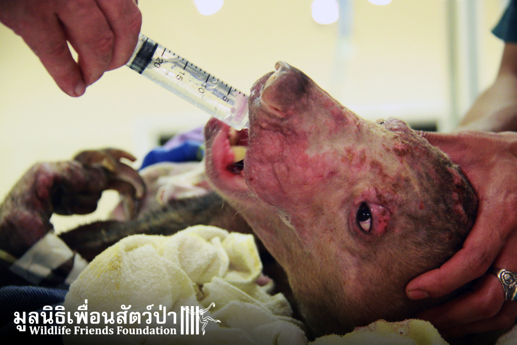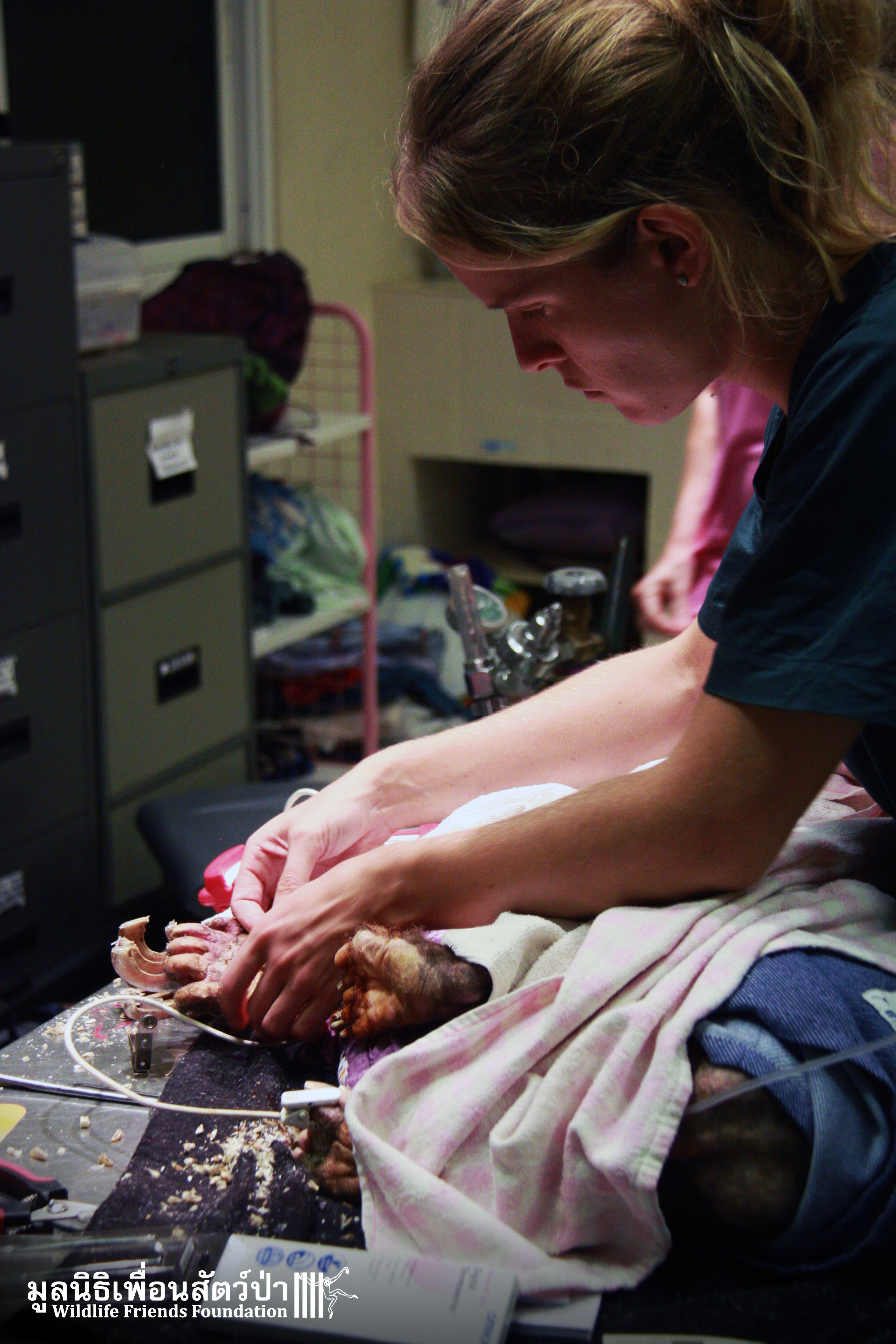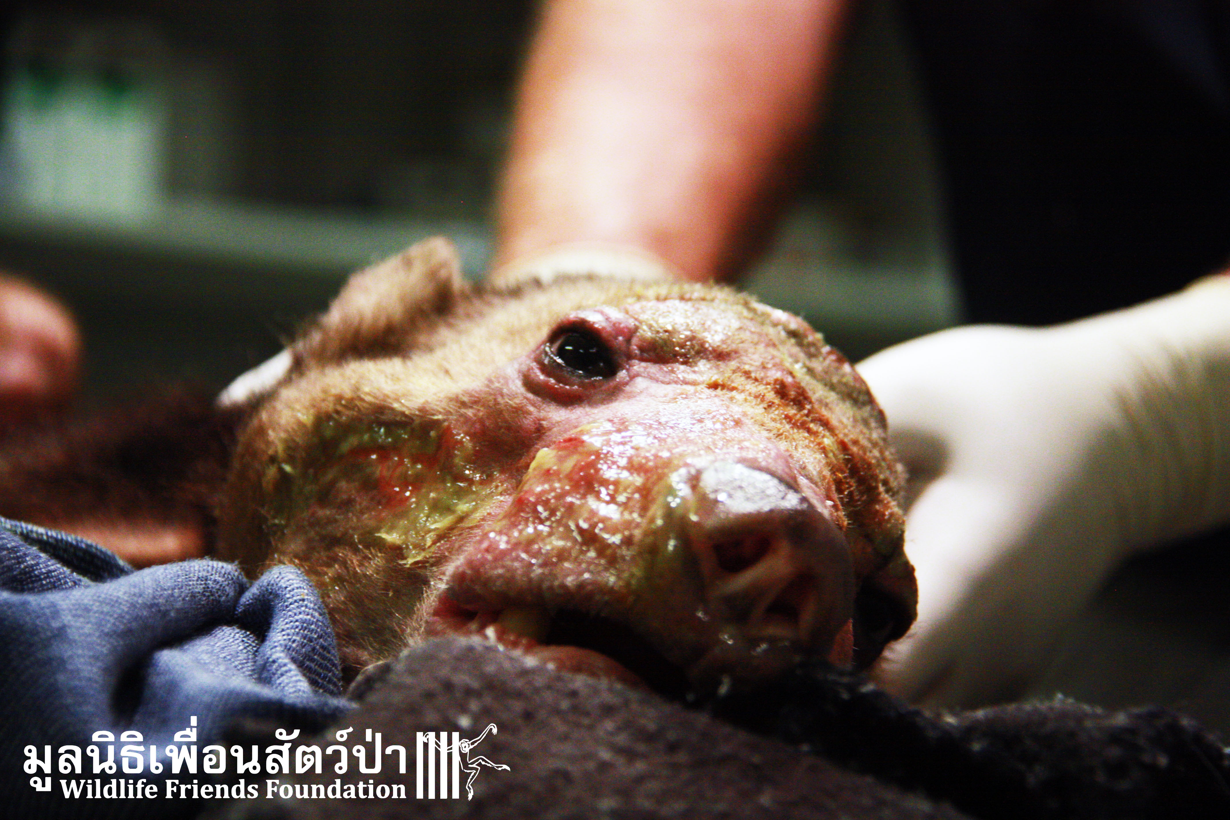 The sun bear is very ill and can hardly walk, she is literally skin over bones and needs urgent care, but team feels we might be too late to safe her. As the little bear is surely not going to make it at the temple we decide to take her to WFFT wildlife hospital. On arrival at WFFT the bear is recovering from anaestiesa but show signs if stress and weakness. She is put under intensive care.