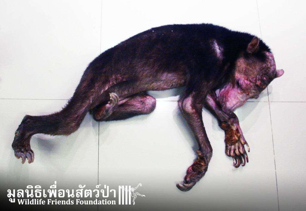 The bear had been in the room for so long, without any sunlight, that it got weak,, skinny and lost almost all hair. The WFFT wildlife rescue team begged the owners to give up the poor bear so it could be taken to the WFFT hospital for treatment, to save it’s life!