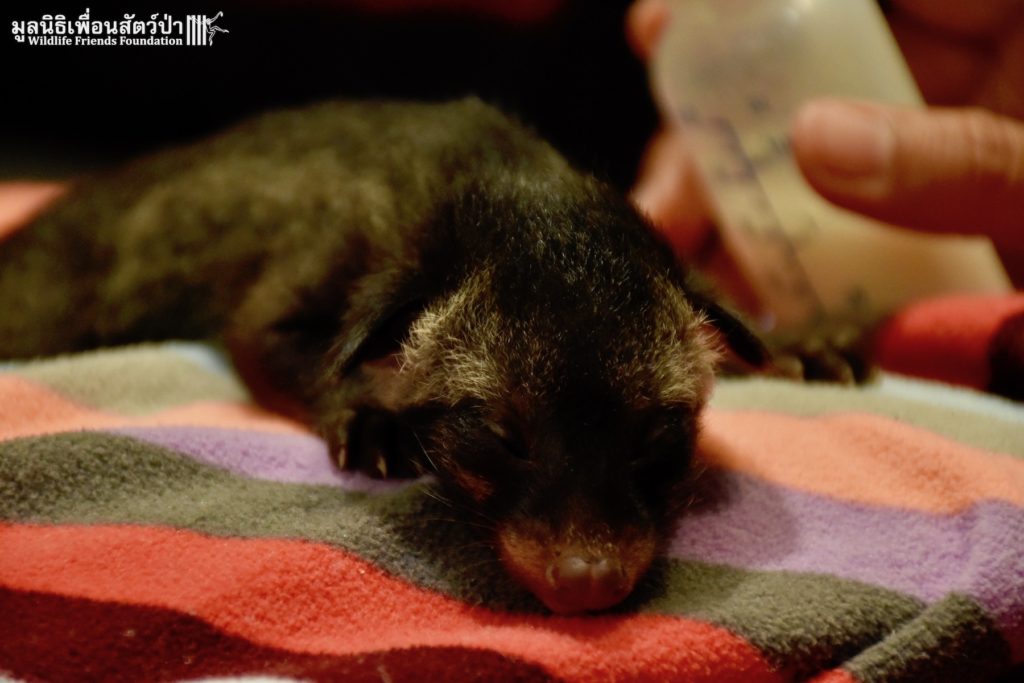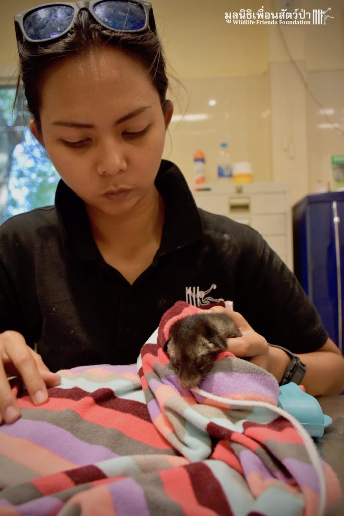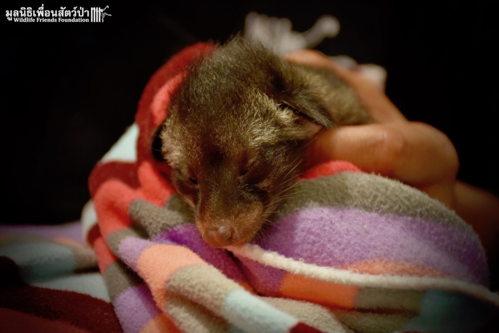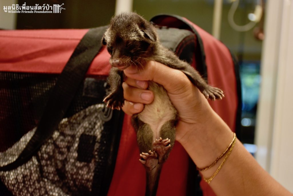 A few days ago we received a call from a member of the public who had found a very young common palm civet (Paradoxurus hermaphroditus) on the ground under a tree screaming, the little kitten was covered in ants. He picked up the kitten and cleared the ants away, unfortunately its mother was no where to be seen, the man then called us to help. The WFFT Rescue Team headed out straight away to collect this little one, she was found about 1-hour south of the WFFT Wildlife Rescue Centre. The team collected her and brought her directly back to WFFT.