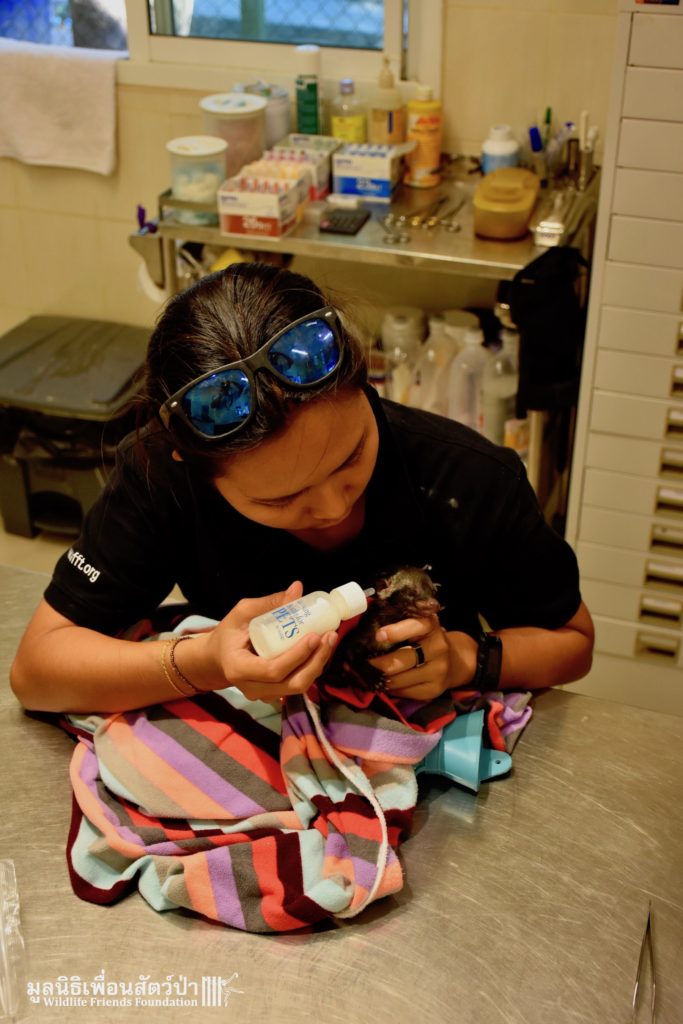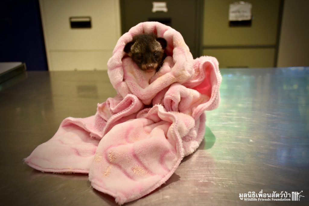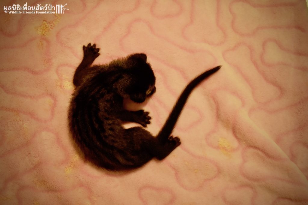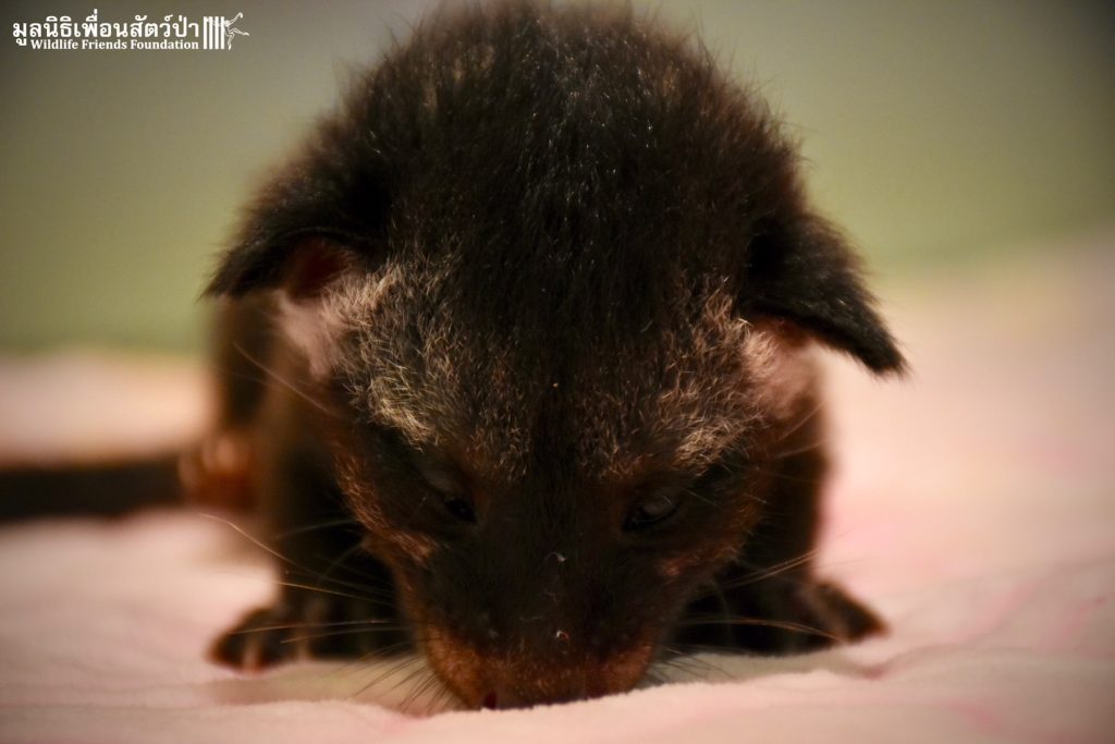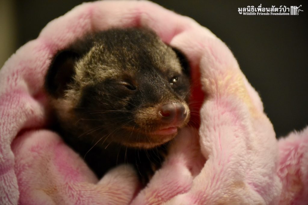 A few days ago we received a call from a member of the public who had found a very young common palm civet (Paradoxurus hermaphroditus) on the ground under a tree screaming, the little kitten was covered in ants. He picked up the kitten and cleared the ants away, unfortunately its mother was no where to be seen, the man then called us to help. The WFFT Rescue Team headed out straight away to collect this little one, she was found about 1-hour south of the WFFT Wildlife Rescue Centre. The team collected her and brought her directly back to WFFT.