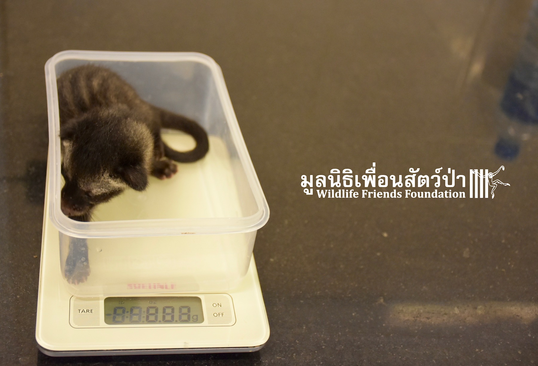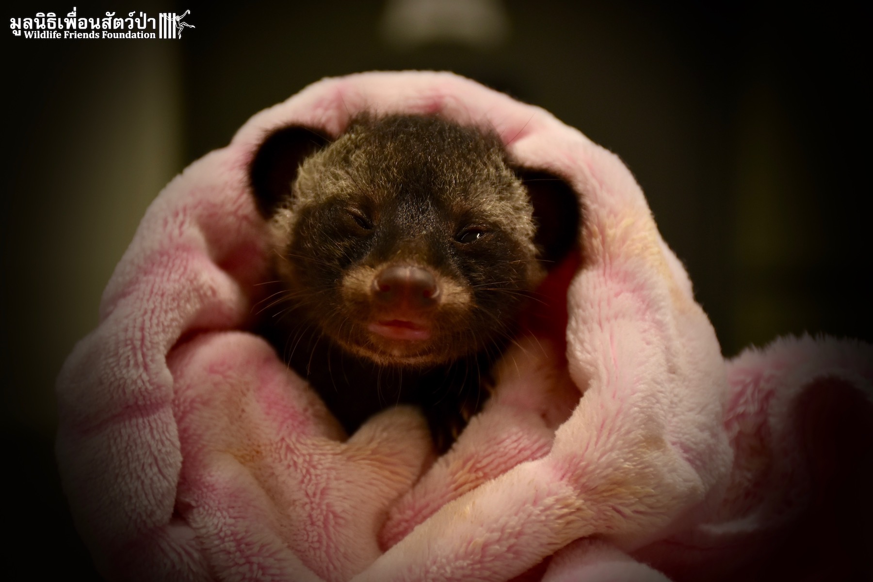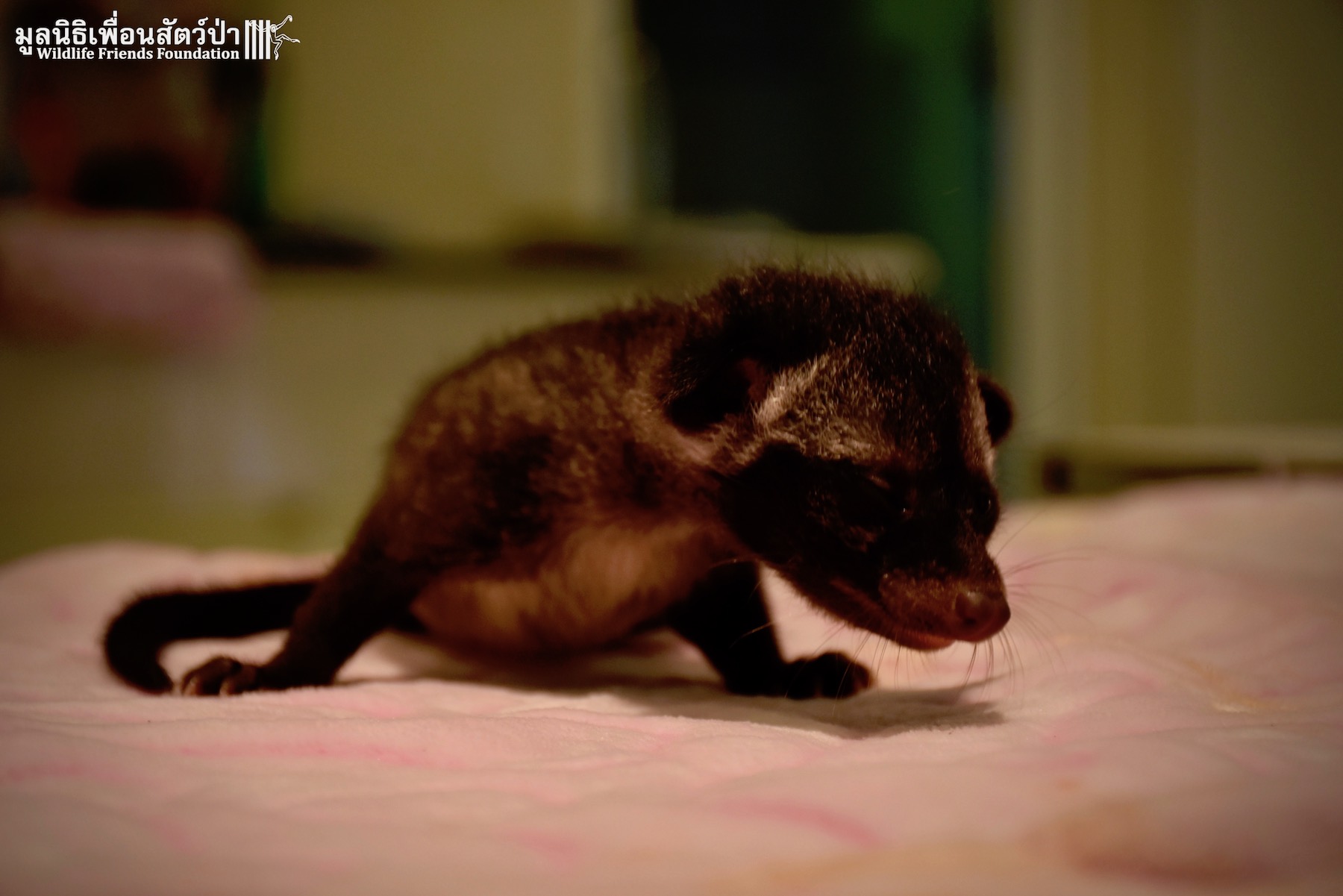 A few days ago we received a call from a member of the public who had found a very young common palm civet (Paradoxurus hermaphroditus) on the ground under a tree screaming, the little kitten was covered in ants. He picked up the kitten and cleared the ants away, unfortunately its mother was no where to be seen, the man then called us to help. The WFFT Rescue Team headed out straight away to collect this little one, she was found about 1-hour south of the WFFT Wildlife Rescue Centre. The team collected her and brought her directly back to WFFT.