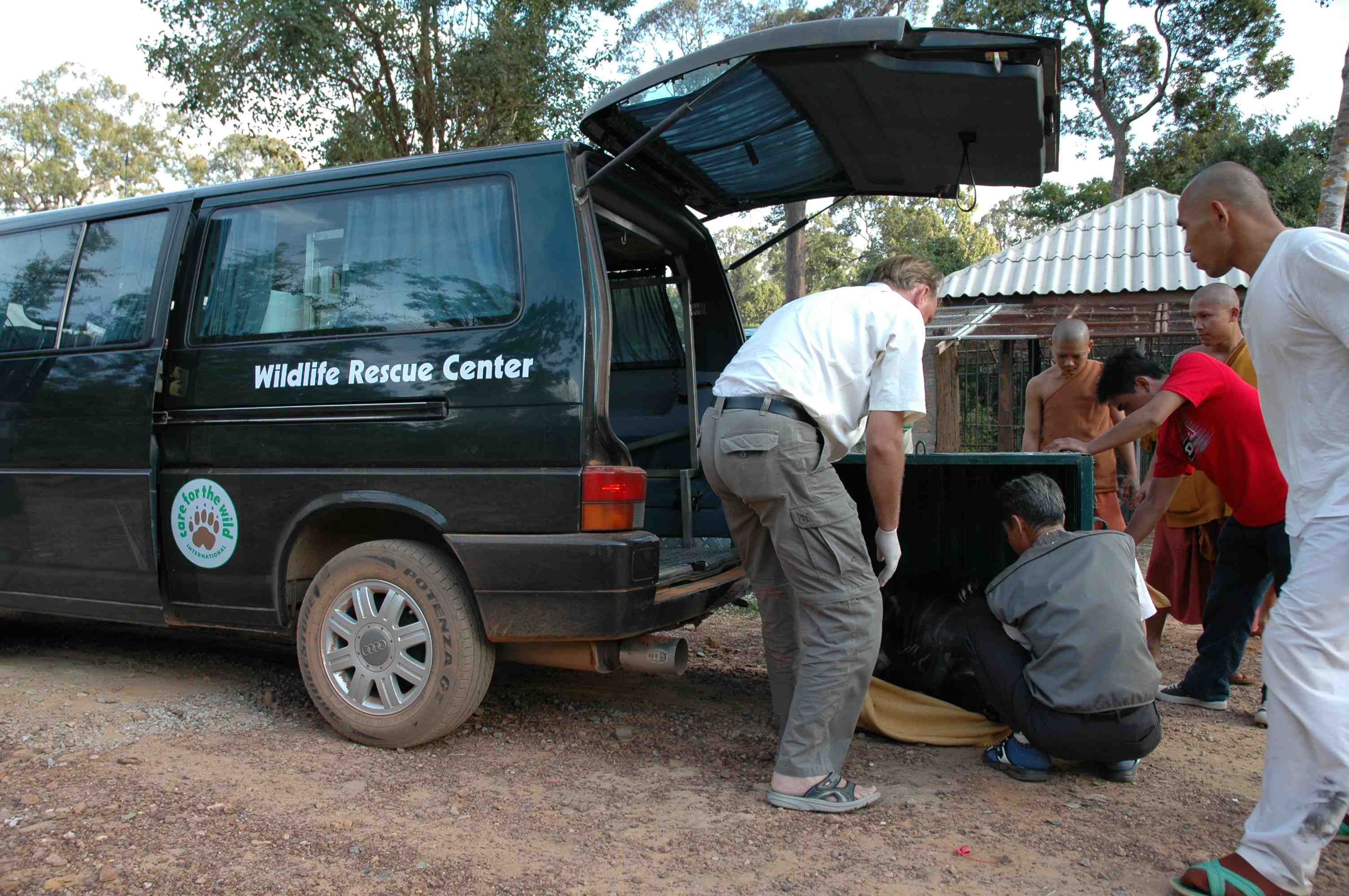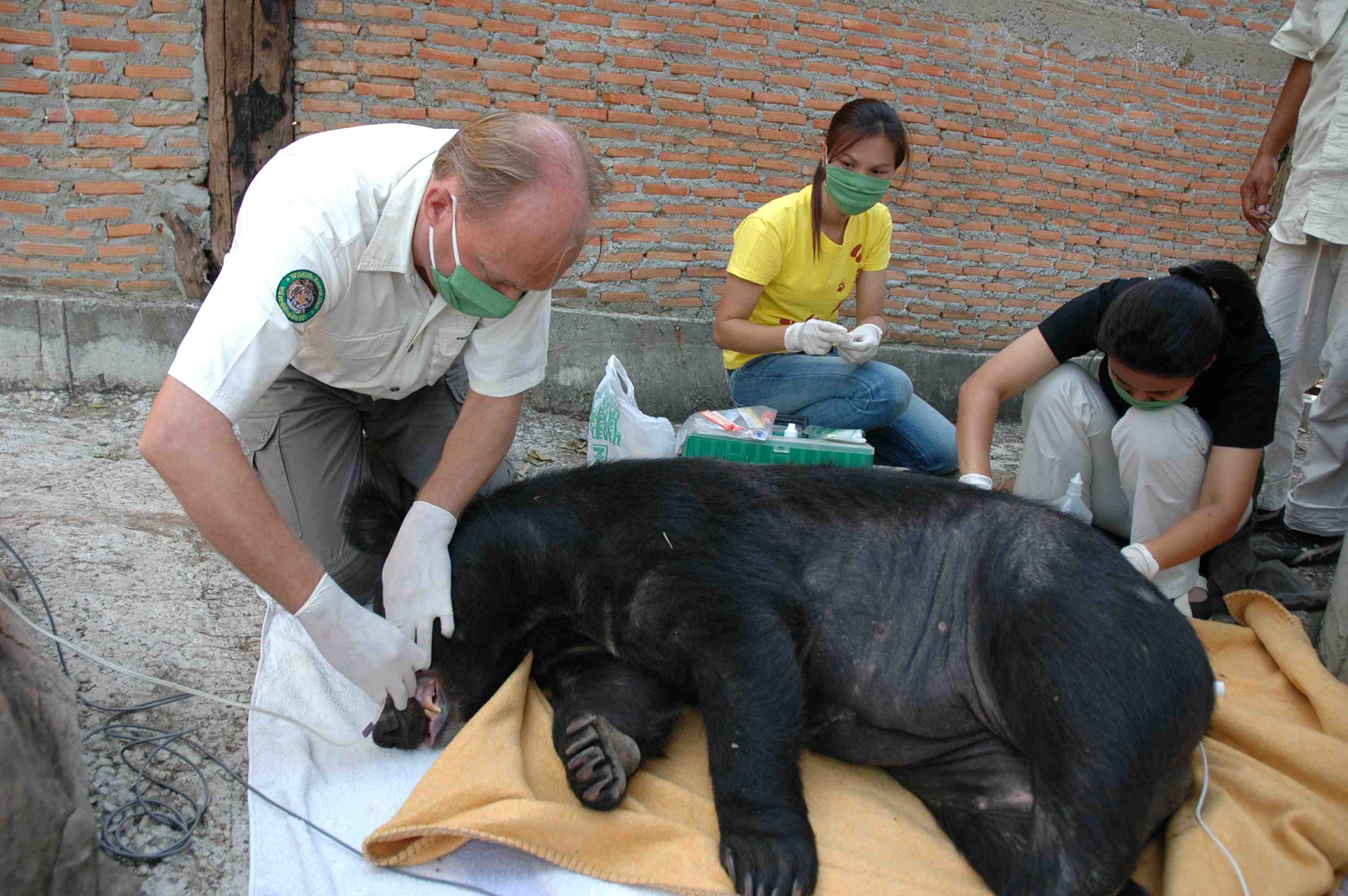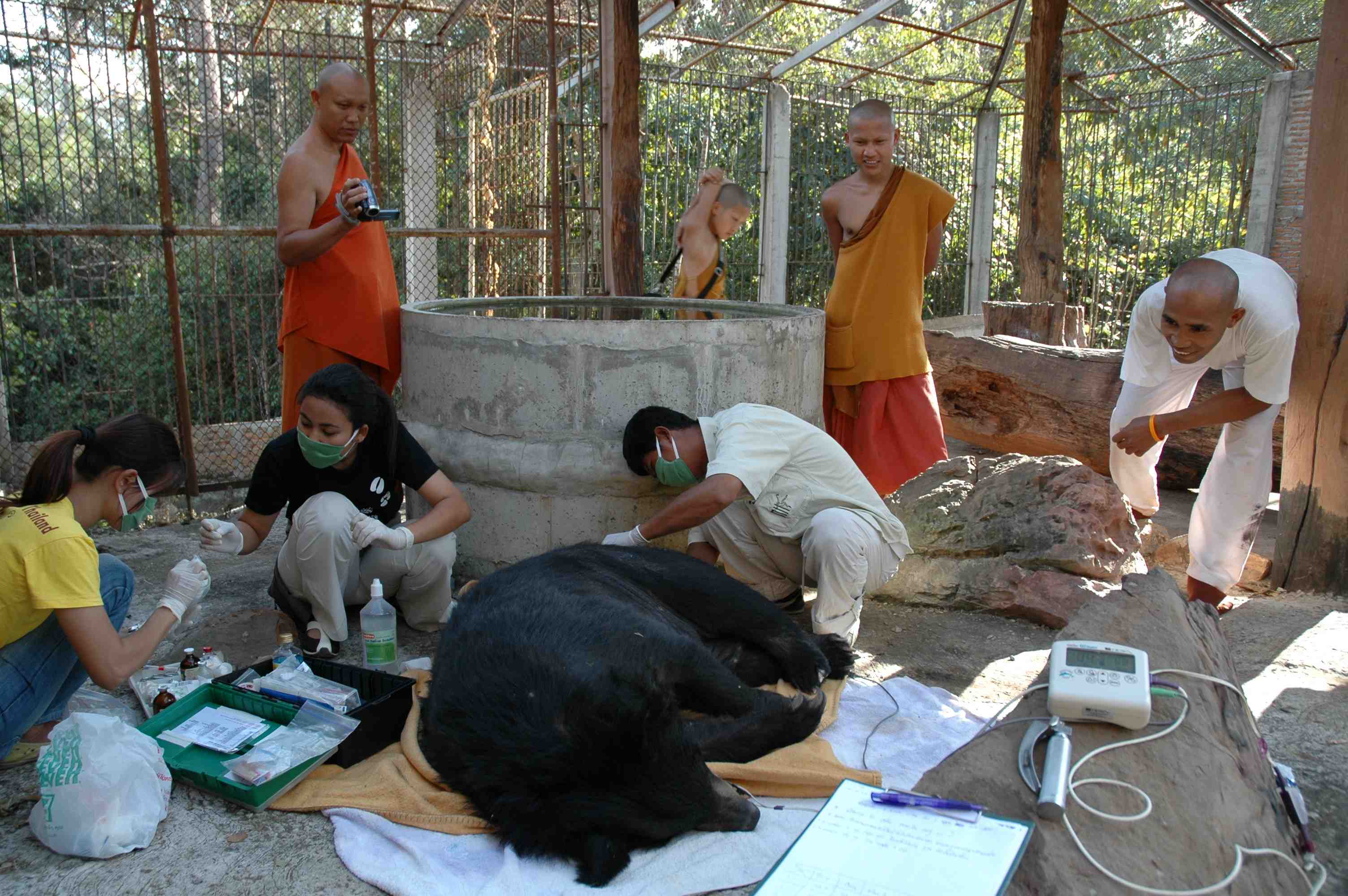 The Wildlife Friends Mobile Clinic funded by “Care for the Wild International” responded to another emergency last week. This time it was a 10 year old Asiatic black bear who has been living alone in a large cage for 7 years at a Buddhist temple in Korat. The bear was moved from another temple where her previous owners, who kept her in their house, had given her up when she became too big.