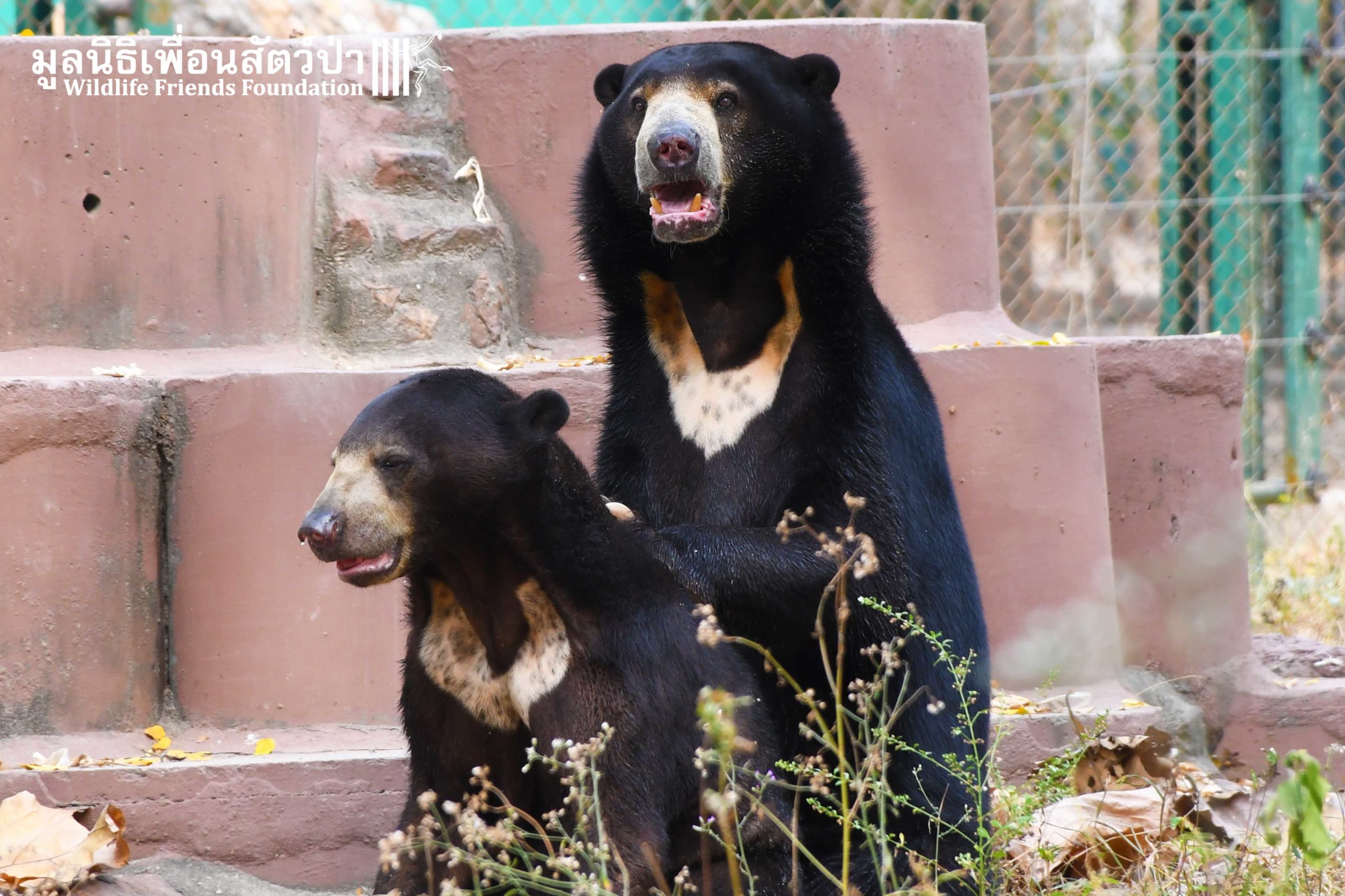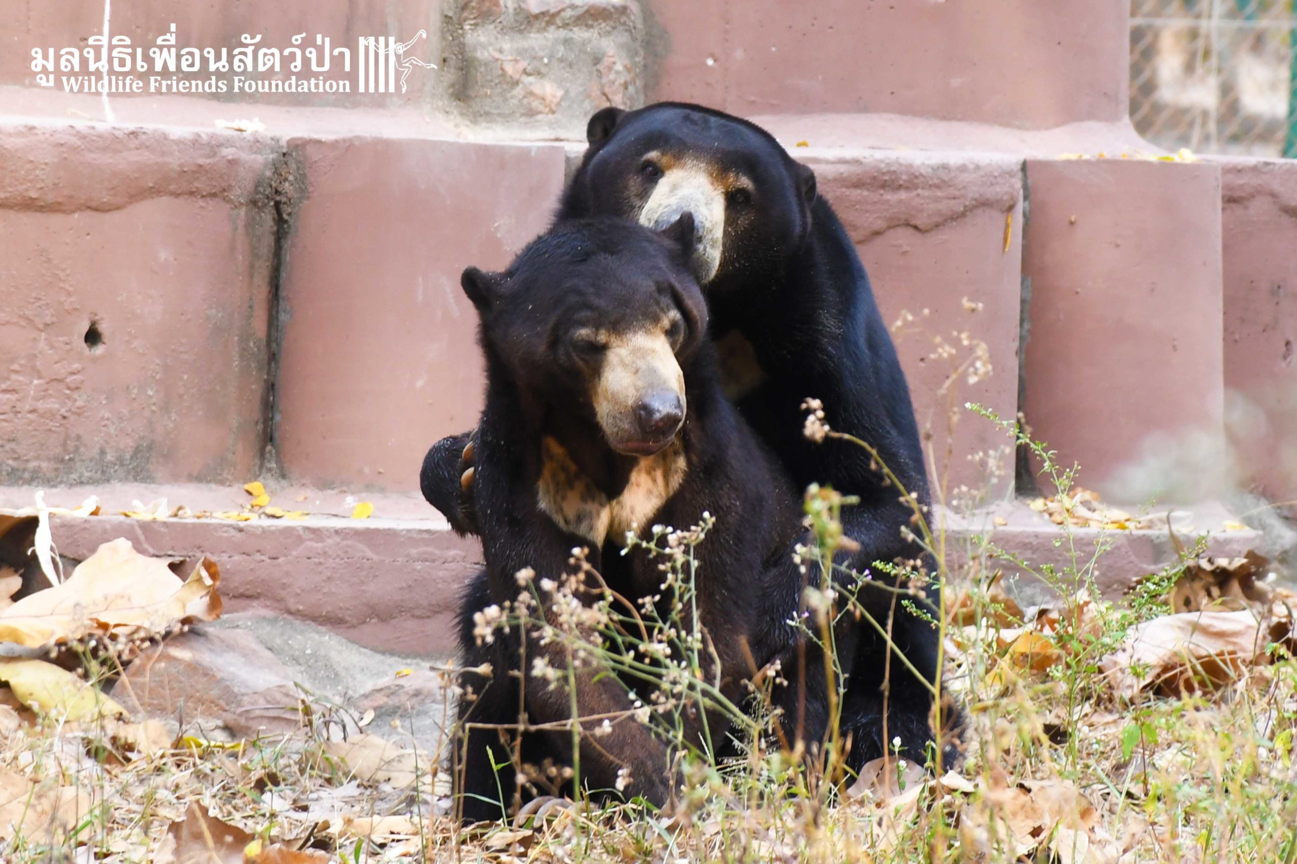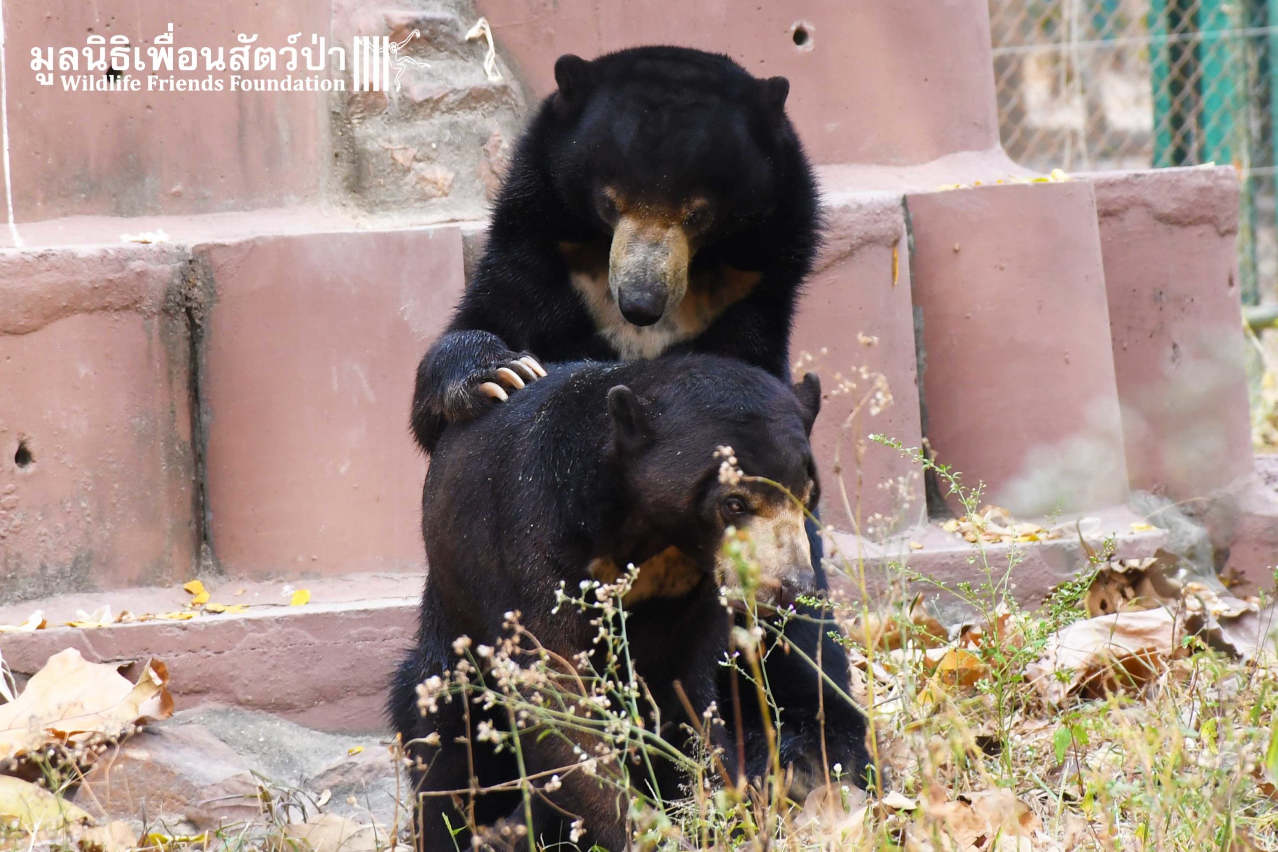 Back in 2009, we rescued a young male Malayan Sun Bear named “Dodo” from a very small filthy cage at a pig farm in Ratchaburi. After he settled to his new life at WFFT, we introduced him to another recently rescued bear, Deena. Deena was rescued in 2010, she was found being kept in a tiny 3m x 3m cage behind a house in Southern Thailand.