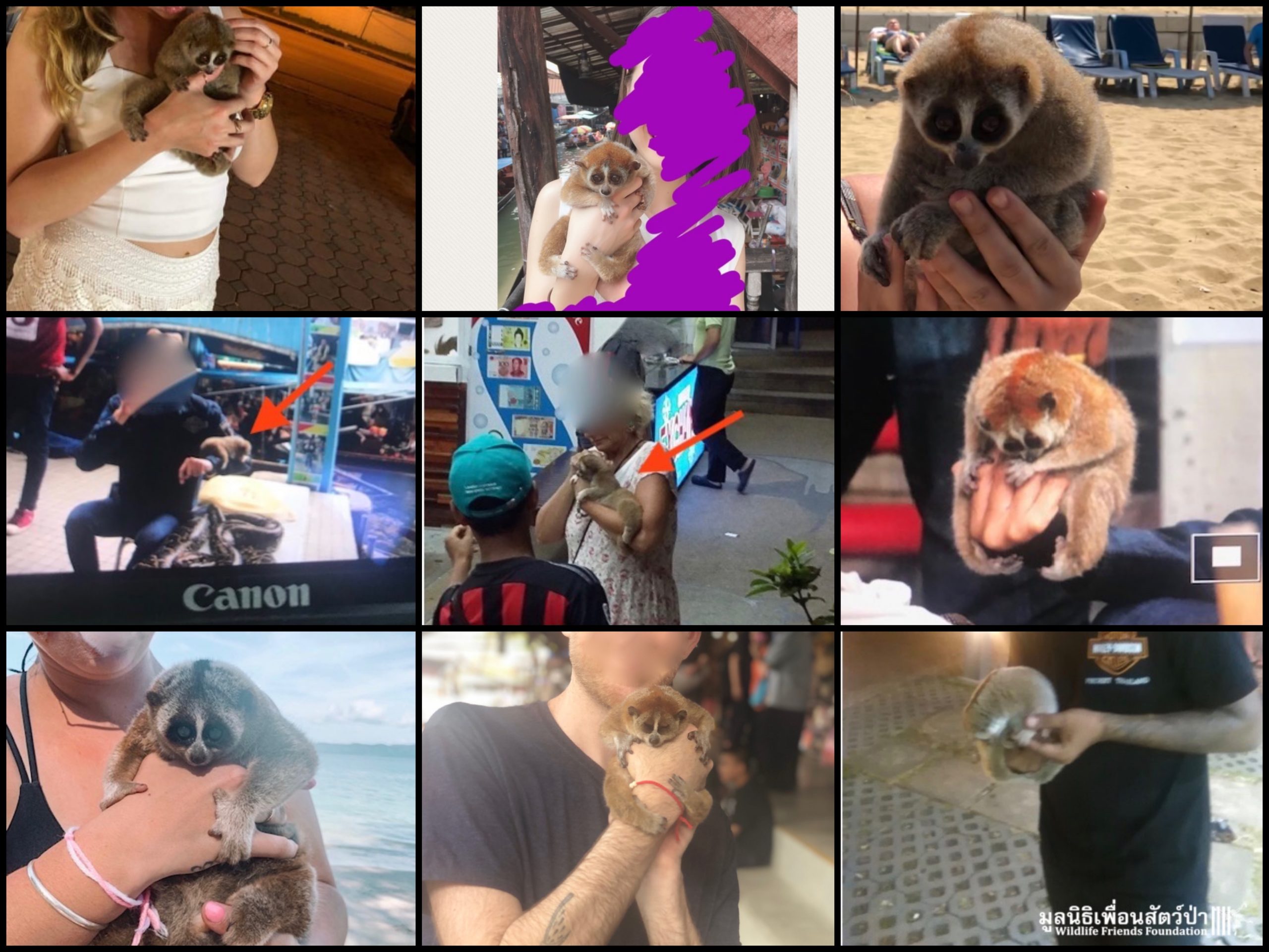 ทุกสัปดาห์จะมีประชาชนติดต่อ สอบถามมายังมูลนิธิเพื่อนสัตว์ป่า ว่าพบเห็นการนำ “ลิงลม” มาถ่ายรูปกับนักท่องเที่ยวอย่างผิดกฎหมาย รูปภาพเหล่านี้คือสิ่งที่ประชาชนส่งมายังมูลนิธิ พร้อมกับคำถามที่ว่า เราจะช่วยสัตว์เหล่านี้ได้อย่างไร สถานที่ที่คุ้นชินตามากที่สุดคงหนีไม่พ้นตลาดน้ำดำเนินสะดวก จ.ราชบุรี หาดเฉวง เกาะสมุย จ.สุราษฎร์ธานี และ หาดกะตะ กะรน จ.ภูเก็ต