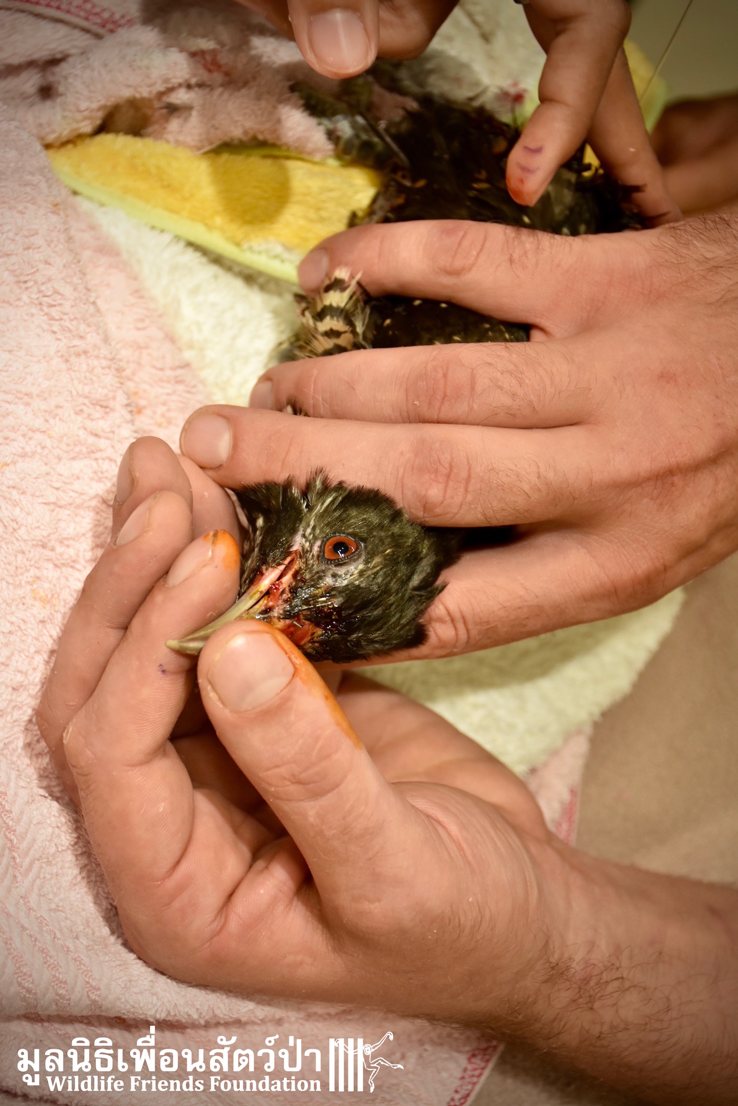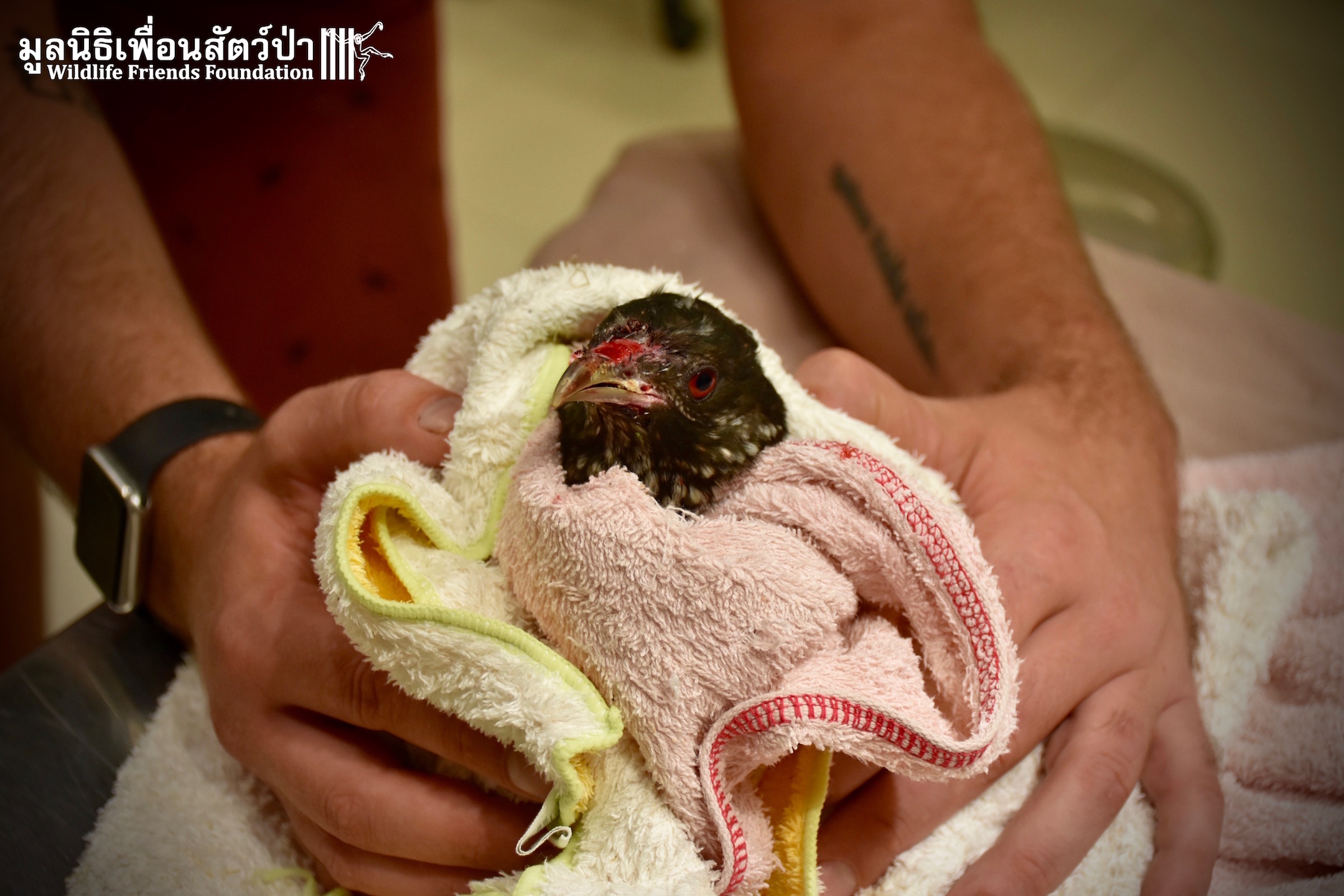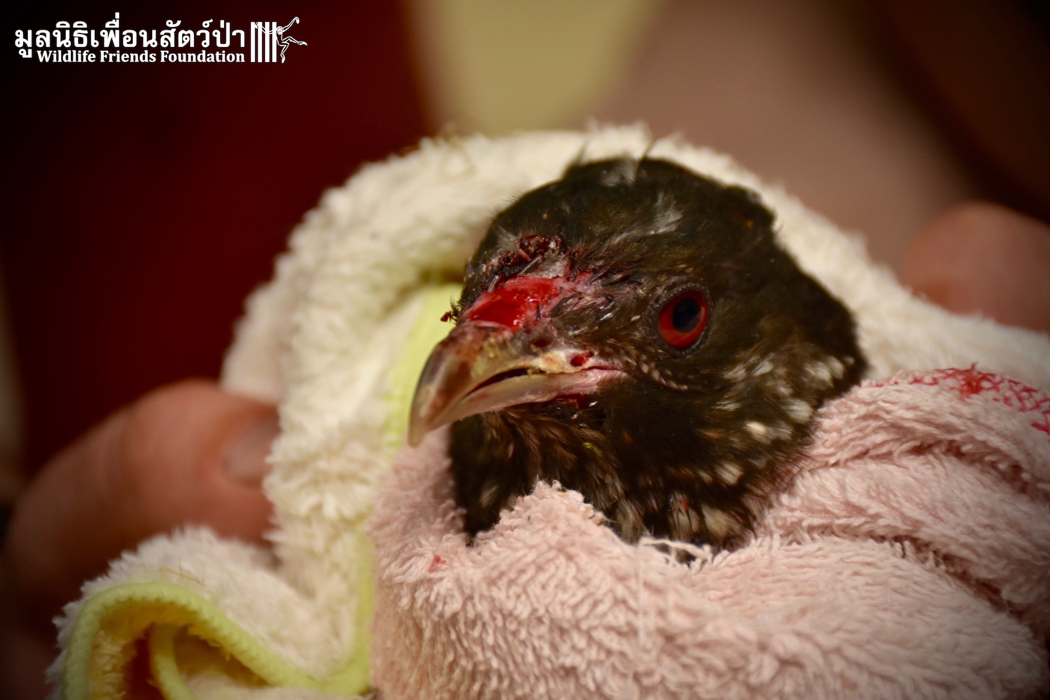 Meet ‘Coaly’ the Asian koel (Eudynamys scolopaceus malayana), he was brought into the Wildlife Friends Foundation Wildlife Thailand Rescue Centre last week after the lady that had ‘rescued’ him, as a very small chick had decided she could not provide him with proper care. After spending the first months of his very short life in a small unsuitable bird cage he has sustained various injuries to wing and tail feathers.