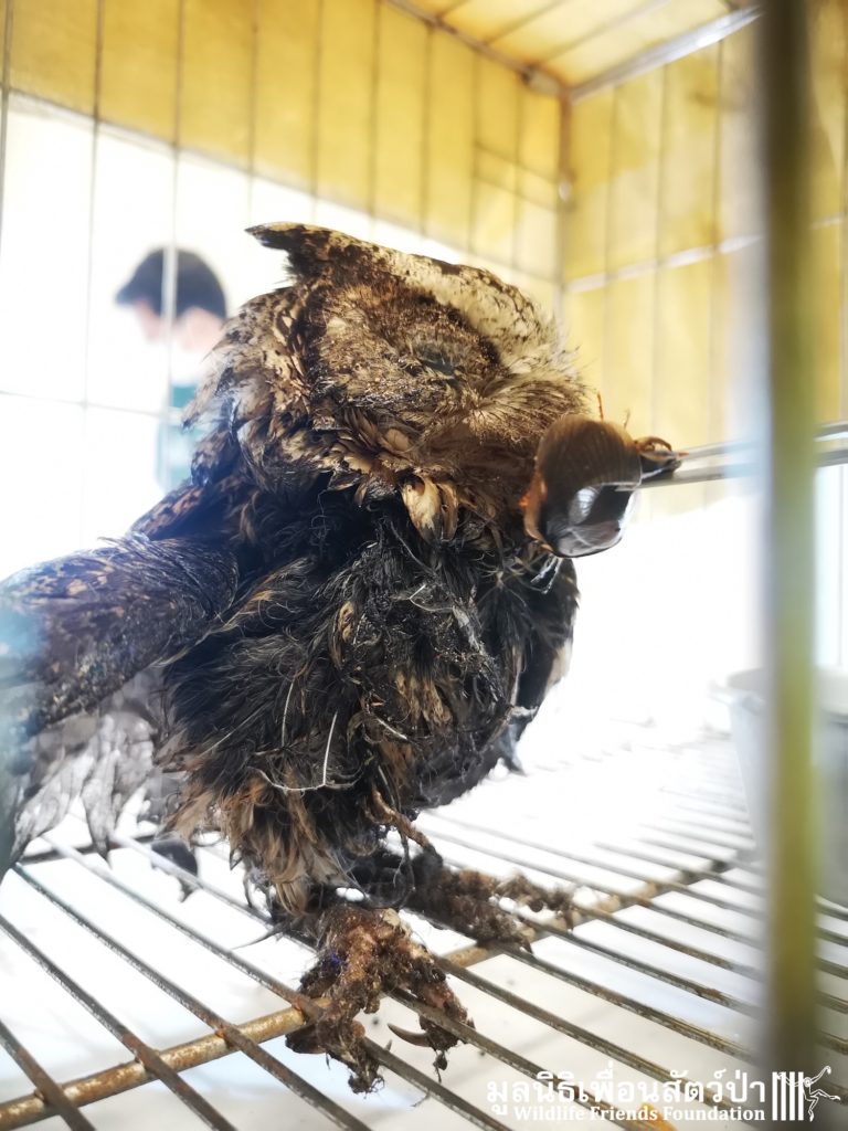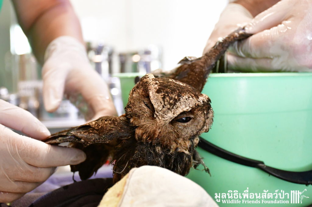 These owls range in age from just days old to those on the brink of adulthood. Some came from a concerned local who found them at a night market. Others were found in backyards and on the side of the road. One came in covered in road tar! We washed it first with vegetable oil to dissolve the tar, and then soapy water to remove the oil. This one passed away unfortunately.
