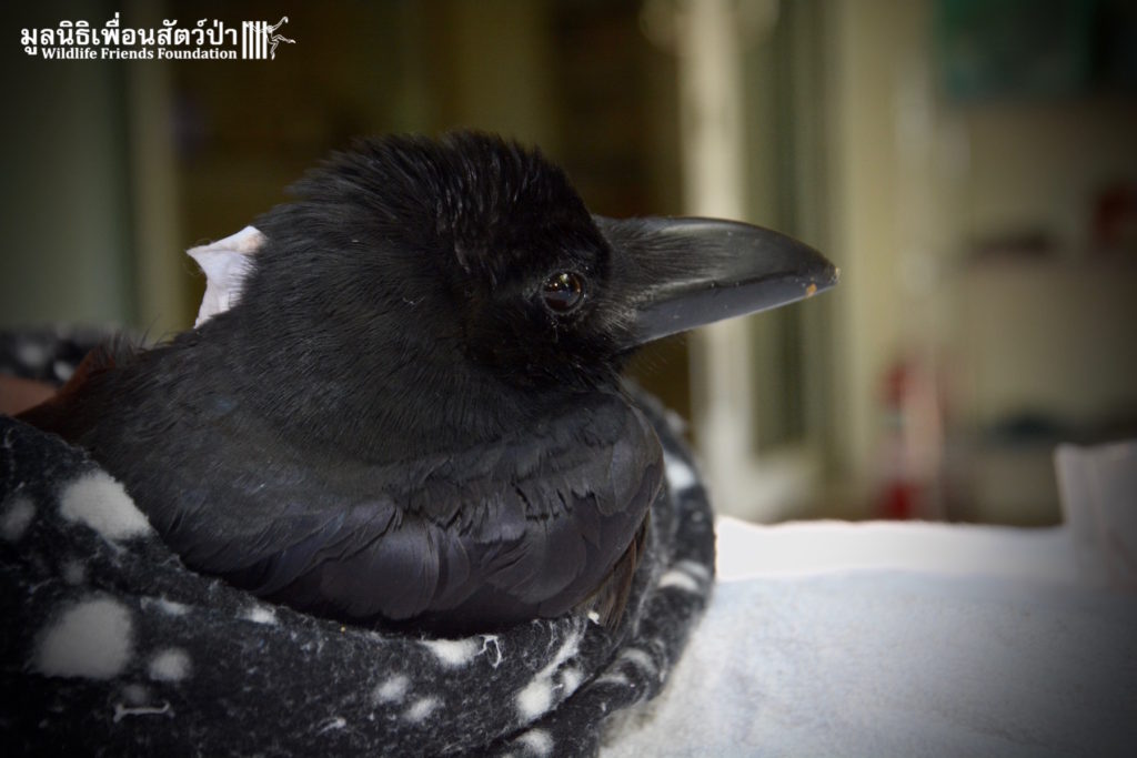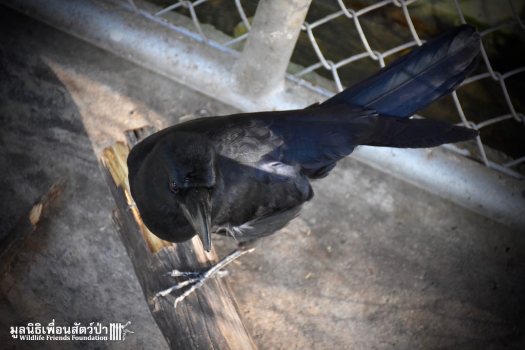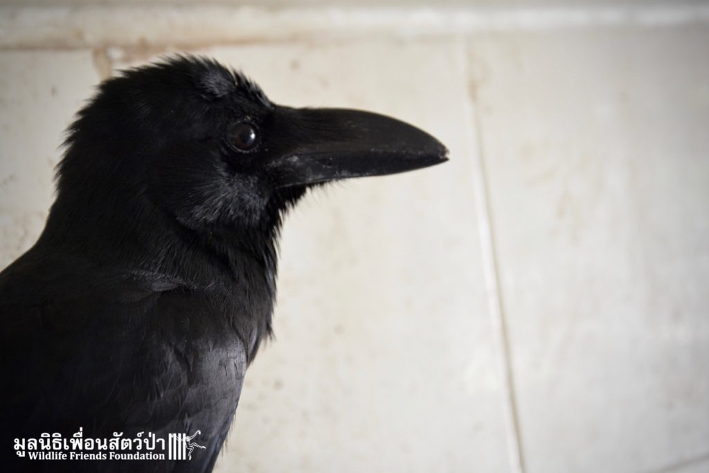 Meet ‘Chao Guay’ a jungle crow (Corvus macrorhynchos) that was brought into the WFFT Wildlife Hospital from another animal hospital in Bangkok. He was initially found in Bangkok by some concerned locals on the floor under a tree. They took him to a veterinary clinic and it was found that he had badly injured wing that could not be mended, so it was decided that amputating his wind was the best thing. The people that found him wanted to find a suitable permanent refuge for him so they brought him to us.