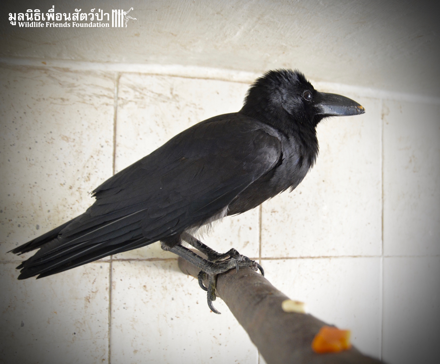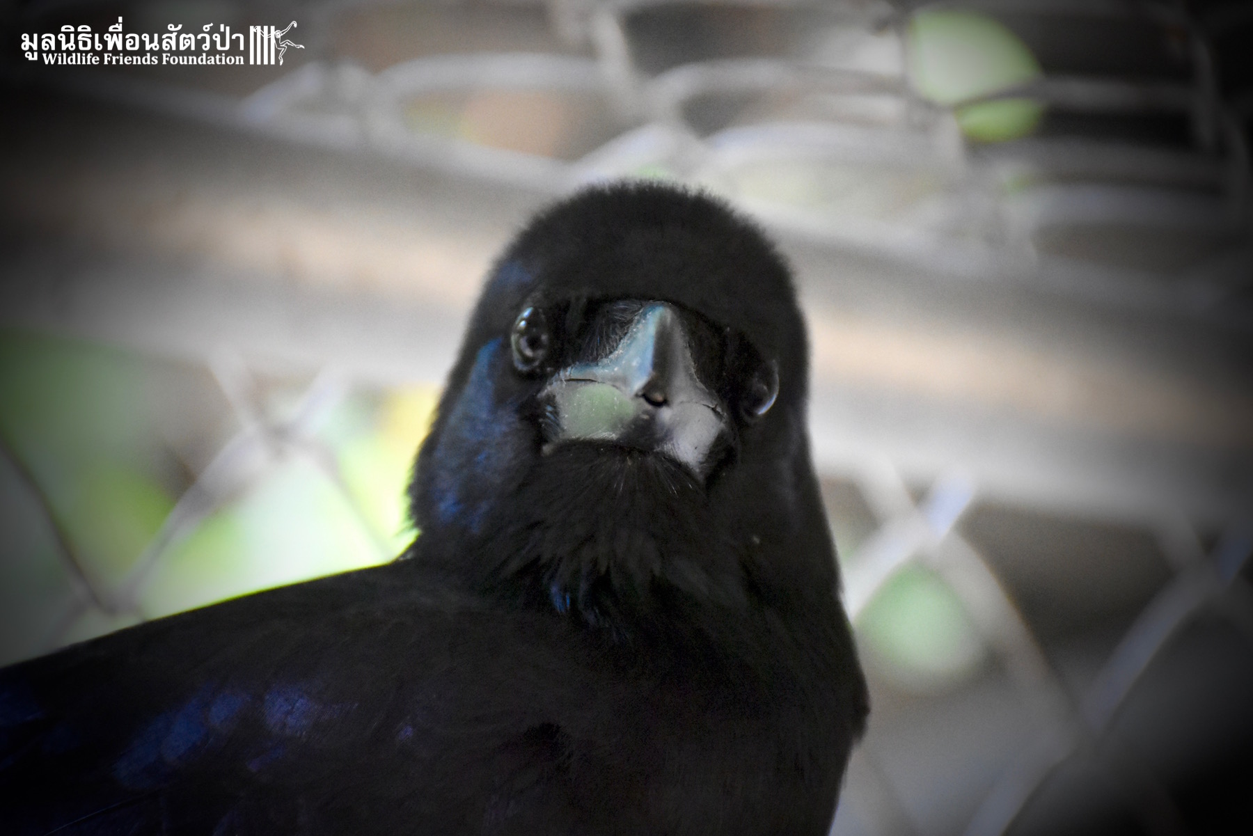Meet ‘Chao Guay’ a jungle crow (Corvus macrorhynchos) that was brought into the WFFT Wildlife Hospital from another animal hospital in Bangkok. He was initially found in Bangkok by some concerned locals on the floor under a tree. They took him to a veterinary clinic and it was found that he had badly injured wing that could not be mended, so it was decided that amputating his wind was the best thing. The people that found him wanted to find a suitable permanent refuge for him so they brought him to us.