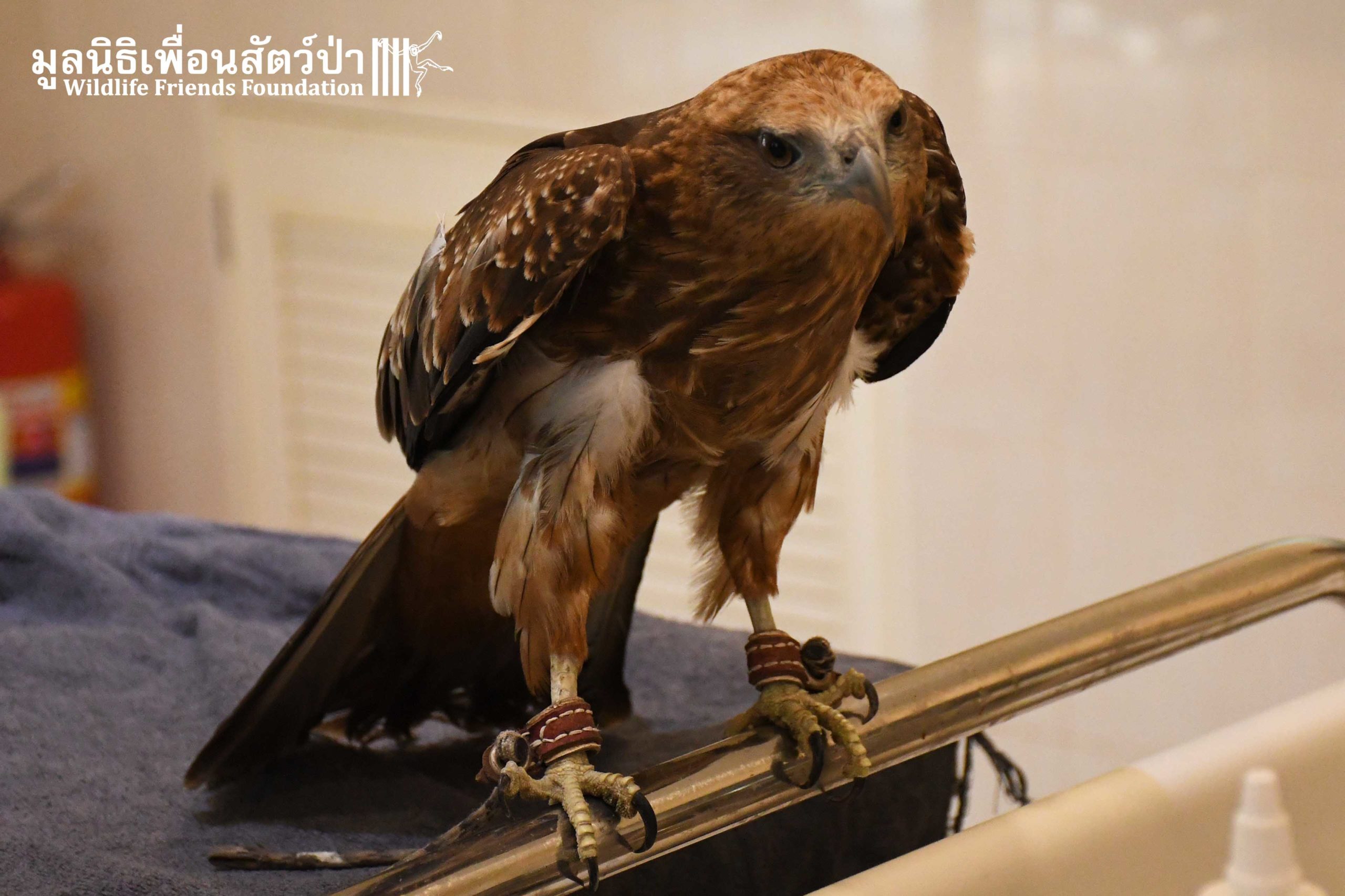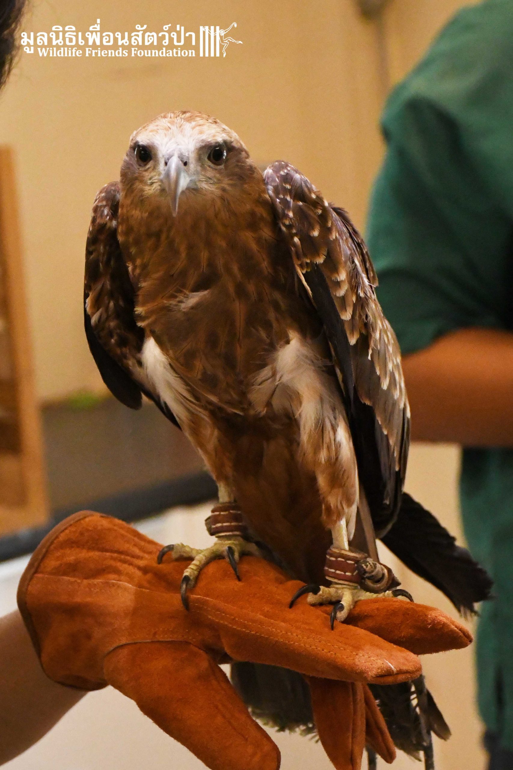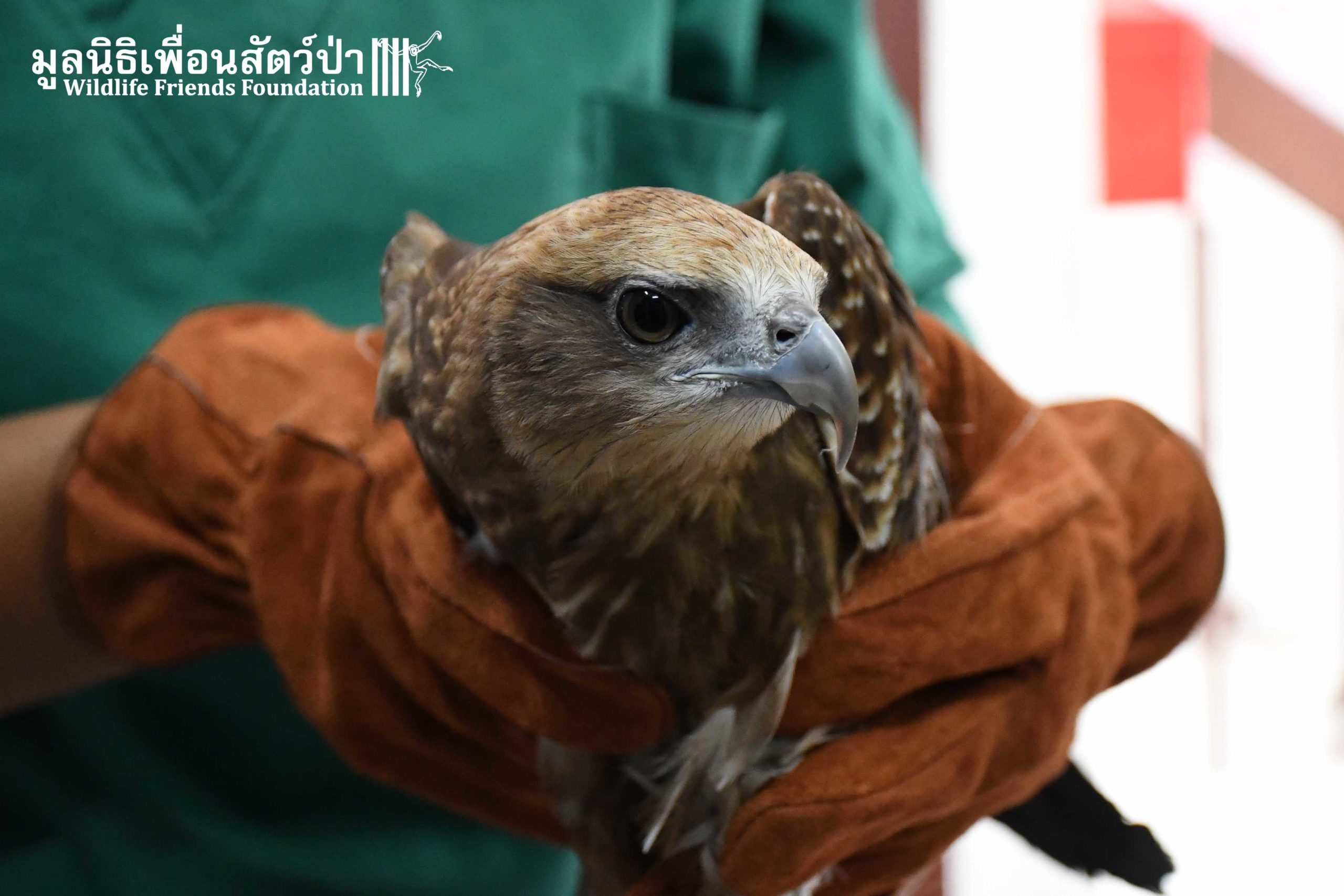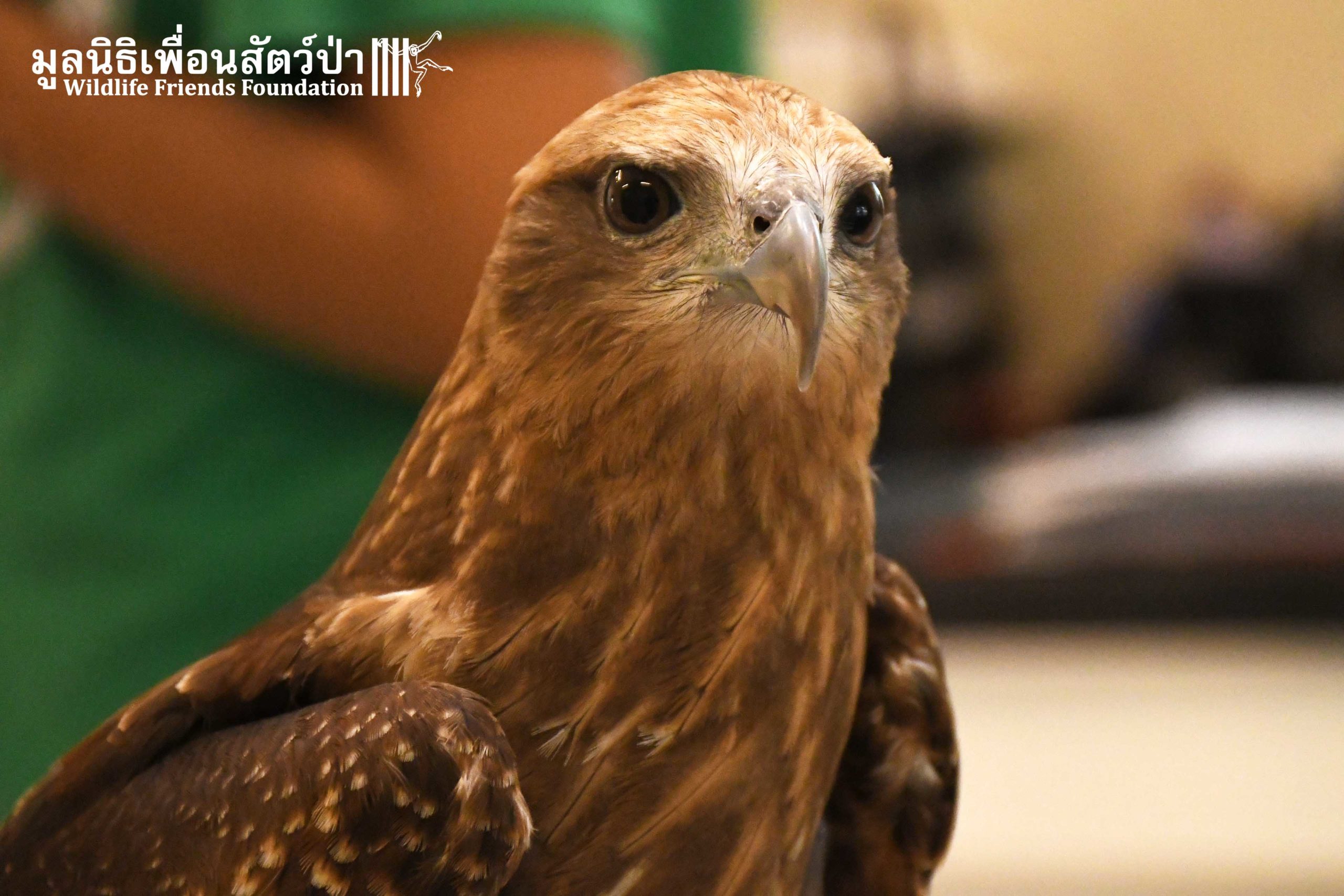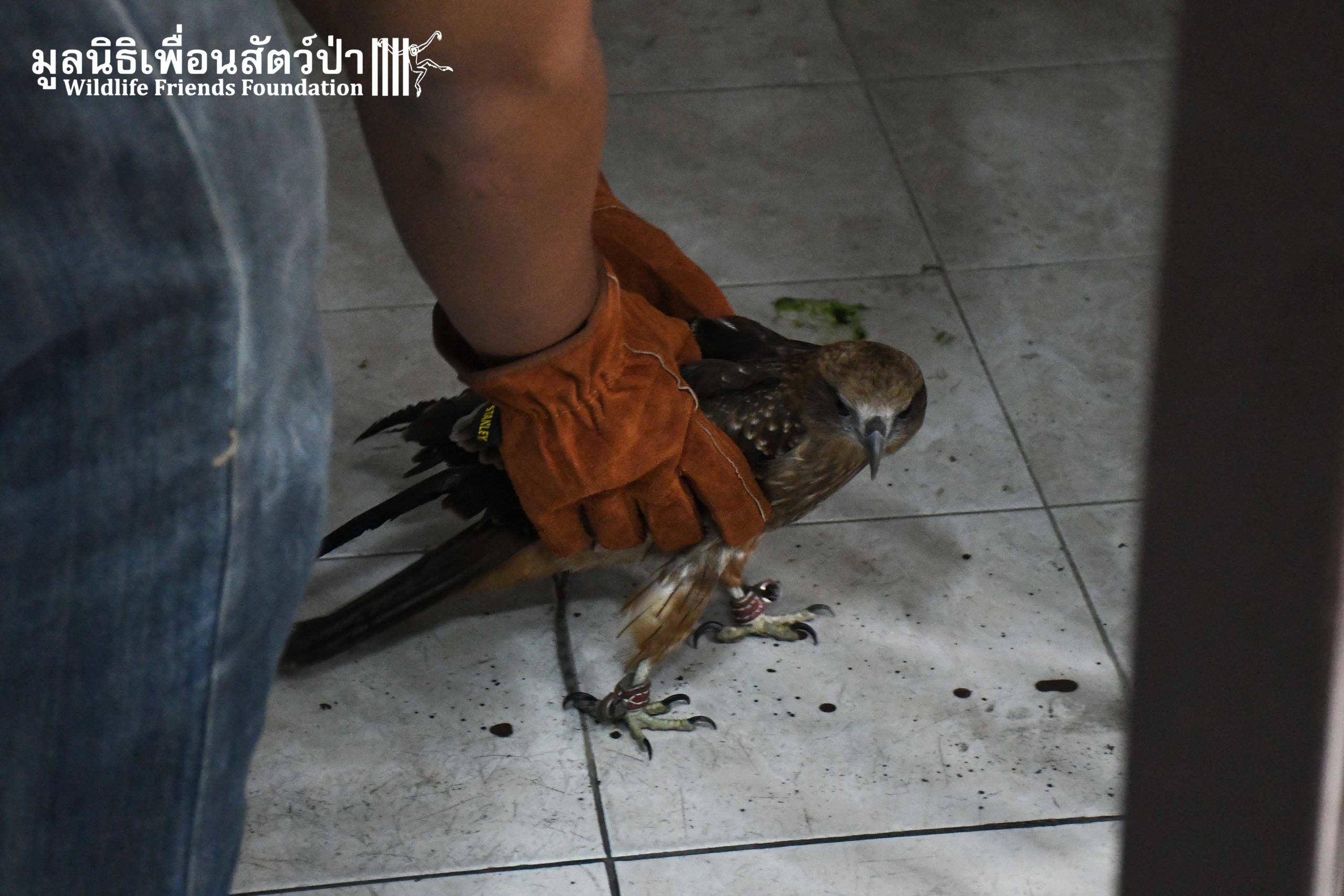 We received a phone call that a juvenile brahminy kite was found wandering around in the city of Petchaburi and had been captured by the Phetchaburi Police Department. Our mobile rescue team immediately went to see what could be done.