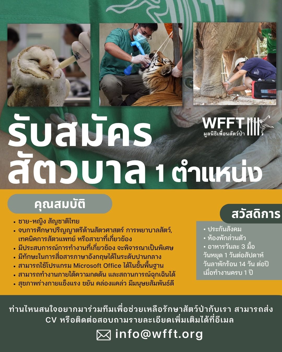 มูลนิธิเพื่อนสัตว์ป่า จ.เพชรบุรี เปิดรับสมัคร เจ้าหน้าที่ตำแหน่ง สัตวศาสตร์ ,สัตวบาล (ผู้ช่วยสัตวแพทย์) เพศชาย จำนวน 1 อัตรา