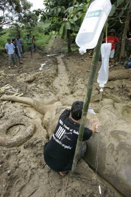 Even Wild elephants need help at some times. The wild elephant found in Chanthaburi province in June 2006 was found in a mud pool and was not able to get up on its legs. For 7 days the team with the Mobile Wildlife Clinic cared for the elephant and fed him. He died unfortunately as he still could not get up on his feet after that long. The Van could not get closer than 2 kilometers from the elephant as it is not a four-wheel drive vehicle.