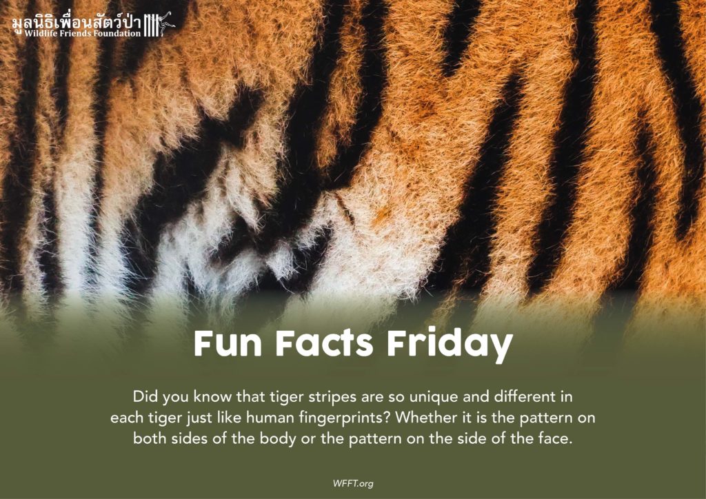 ทราบไหมครับว่าลายของเสือเเต่ละตัวนั้นไม่ซ้ำกันเลยแม้แต่ตัวเดียว ไม่ว่าจะเป็นลายทั้งสองข้างของลำตัวและลวดลายด้านข้างของใบหน้าซึ่งทำให้เเต่ละตัวนั้นมีเอกลักษณ์ที่เเตกต่างกันออกไป เปรียบเทียบได้เหมือนกันกับลายนิ้วมือของคน