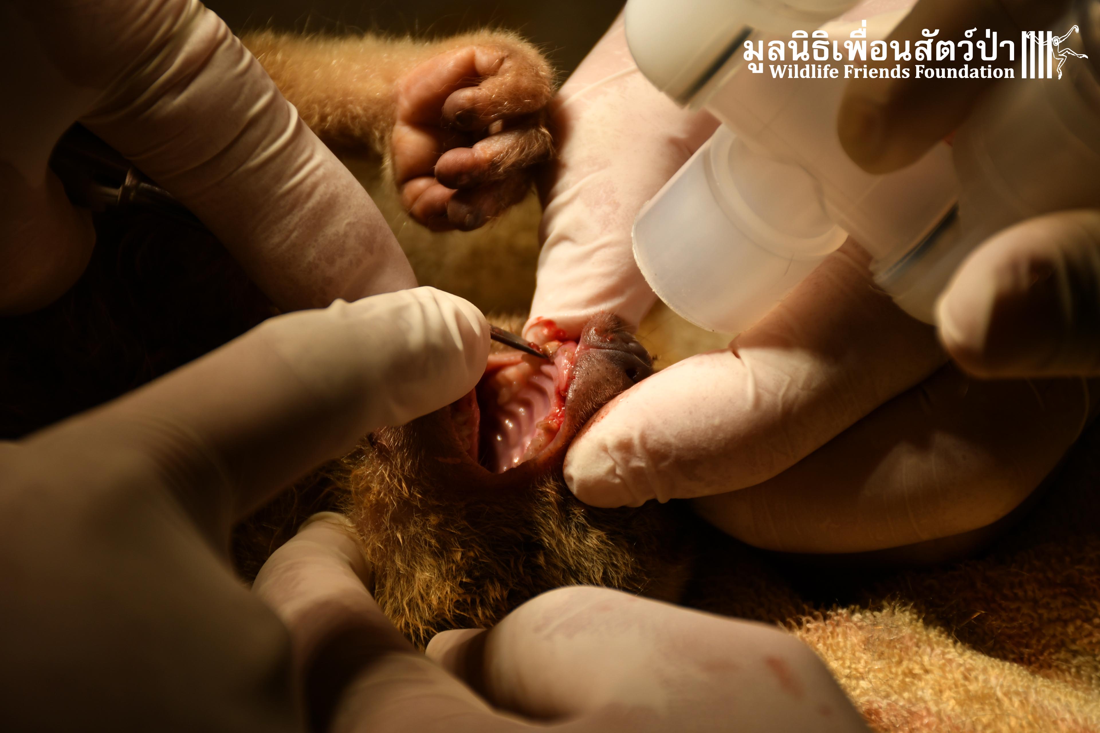 ทีมสัตว์เเพทย์ได้ตรวจสอบสุขภาพพบว่ามีฝันผุที่ปากบน 2 ซี่เเละล่างจำนวน 2 ซี่