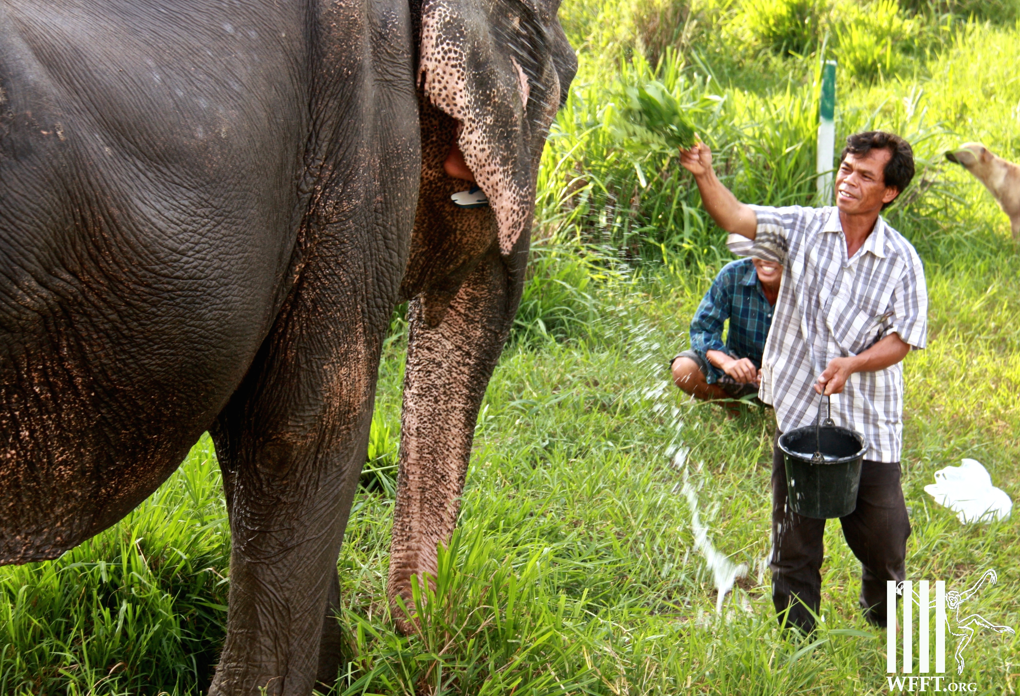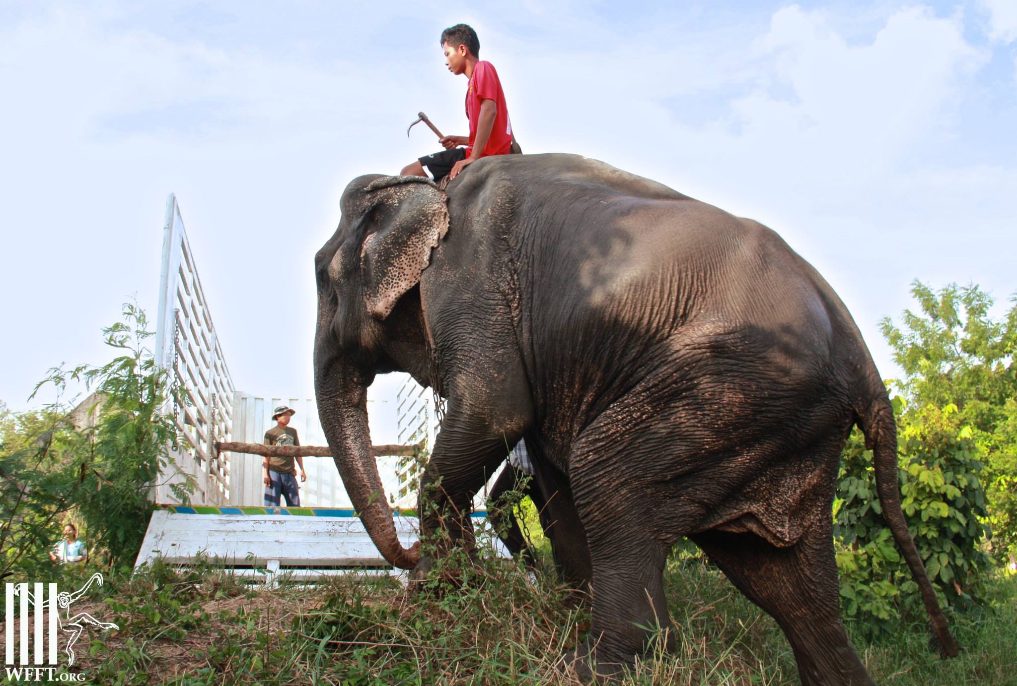 Boon Chuey will be on chains for a few more days at WFFT to get used to her new surroundings and the fencing. She will be however walking free during the day from the first day on and join the other elephants at the open wild enclosure within 2 weeks. No more chains, no more work, we hope she will spend a lot of happy years at WFFT.