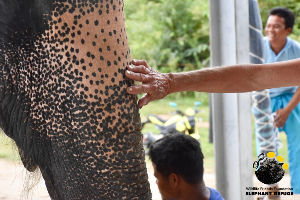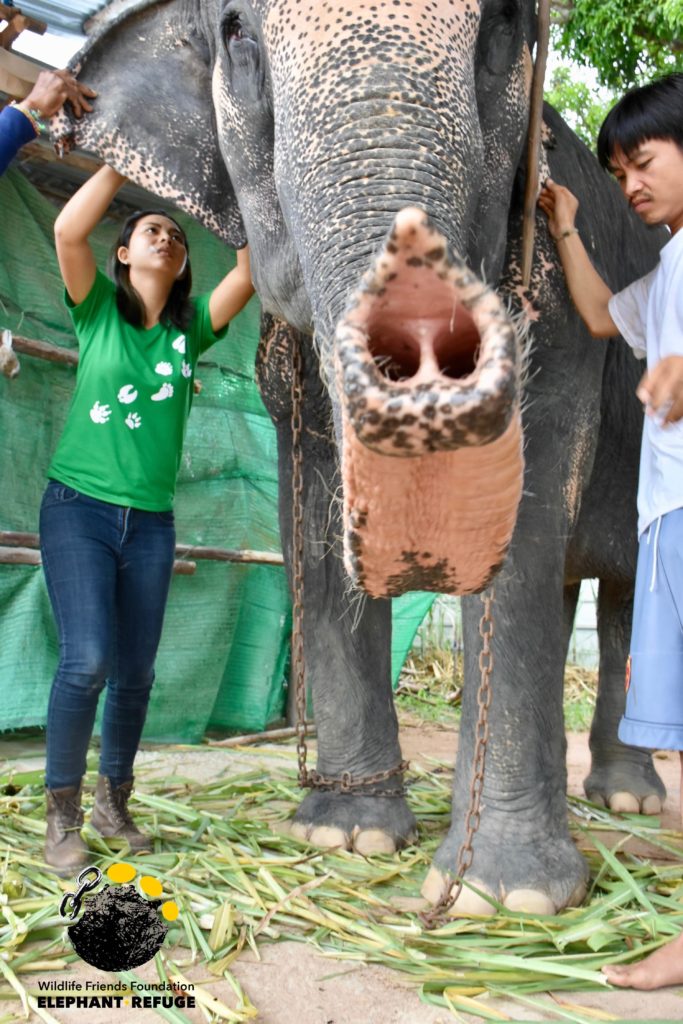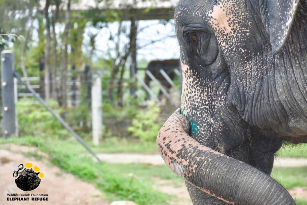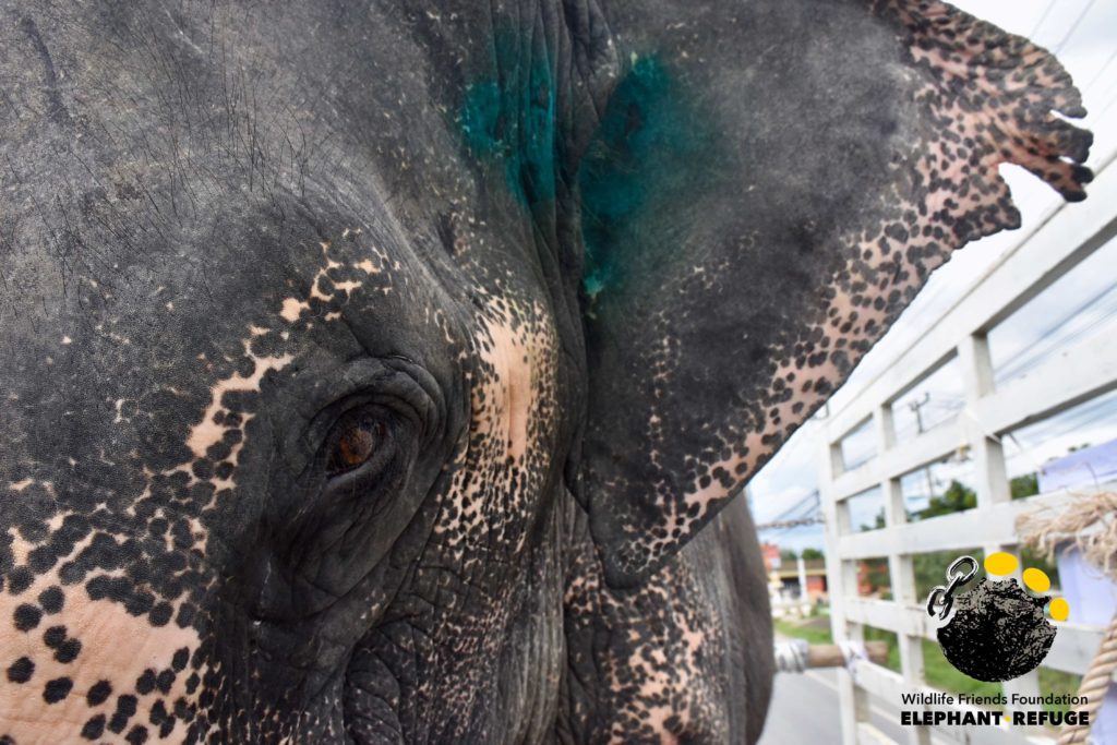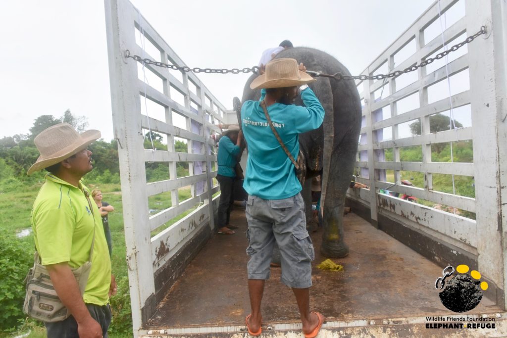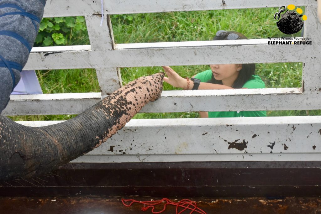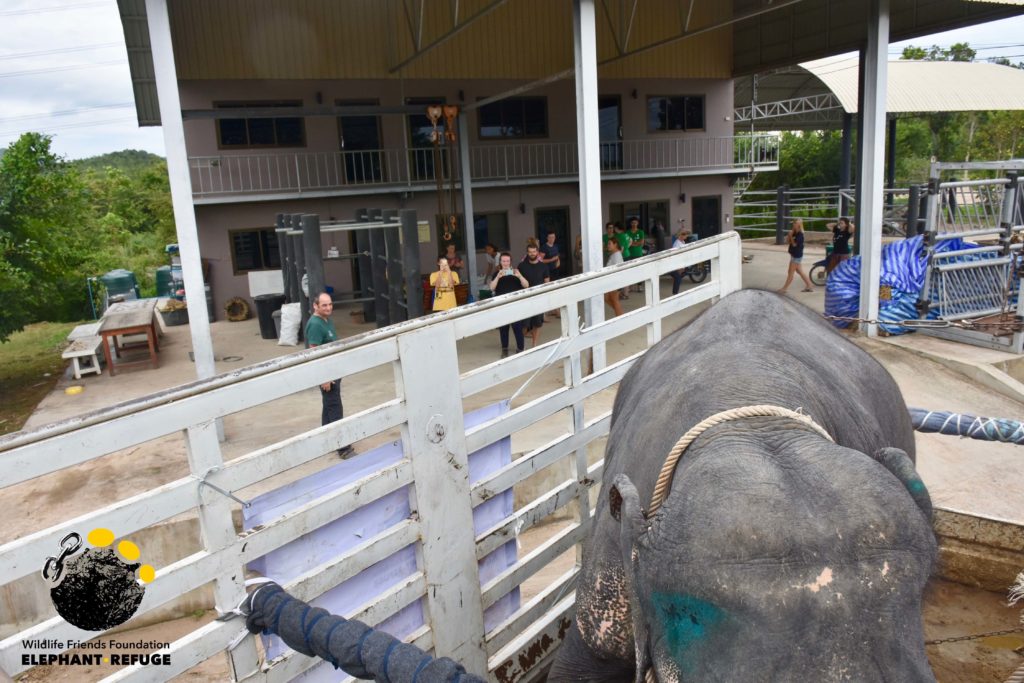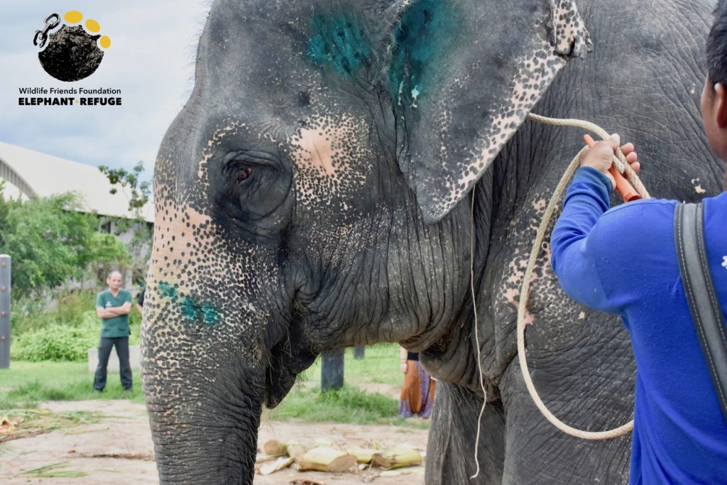 Yesterday the WFFT Elephant Refuge welcomed another new soul to the herd. Boon Dee is half blind and has been rescued from a trekking camp in Pattaya. The rescue was made possible by the generous support of Joan Pearson who is again visiting WFFT from Australia. The difference with this visit is that for the first time Joan came alone. Normally she brings a group of sponsors from Australia and spends her time here making sure they have a great time. This time we managed to convince her to come alone and allow the whole WFFT team to look after her for a change. Joan was celebrating a significant birthday and didn’t want a big fuss made back in Sydney. Instead she wanted to spend it in her favourite place in the world surrounded by the animals she loves. Joan’s only wish for a present was to be able to rescue another elephant. When we learned that there was an elephant in need of rescue in Pattaya the team including Joan headed out to investigate. It was love at first sight. Having arrived at the camp four years ago Boon Dee had been in a terrible state. Emaciated and covered in abscesses her owners cried when they first saw the abuse and neglect she had suffered. They took good care of her while they had her and returned her to full health. When they were forced to sell her they didn’t want to run the risk of her falling into the wrong hands again and contacted the WFFT Elephant Refuge team. After completing the necessary paperwork Boon Dee’s owners accompanied her on the long journey back to the centre. They cried again when they saw where she was going to spend the rest of her life, but this time it was tears of joy.