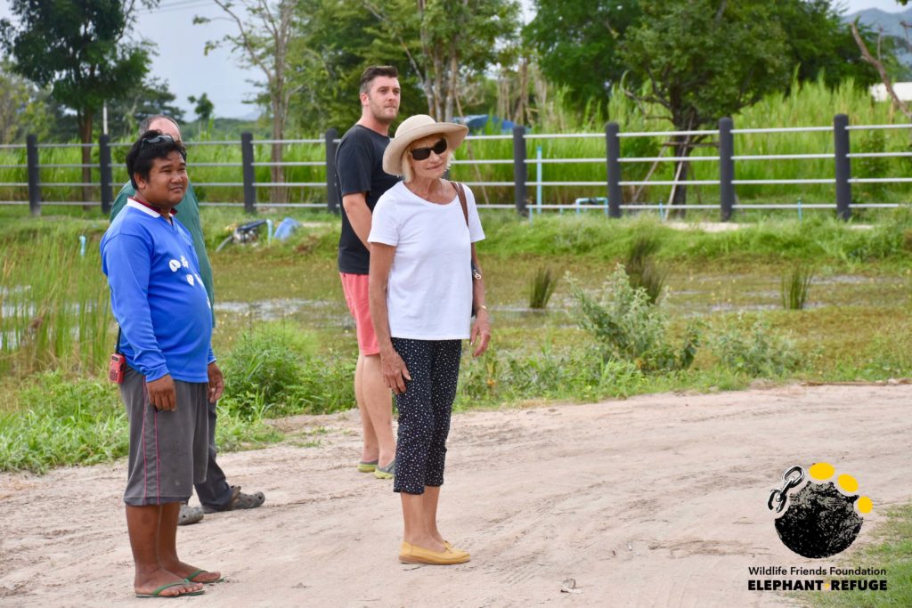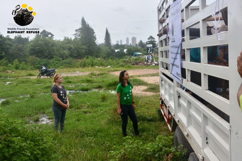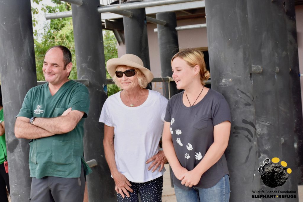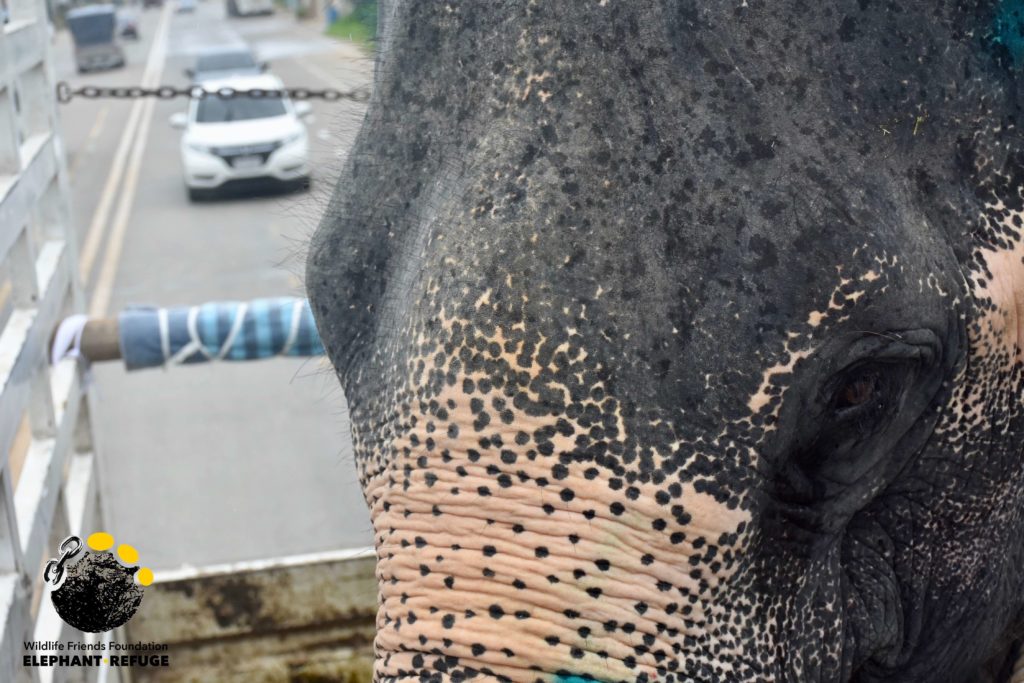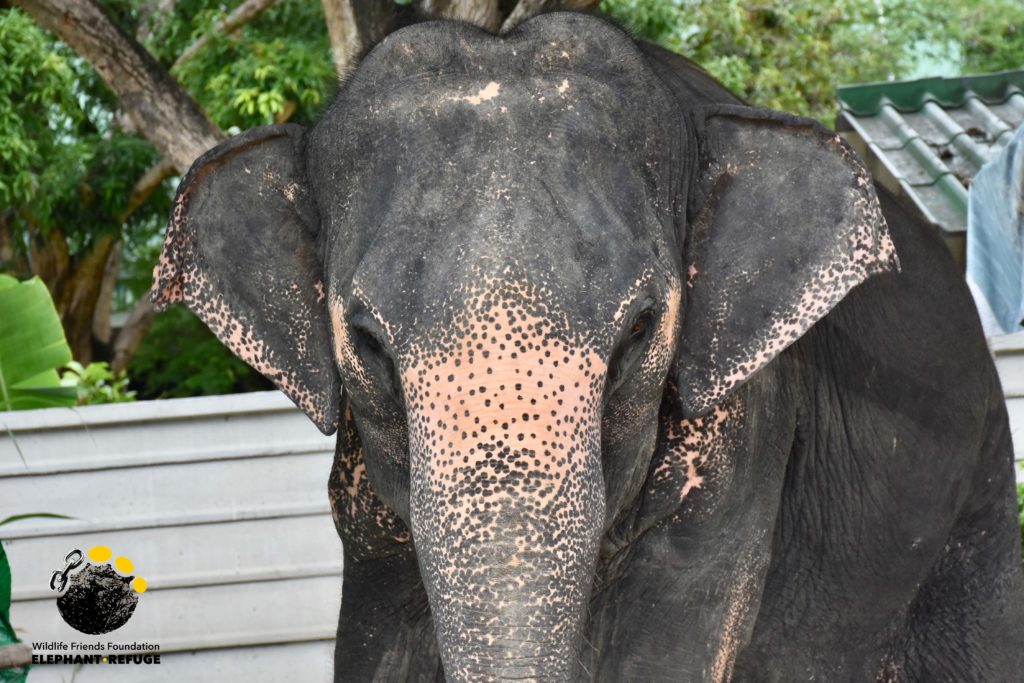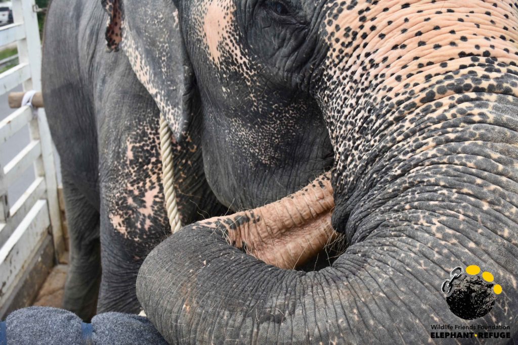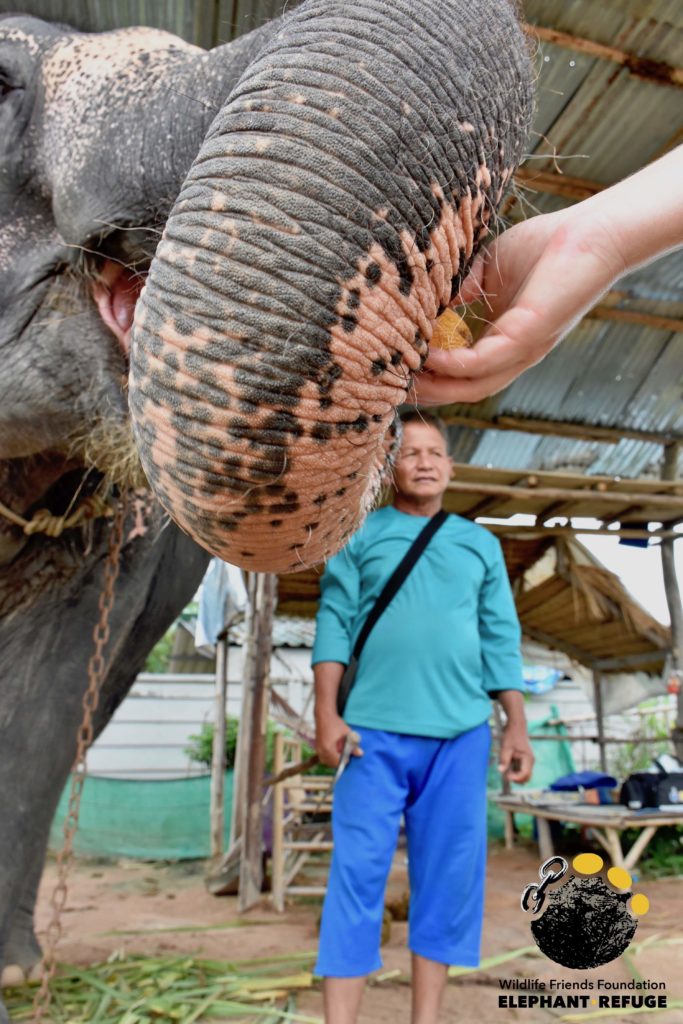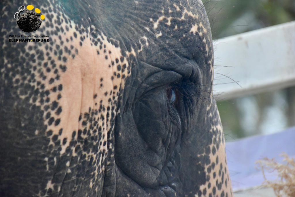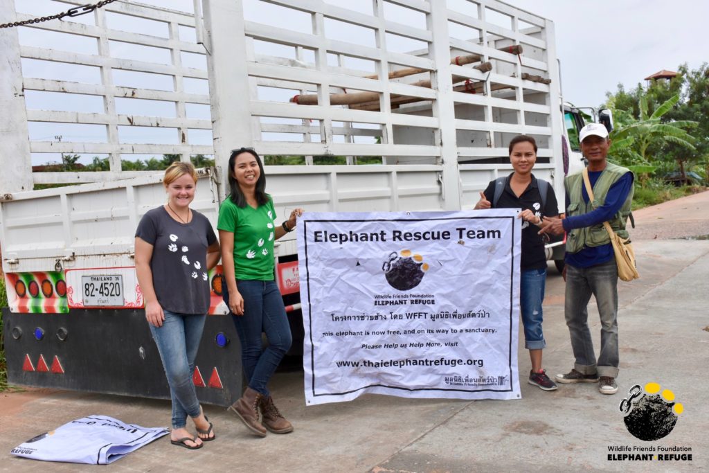 Yesterday the WFFT Elephant Refuge welcomed another new soul to the herd. Boon Dee is half blind and has been rescued from a trekking camp in Pattaya. The rescue was made possible by the generous support of Joan Pearson who is again visiting WFFT from Australia. The difference with this visit is that for the first time Joan came alone. Normally she brings a group of sponsors from Australia and spends her time here making sure they have a great time. This time we managed to convince her to come alone and allow the whole WFFT team to look after her for a change. Joan was celebrating a significant birthday and didn’t want a big fuss made back in Sydney. Instead she wanted to spend it in her favourite place in the world surrounded by the animals she loves. Joan’s only wish for a present was to be able to rescue another elephant. When we learned that there was an elephant in need of rescue in Pattaya the team including Joan headed out to investigate. It was love at first sight. Having arrived at the camp four years ago Boon Dee had been in a terrible state. Emaciated and covered in abscesses her owners cried when they first saw the abuse and neglect she had suffered. They took good care of her while they had her and returned her to full health. When they were forced to sell her they didn’t want to run the risk of her falling into the wrong hands again and contacted the WFFT Elephant Refuge team. After completing the necessary paperwork Boon Dee’s owners accompanied her on the long journey back to the centre. They cried again when they saw where she was going to spend the rest of her life, but this time it was tears of joy.