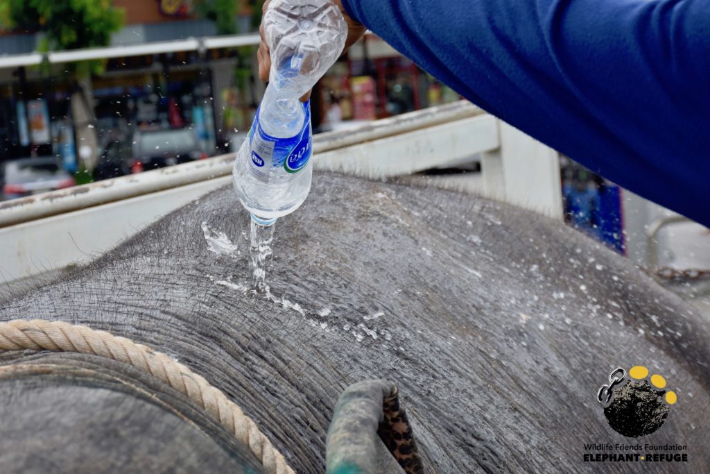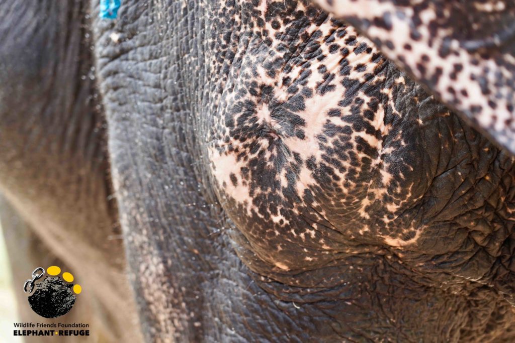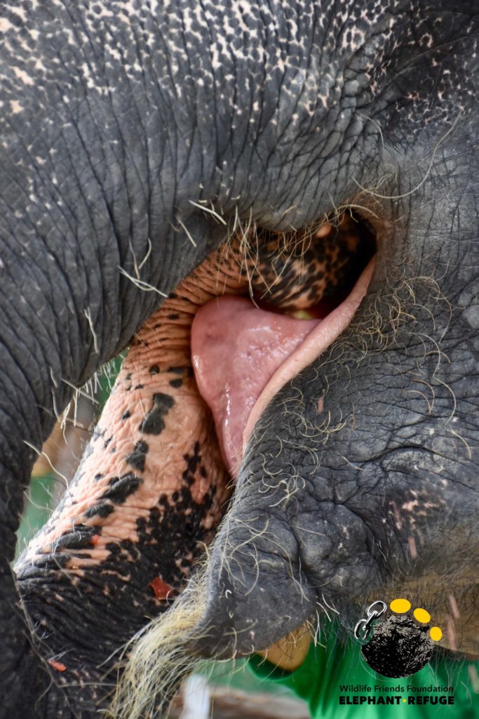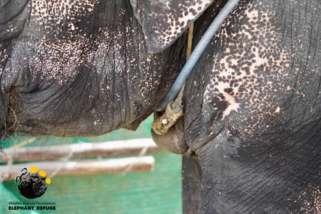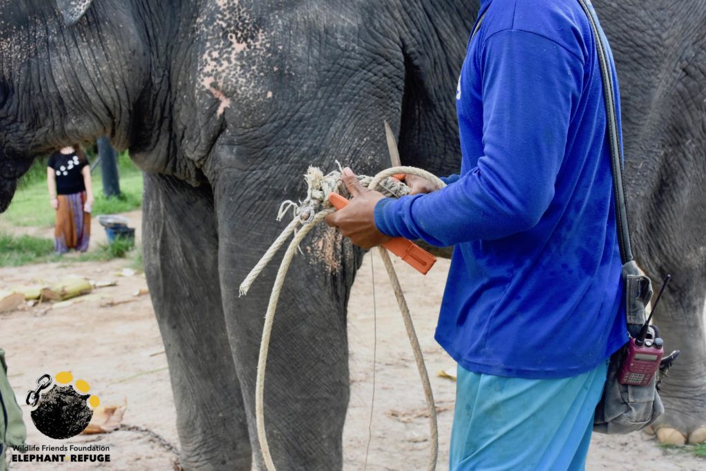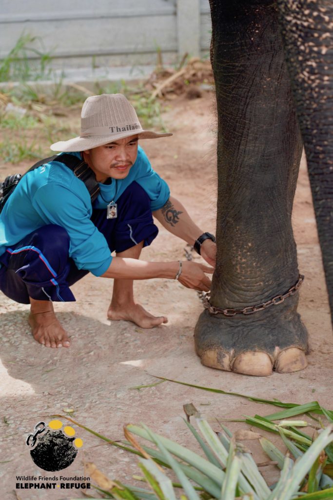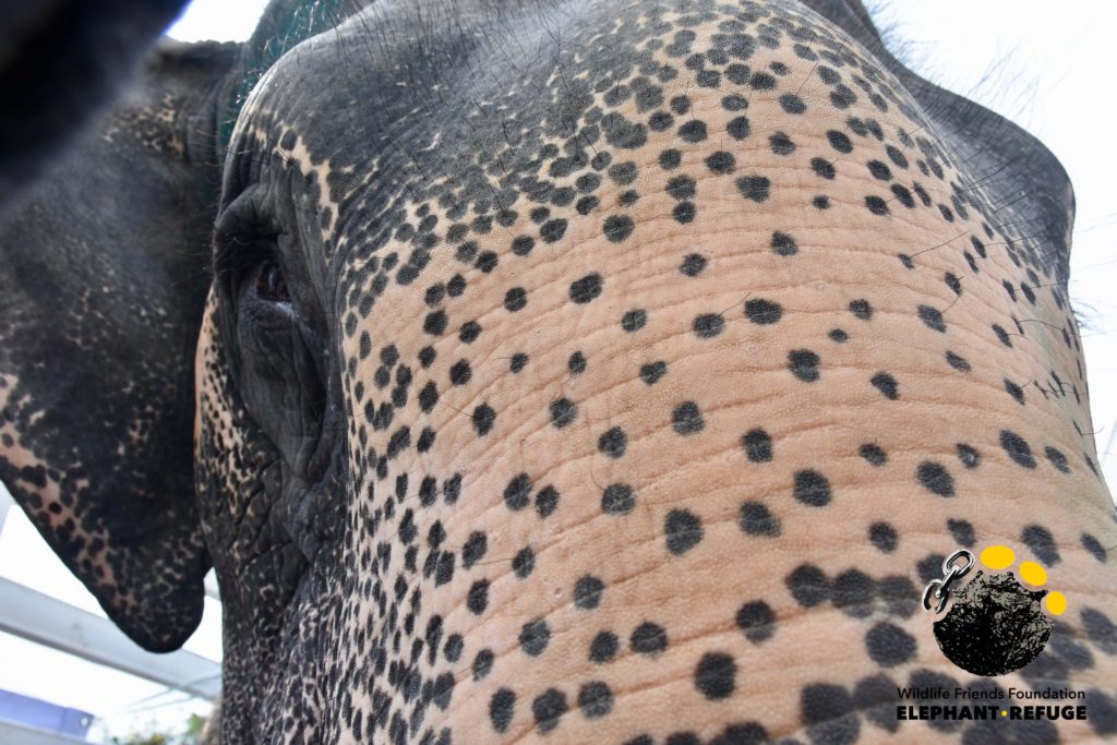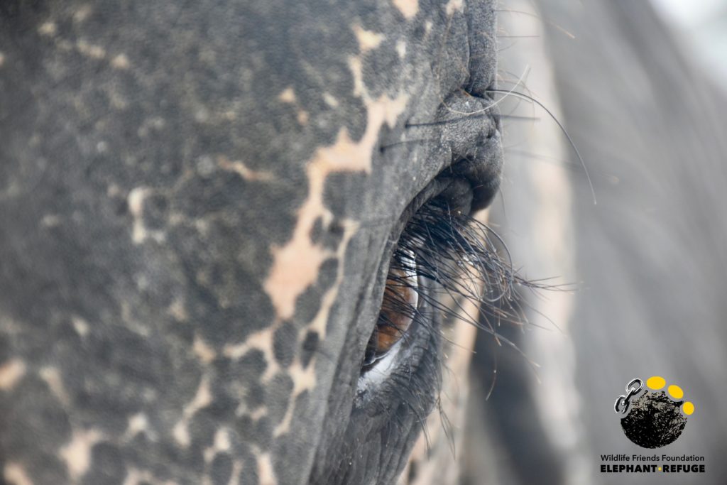 Yesterday the WFFT Elephant Refuge welcomed another new soul to the herd. Boon Dee is half blind and has been rescued from a trekking camp in Pattaya. The rescue was made possible by the generous support of Joan Pearson who is again visiting WFFT from Australia. The difference with this visit is that for the first time Joan came alone. Normally she brings a group of sponsors from Australia and spends her time here making sure they have a great time. This time we managed to convince her to come alone and allow the whole WFFT team to look after her for a change. Joan was celebrating a significant birthday and didn’t want a big fuss made back in Sydney. Instead she wanted to spend it in her favourite place in the world surrounded by the animals she loves. Joan’s only wish for a present was to be able to rescue another elephant. When we learned that there was an elephant in need of rescue in Pattaya the team including Joan headed out to investigate. It was love at first sight. Having arrived at the camp four years ago Boon Dee had been in a terrible state. Emaciated and covered in abscesses her owners cried when they first saw the abuse and neglect she had suffered. They took good care of her while they had her and returned her to full health. When they were forced to sell her they didn’t want to run the risk of her falling into the wrong hands again and contacted the WFFT Elephant Refuge team. After completing the necessary paperwork Boon Dee’s owners accompanied her on the long journey back to the centre. They cried again when they saw where she was going to spend the rest of her life, but this time it was tears of joy.