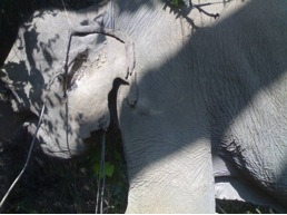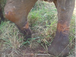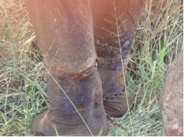 Front legs of the elephant show several deep cuts and injury, caused by the restraining of both legs and the binding together.