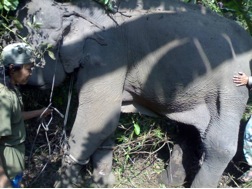 Kanchanaburi, Thailand – An adult female elephant being transported from the Thai-Burma border was stopped by livestock department officials in Sai Yok district on the 23rd of December 2008 at a routine check. The elephant was found to be in bad medical condition with wounds all over its body and weak due to various infections and mal-nutrition. Ownership documents for the captive elephant were handed over to the officials at the check-point and no wrong-doing was found, however the livestock inspector at duty ordered the owner to take the elephant to the veterinary hospital of Mahidol University at the Sai Yok campus in Kanchanaburi, close by, so veterinarians of the faculty could treat the wounds, infections and have the elephant regain strength.