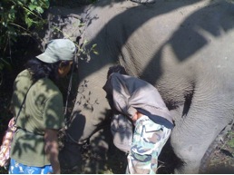 At the Mahidol livestock and wildlife hospital, the elephant was immediately treated for its injuries that were found all over its body. Veterinarians and staff however found that the elephant did not behave as expected from a captive elephant. The elephant was very tense and was urinating continuously when approached by people and did not know whether or how to eat bananas, apples and pine-apples. The origin of the wounds were also a mystery to some, however suspicion was rising that this female elephant of approximately 17-18 years old underwent “Phajaan” or the breaking of the spirit of elephants to teach them to obey people and allow them to ride the elephants and/or perform tricks. The owner of the elephant (Mr. Boontham Sala-ngam) however was able to show an ownership document for the elephant with a detailed description of the elephant’s body describing the missing part of its left ear, and most major injuries to its body. Stranger even more was the fact that this document was issued by the “palad Amphoe” of Sai Yok only one day before this date (December 22nd) , although the elephant was clearly close to twenty years old, i.e. an adult. Ownership documents are normally issued for baby elephants up to an age of 9 years old, and must be accompanied by their mothers as a form of proof that they were born in captivity. In this case the issuing official did not ask for any proof where the animal had come from and only saw a purchase contract, where Mr. Boontham bought the elephant from a certain Mr. Sompong (without last name). He claimed to have bought the elephant out of compassion for 400,000 baht.