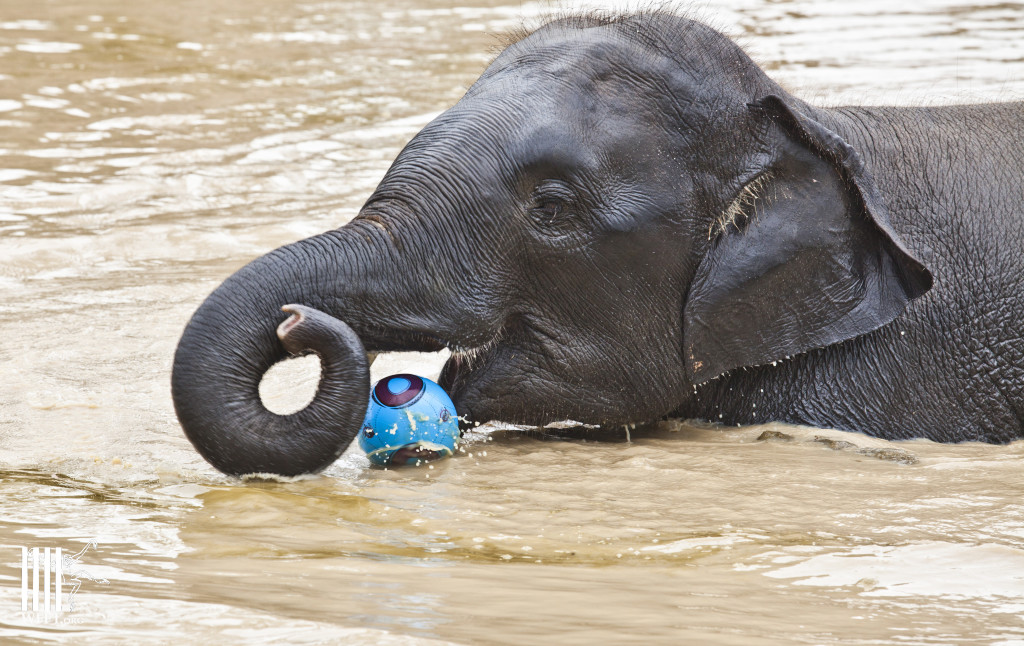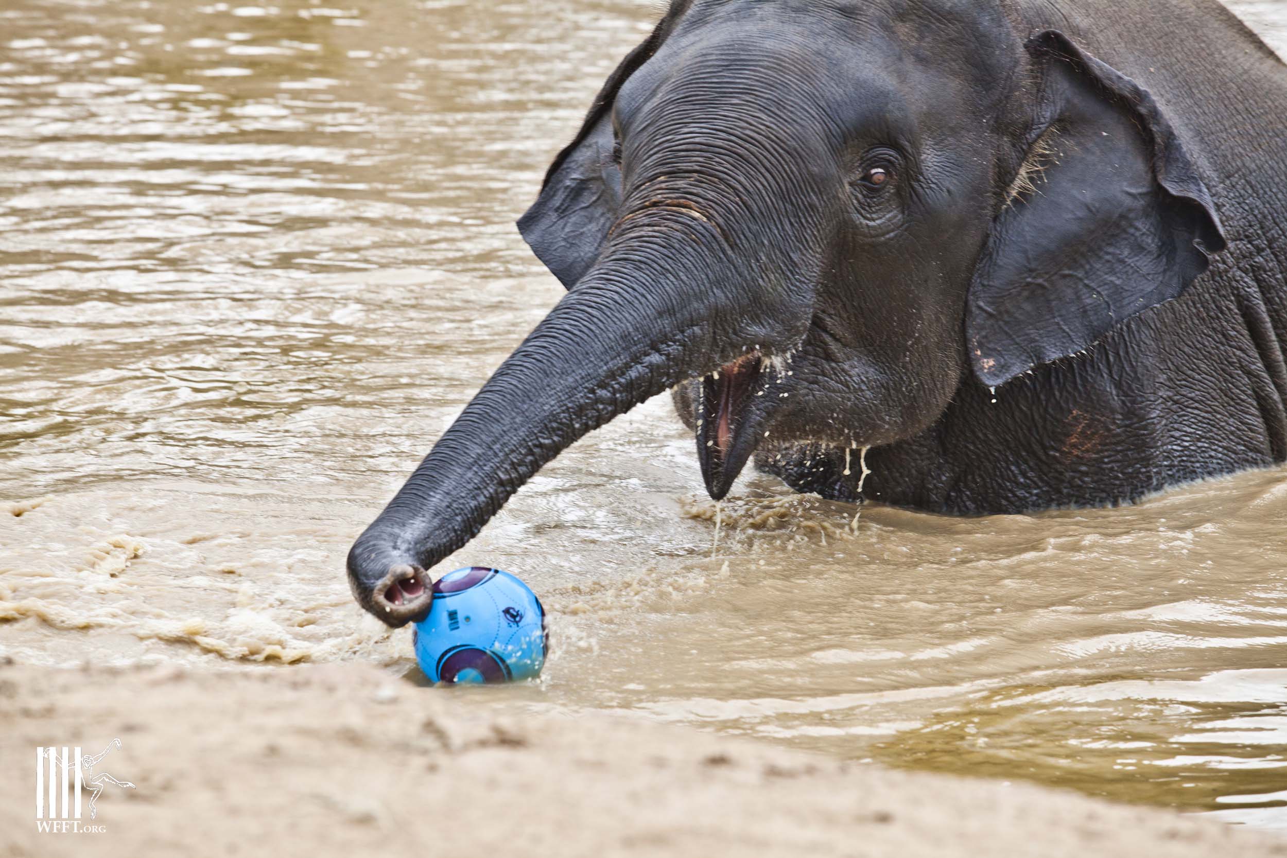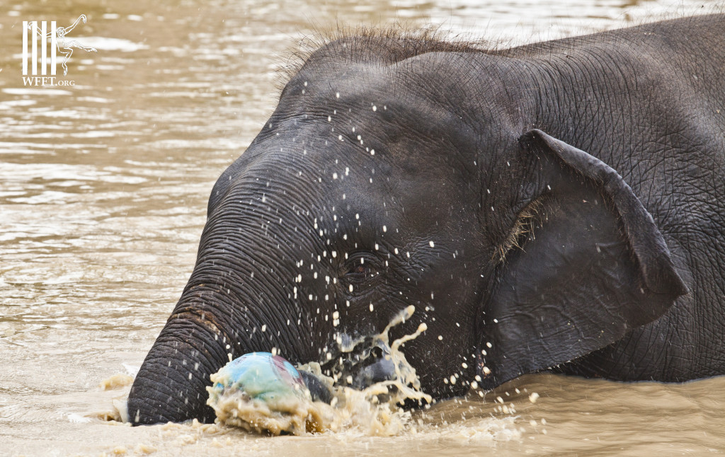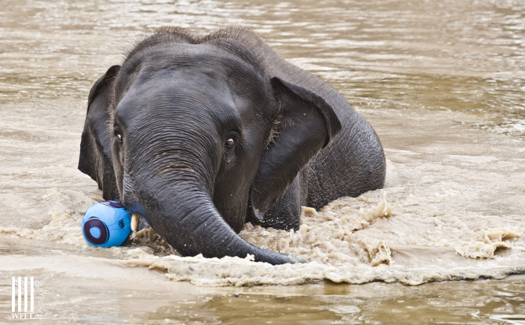 Lately our volunteers have been making more enrichments for the elephants, and especially for the young bull “Kan Kloey” who has been living at WFFT for several years now. Kan kloey loves to play with grass, bamboo and wooden enrichments, but most of all he likes people to throw food and toys into the big pool, so he can enjoy a play and a swim at the same time.