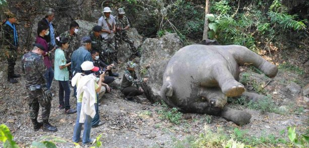 Narong Mahannop, director of the National Parks, Wildlife and Plant Conservation Department’s wildlife conservation division, yesterday said park officials were also tracking a wounded elephant which they think was shot by the same group of poachers. The wounded elephant, aged 8-9 years, was spotted about 4km from where the dead jumbo was found.”