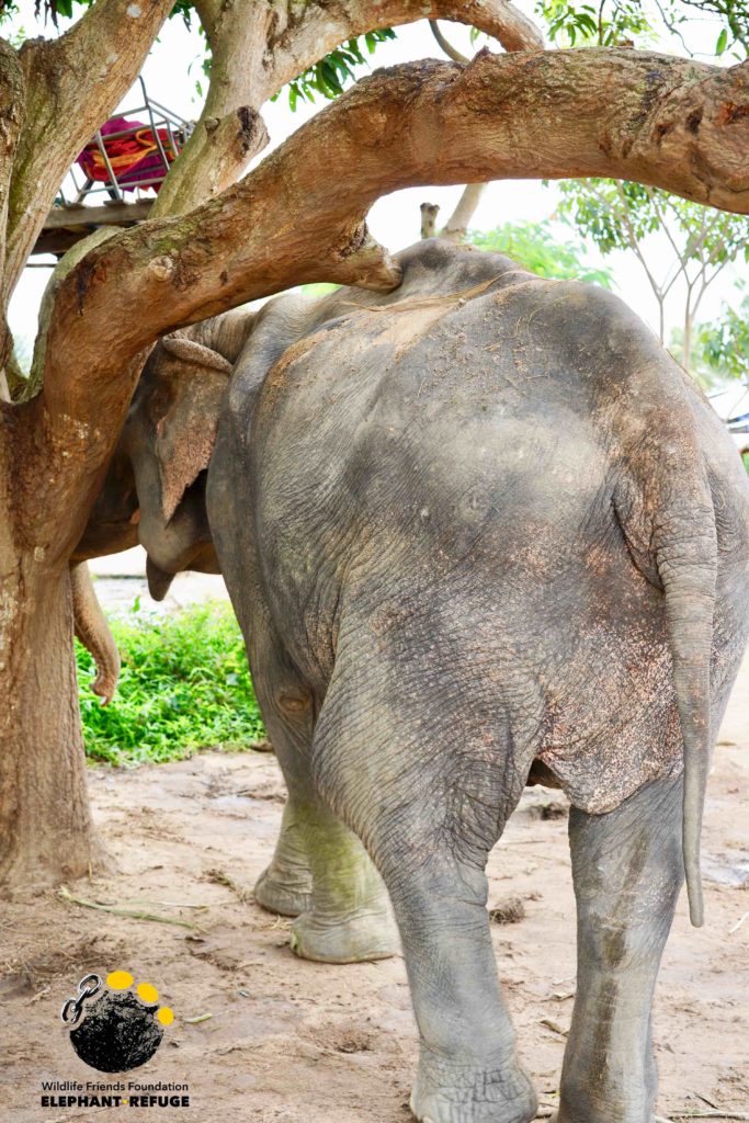Early in the week when the WFFT Rescue Team were out rescuing Boon Dee they were saddened to find an elderly elephant in urgent need of help at the same tourist camp. They saw an emaciated elephant covered in scars chained to a tree with no shade or water. We contacted the owner of this elephant to investigate further about the possibility of helping her. The owner initially wanted an unreasonable amount of money for her to be given her freedom. We were later told that she has collapsed three times over the past few months, and that she had also fallen into a drain. A tourist camp with no veterinary staff and poor animal care is no place for a sick elderly elephant. Thankfully after a few days of discussions, the owner has agreed that we can transfer Jum Nong here to the WFFT Elephant Hospital for urgent care and veterinary treatment tomorrow.