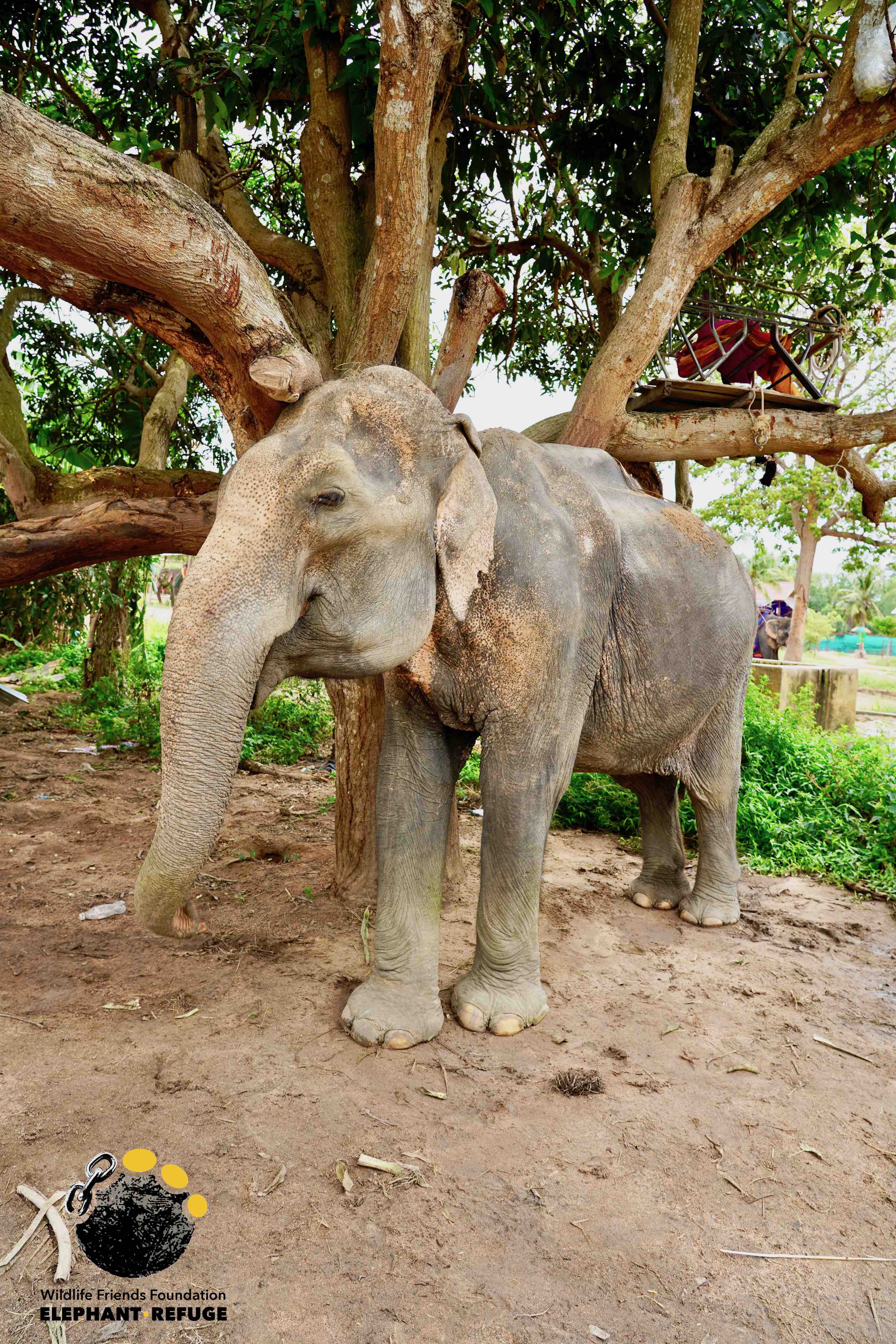 Early in the week when the WFFT Rescue Team were out rescuing Boon Dee they were saddened to find an elderly elephant in urgent need of help at the same tourist camp. They saw an emaciated elephant covered in scars chained to a tree with no shade or water. We contacted the owner of this elephant to investigate further about the possibility of helping her. The owner initially wanted an unreasonable amount of money for her to be given her freedom. We were later told that she has collapsed three times over the past few months, and that she had also fallen into a drain. A tourist camp with no veterinary staff and poor animal care is no place for a sick elderly elephant. Thankfully after a few days of discussions, the owner has agreed that we can transfer Jum Nong here to the WFFT Elephant Hospital for urgent care and veterinary treatment tomorrow.