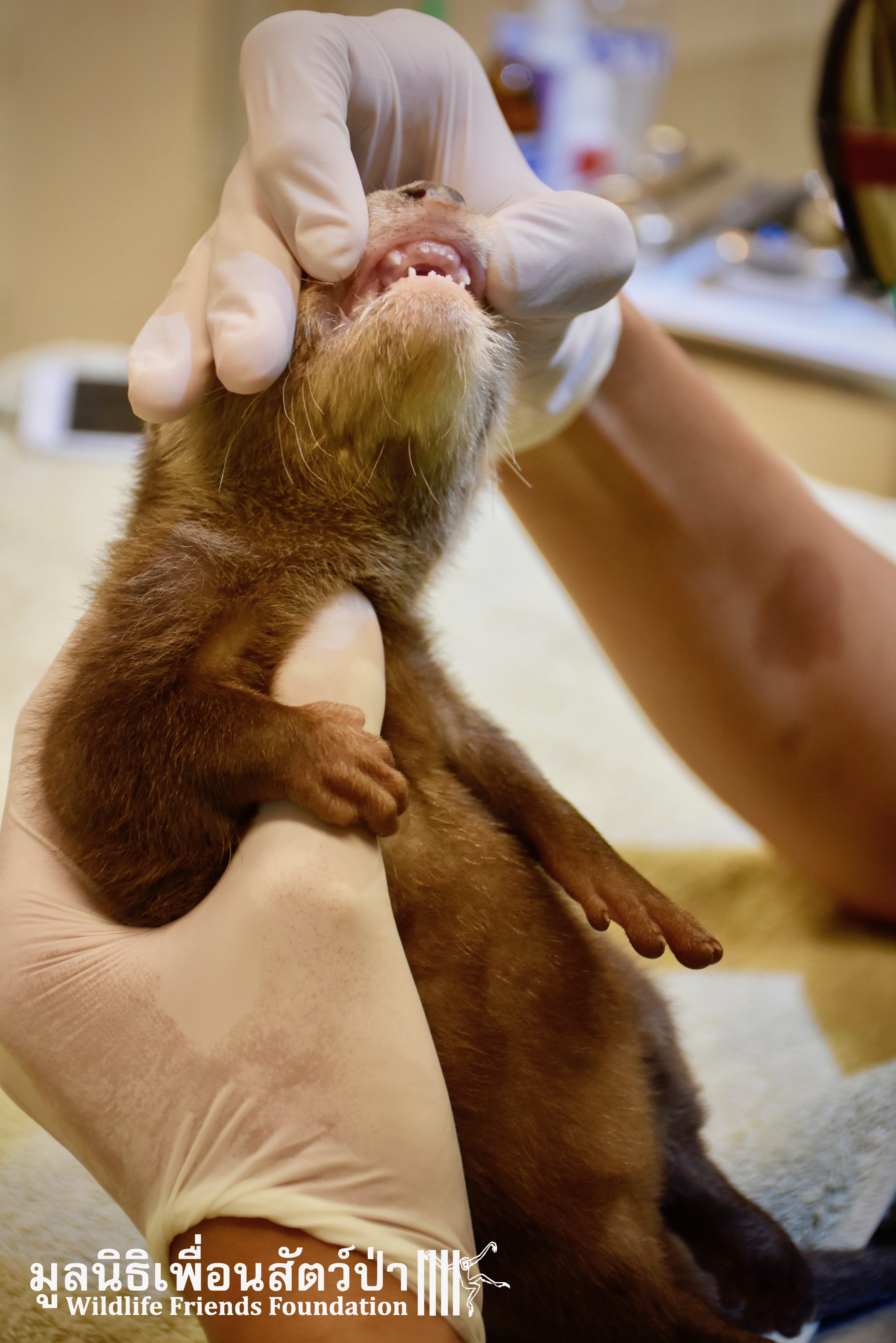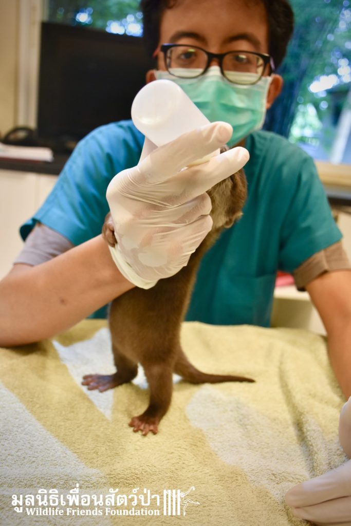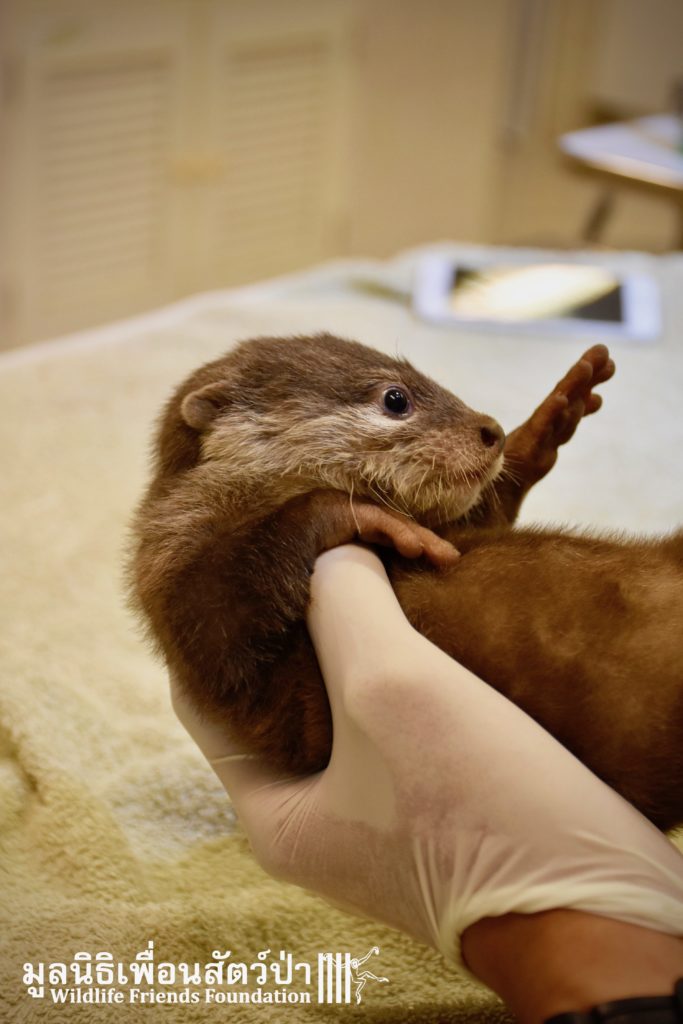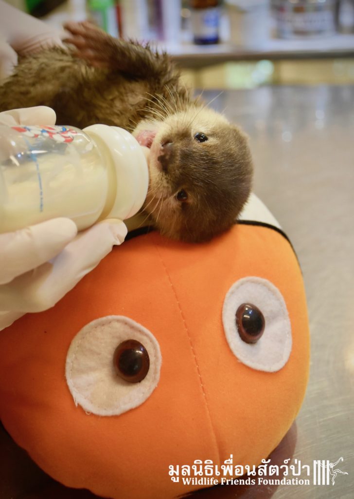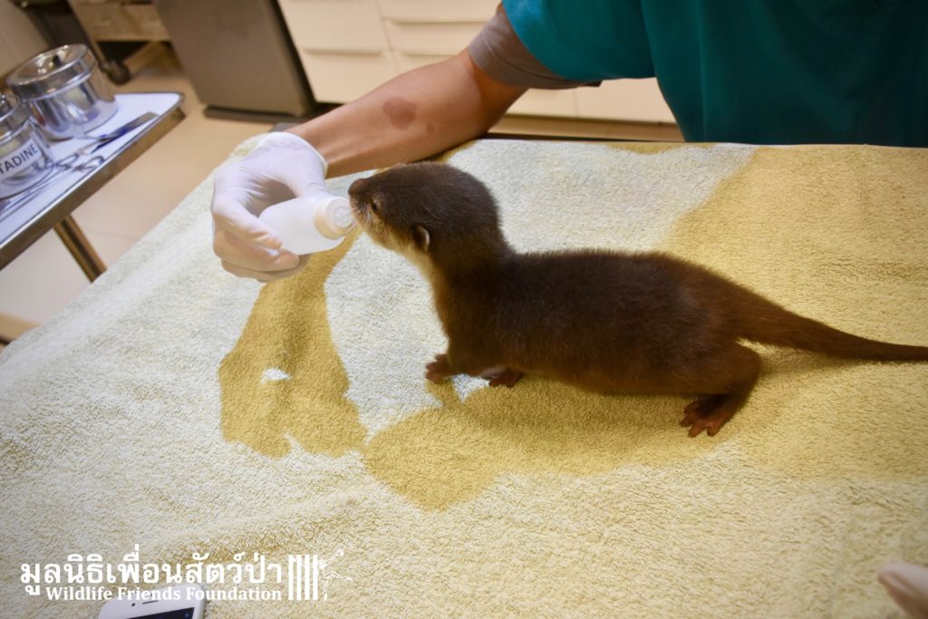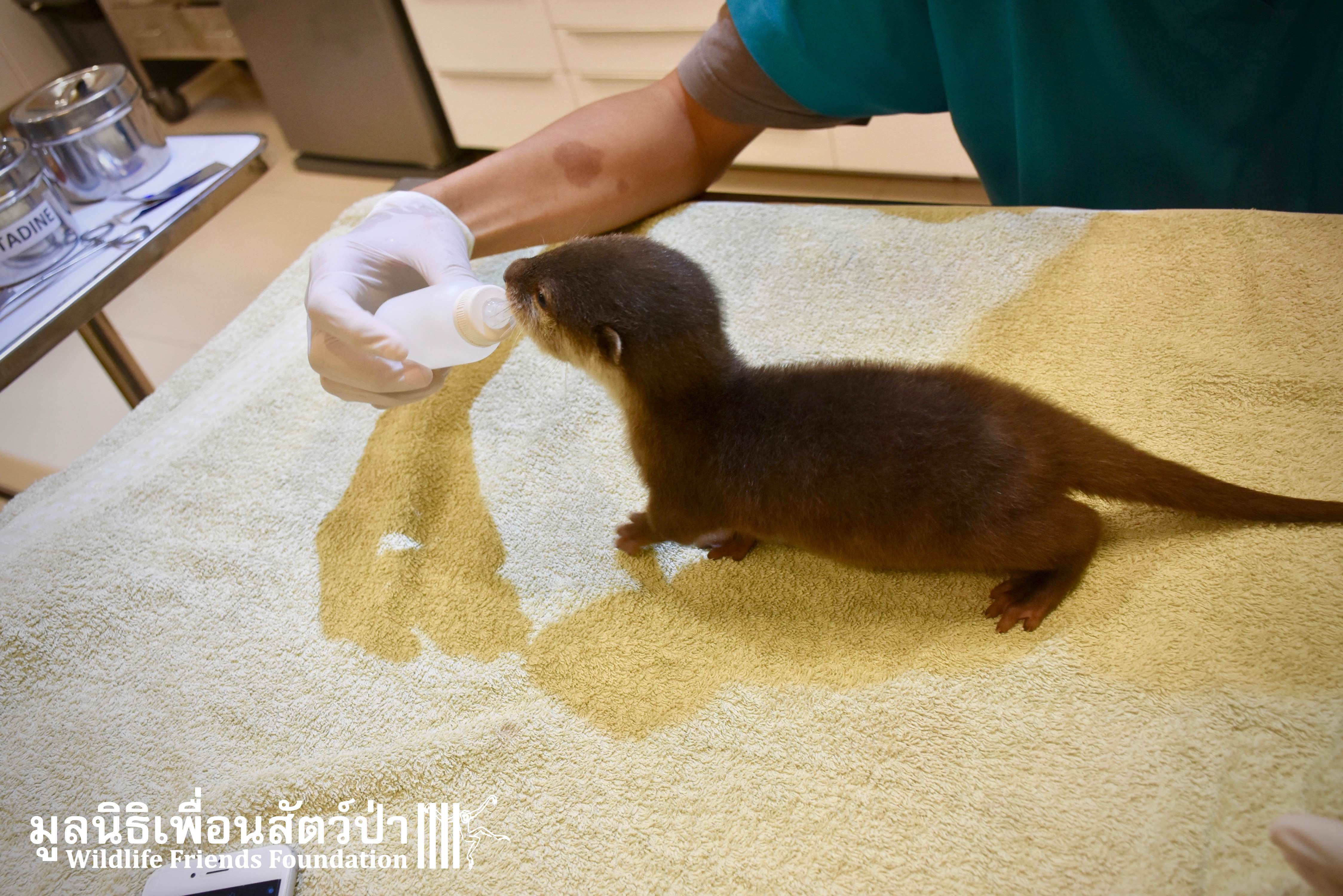 Yesterday some people from Samut Sakorn brought a baby female short-clawed otter (Aonyx cinerea) into the WFFT Wildlife Rescue Centre. They had been keeping her as pet for the past two weeks after buying her from one of their friends, she was six week sold when they bought her. They called the little one Toro. They did not expect that Toro would require such specialist care, and be rather loud and smelly. Annoyed by the constant calls for her mother they decided to bring her to WFFT. After an initial health check Toro seems in good health. She had been fed only goats milk, so it will take us some time to adjust her diet.This little orphan will require months of round-the-clock care from the WFFT Vet Team. We hope that in the future she can live with her own species once again.