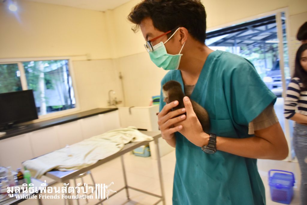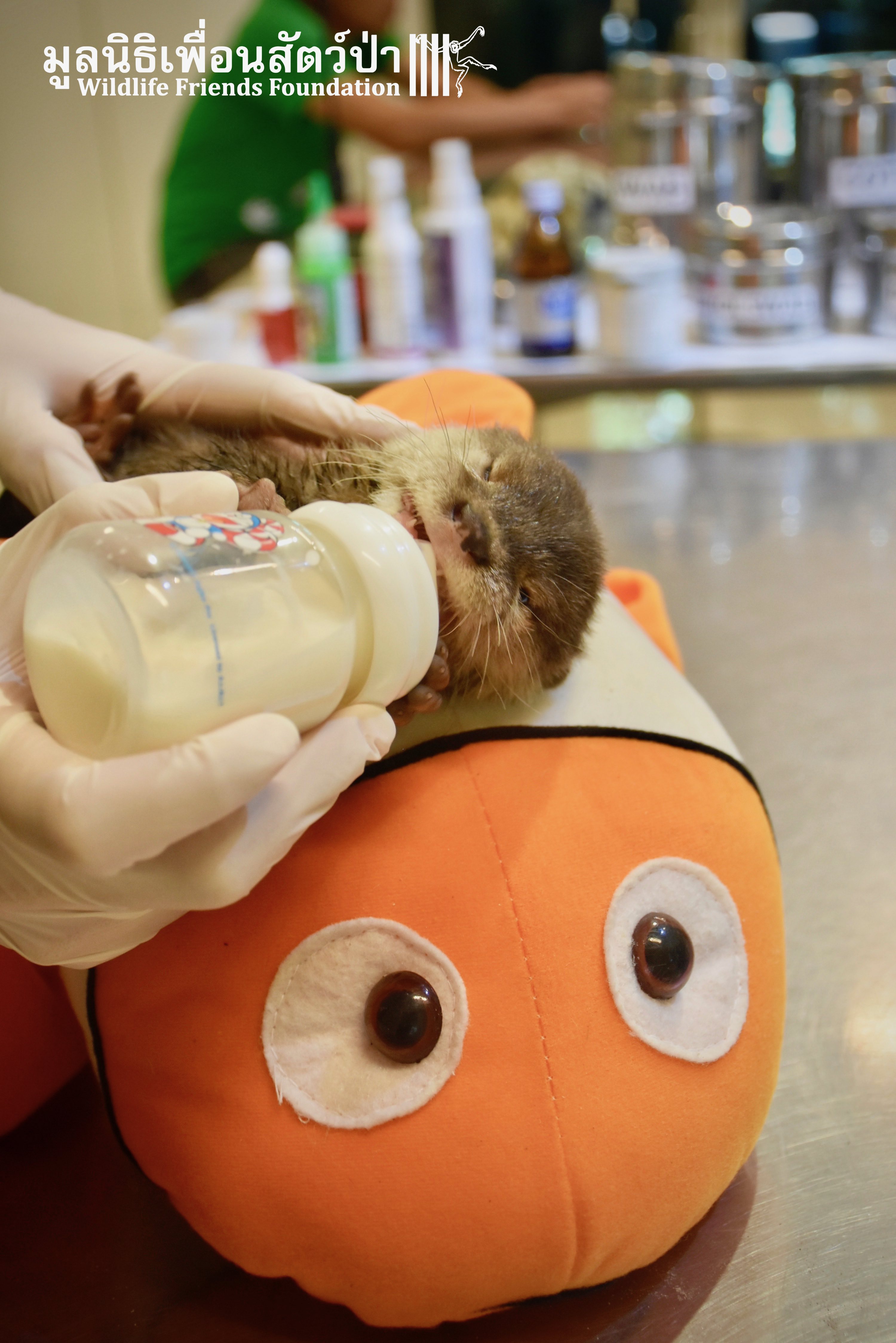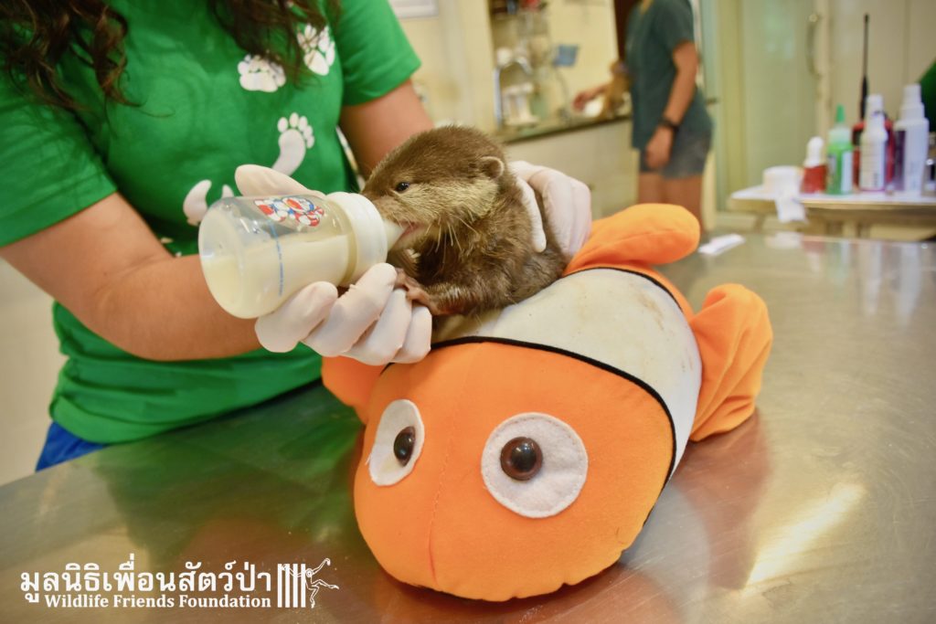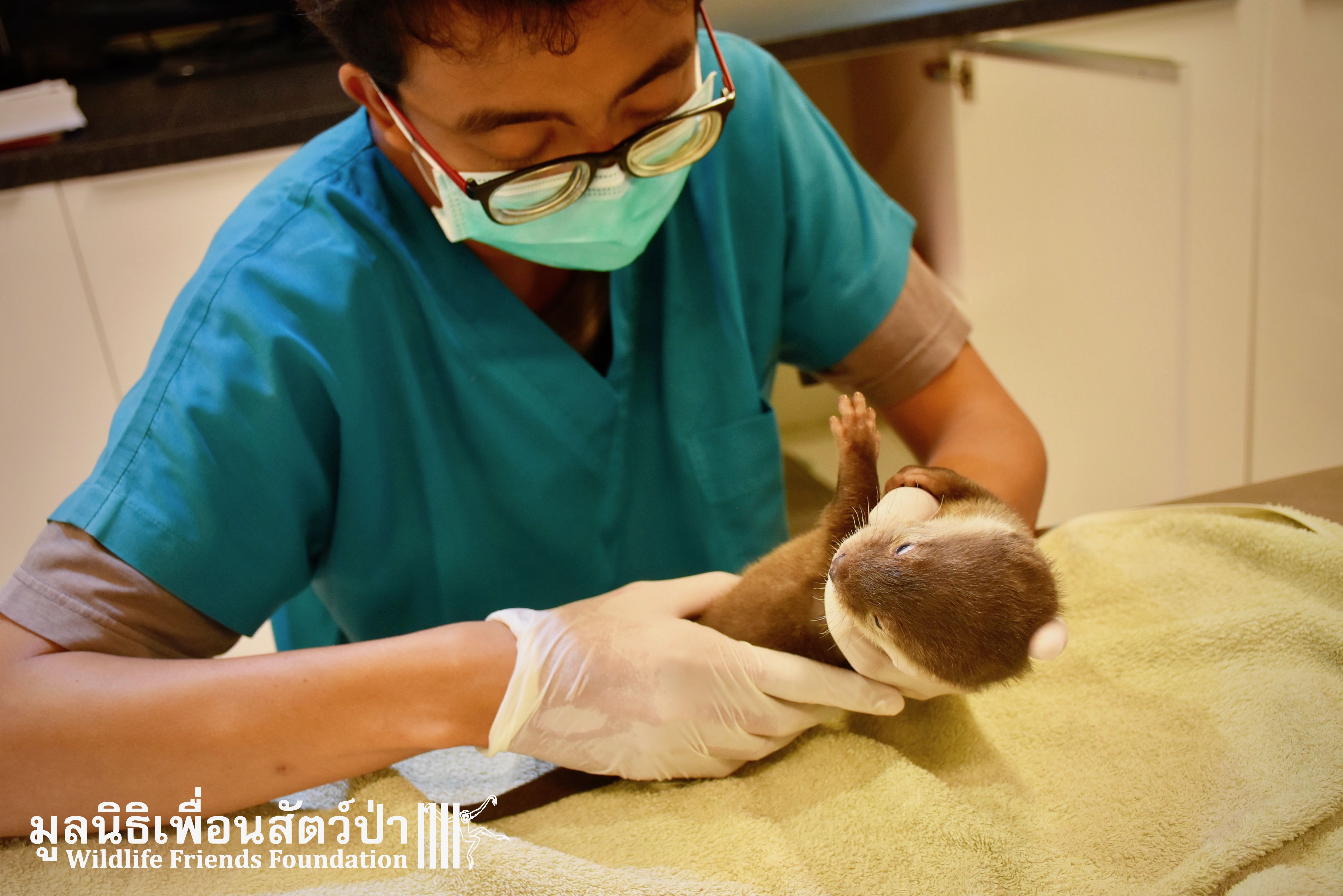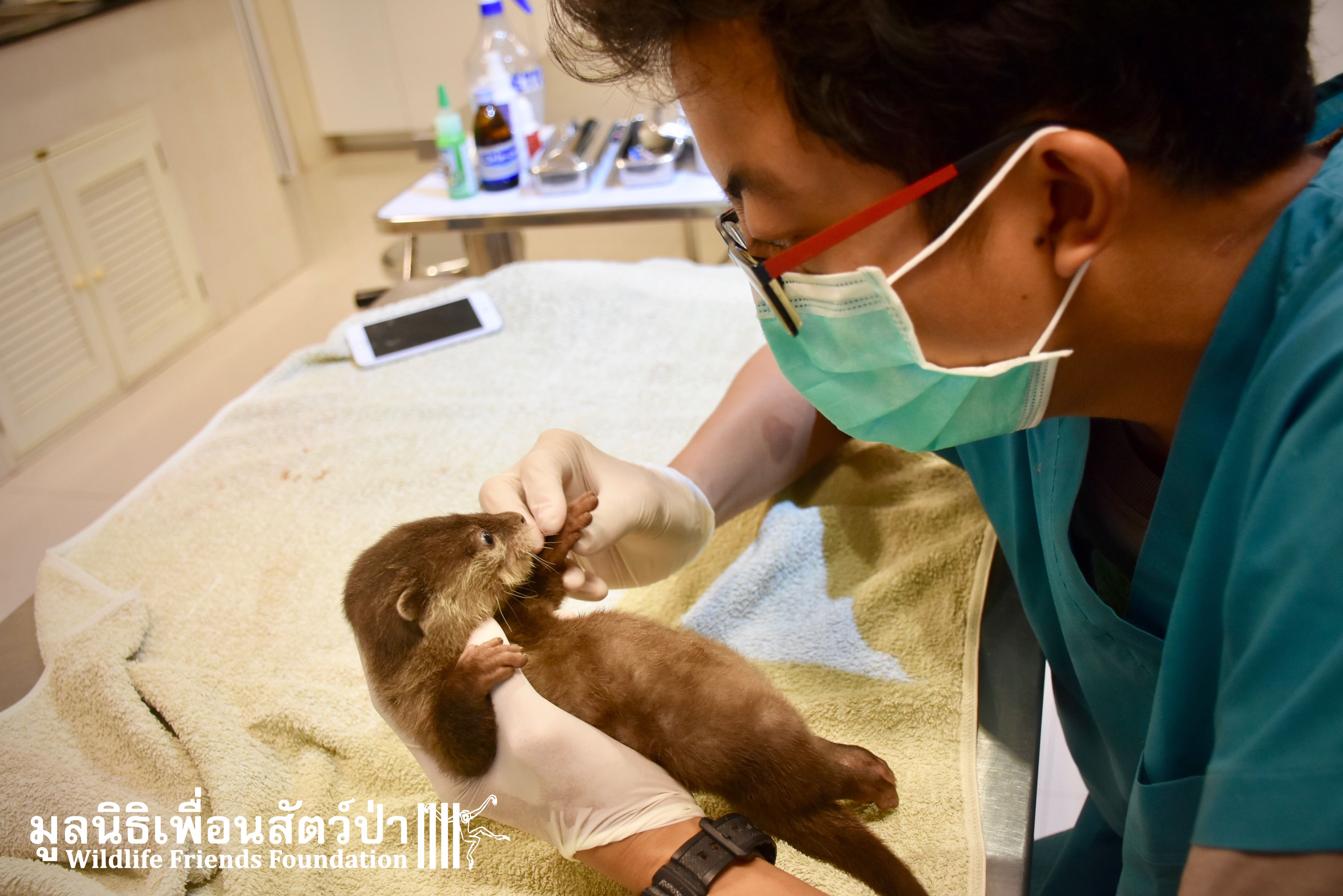 Yesterday some people from Samut Sakorn brought a baby female short-clawed otter (Aonyx cinerea) into the WFFT Wildlife Rescue Centre. They had been keeping her as pet for the past two weeks after buying her from one of their friends, she was six week sold when they bought her. They called the little one Toro. They did not expect that Toro would require such specialist care, and be rather loud and smelly. Annoyed by the constant calls for her mother they decided to bring her to WFFT. After an initial health check Toro seems in good health. She had been fed only goats milk, so it will take us some time to adjust her diet.This little orphan will require months of round-the-clock care from the WFFT Vet Team. We hope that in the future she can live with her own species once again.