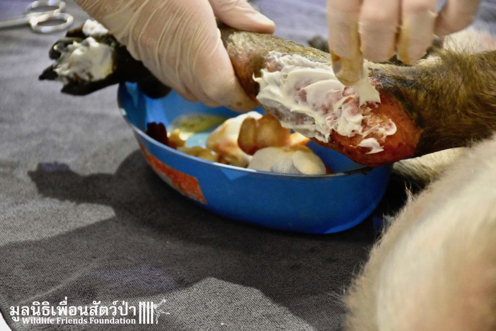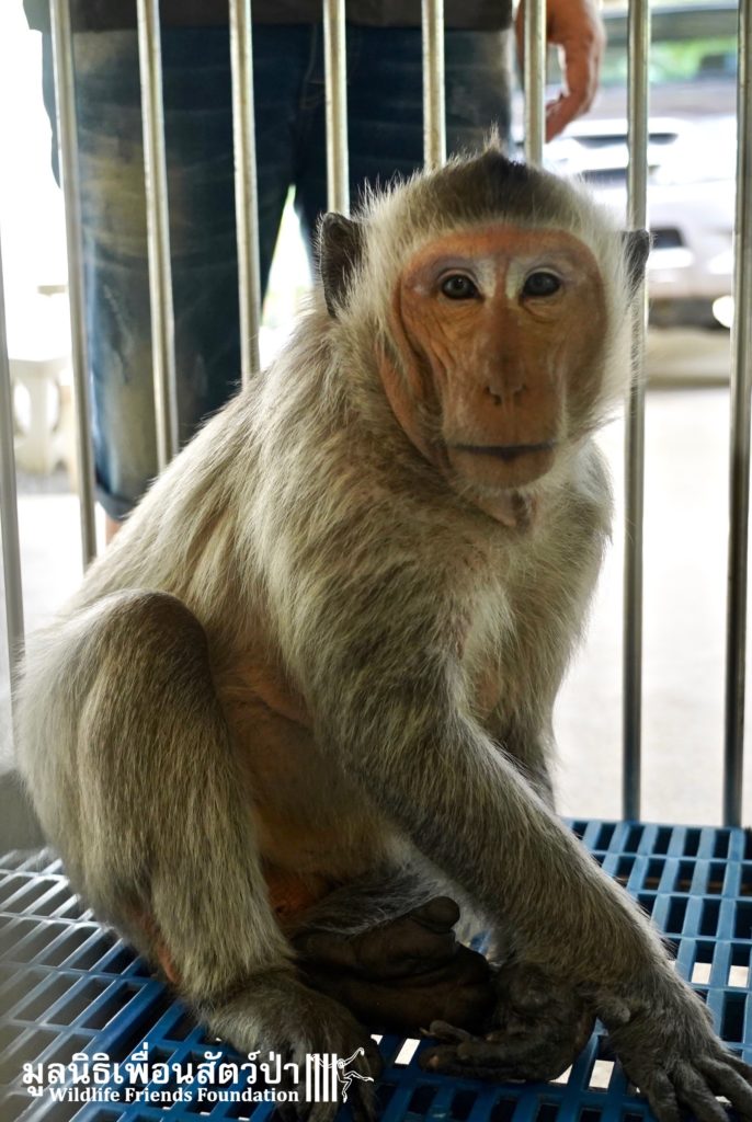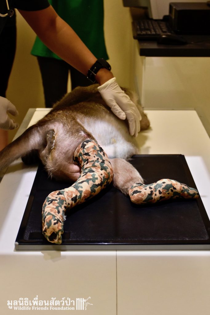 Our second amputation of the day was of another long-tailed macaque, Bucky, who first came to us several months ago after falling out of a tree. He belongs to an urban macaque troop that is fed by a local community in Bangkok. They trapped and brought him to WFFT after noticing he had stopped using his arm. Once again, no breaks or dislocations were found in his radiographs but a fresh bullet wound was discovered in his disabled arm. It was removed and he was returned to his troop. However, he was brought back to WFFT this week because he still wasn’t using his arm. To avoid future risks of injury and sepsis, this arm was amputated after Auan’s leg amputation. After his recovery he will be returned to his troop in Bang Khun Thian, Bangkok.