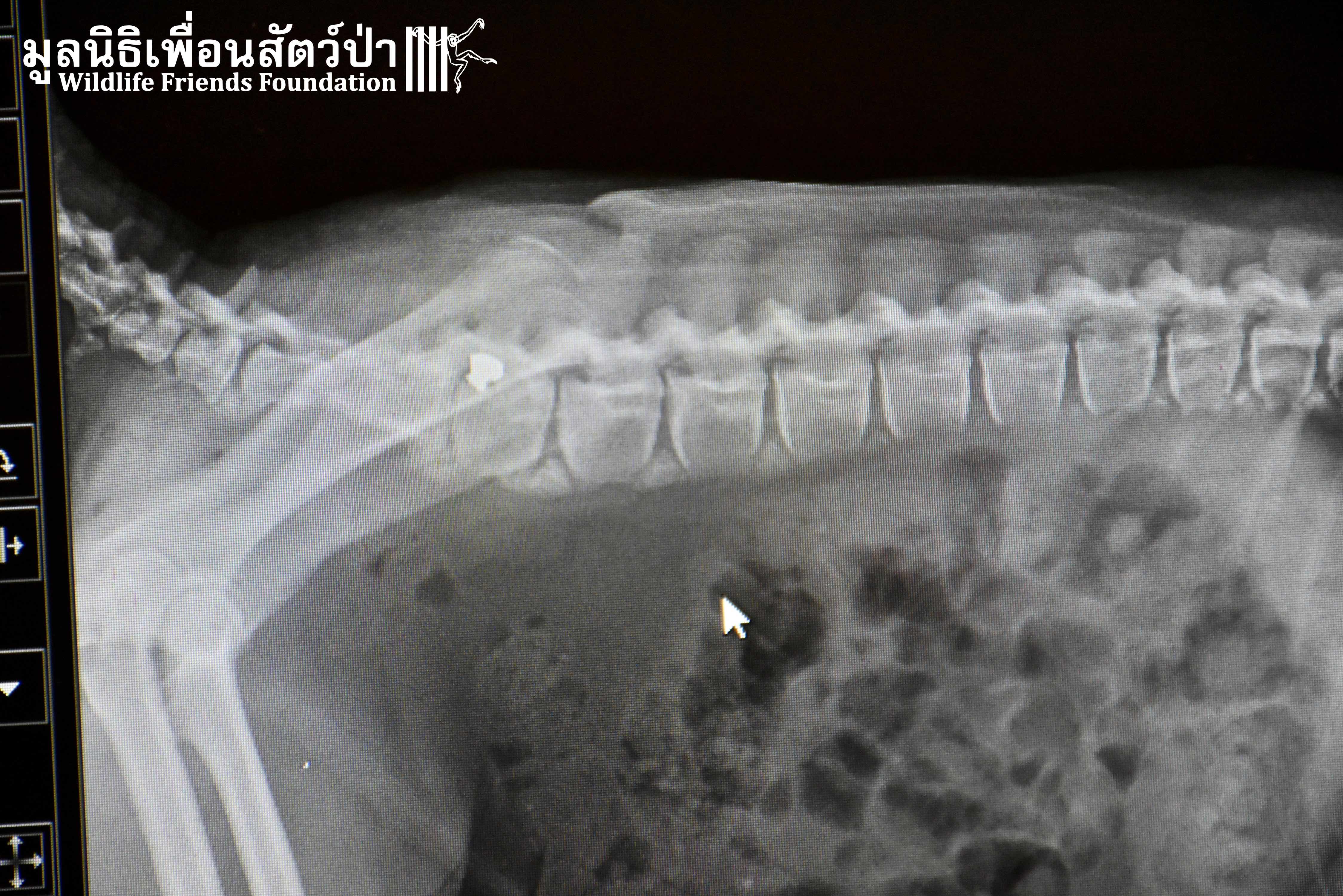 Our second amputation of the day was of another long-tailed macaque, Bucky, who first came to us several months ago after falling out of a tree. He belongs to an urban macaque troop that is fed by a local community in Bangkok. They trapped and brought him to WFFT after noticing he had stopped using his arm. Once again, no breaks or dislocations were found in his radiographs but a fresh bullet wound was discovered in his disabled arm. It was removed and he was returned to his troop. However, he was brought back to WFFT this week because he still wasn’t using his arm. To avoid future risks of injury and sepsis, this arm was amputated after Auan’s leg amputation. After his recovery he will be returned to his troop in Bang Khun Thian, Bangkok.