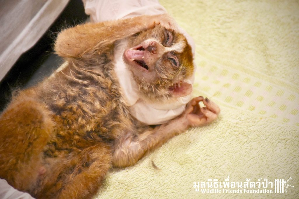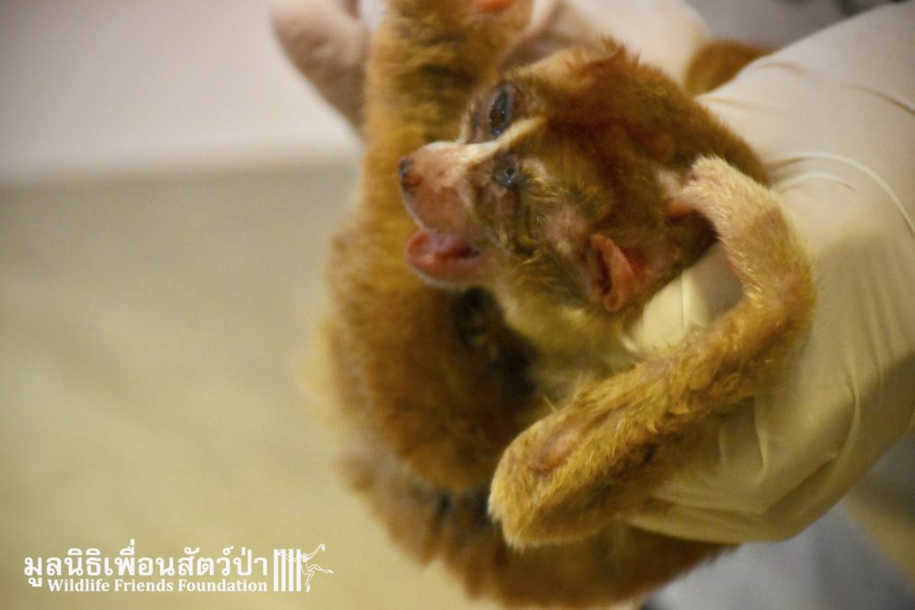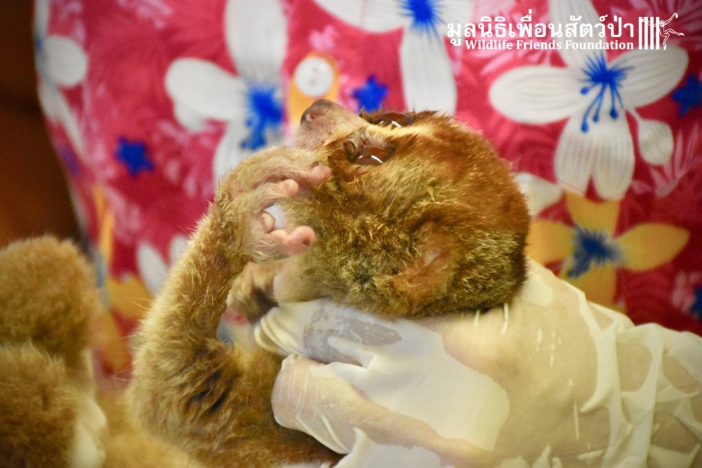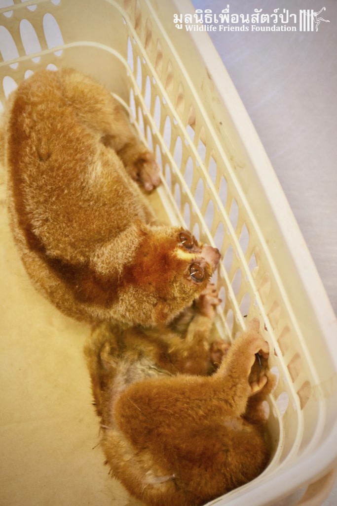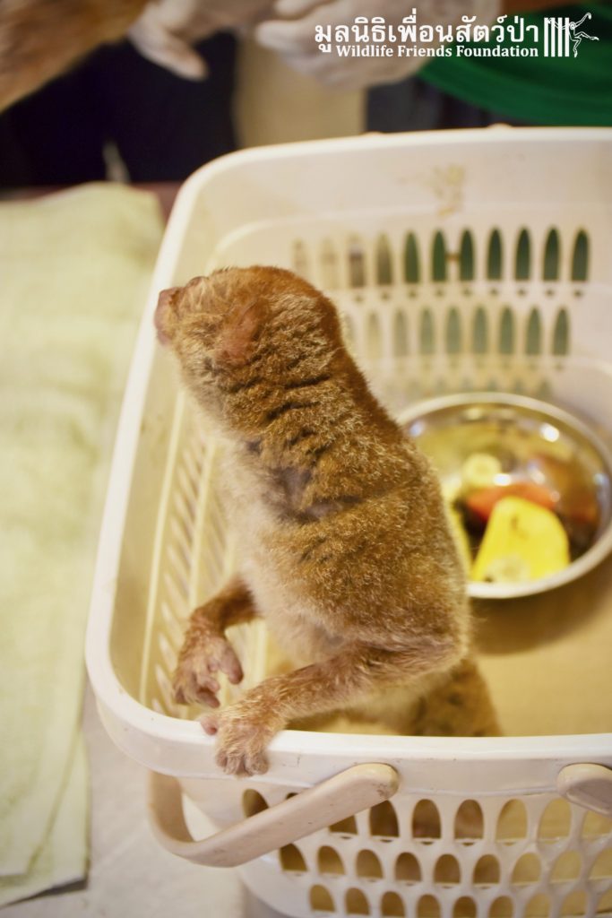 A few days ago two very weak and emaciated Sunda slow lorises (Nycticebus coucang) were brought into the WFFT Wildlife Hospital for urgent treatment by their owner. The lorises in question had been kept as pets for the last year after they were given to the lady by a family member from Southern Thailand. She named them Phet and Reang, they were kept in a small cage in her house for a year until they both became very sick, at this point she released that she should not keep them as pets. The lady said she had fed them a diet of fruit, and one of them had not eaten for a month. Upon arrival to WFFT we were all shocked to find two very thin sickly lorises.