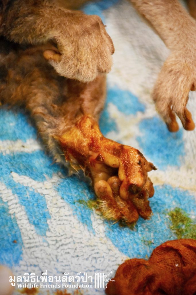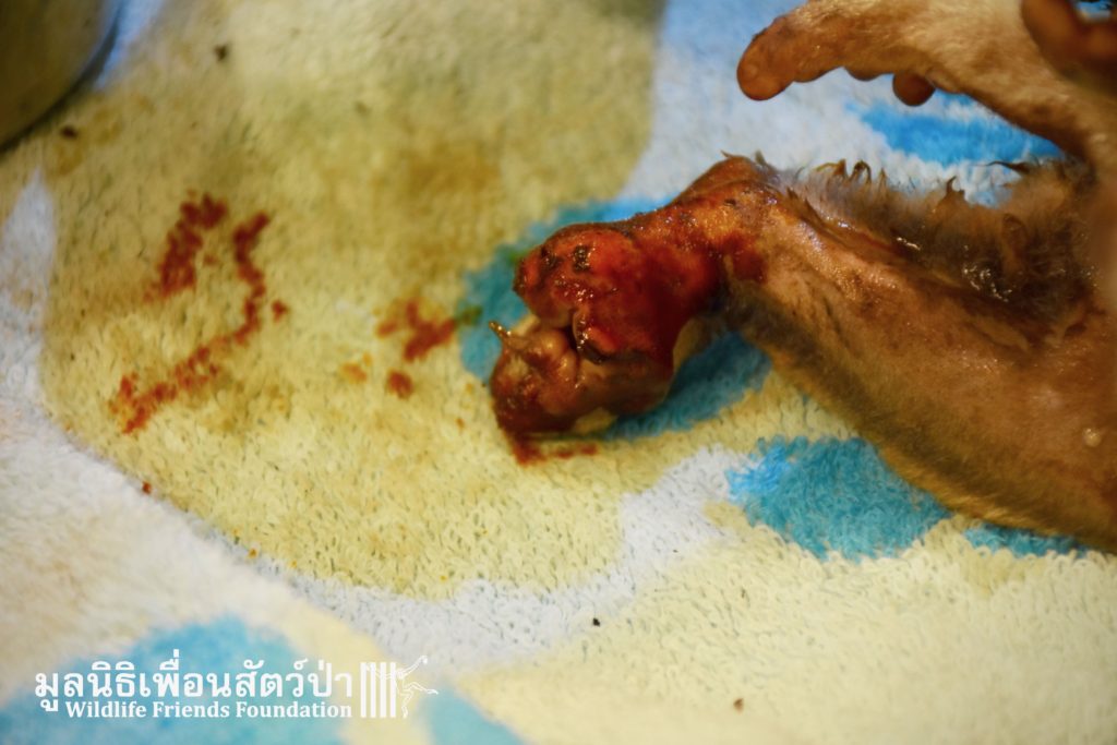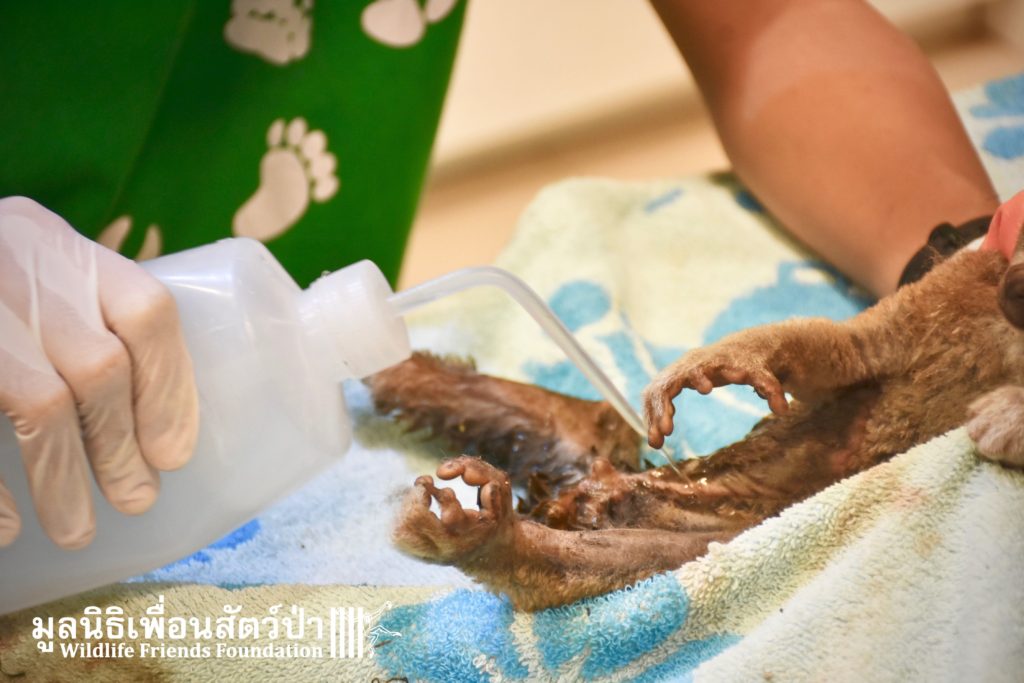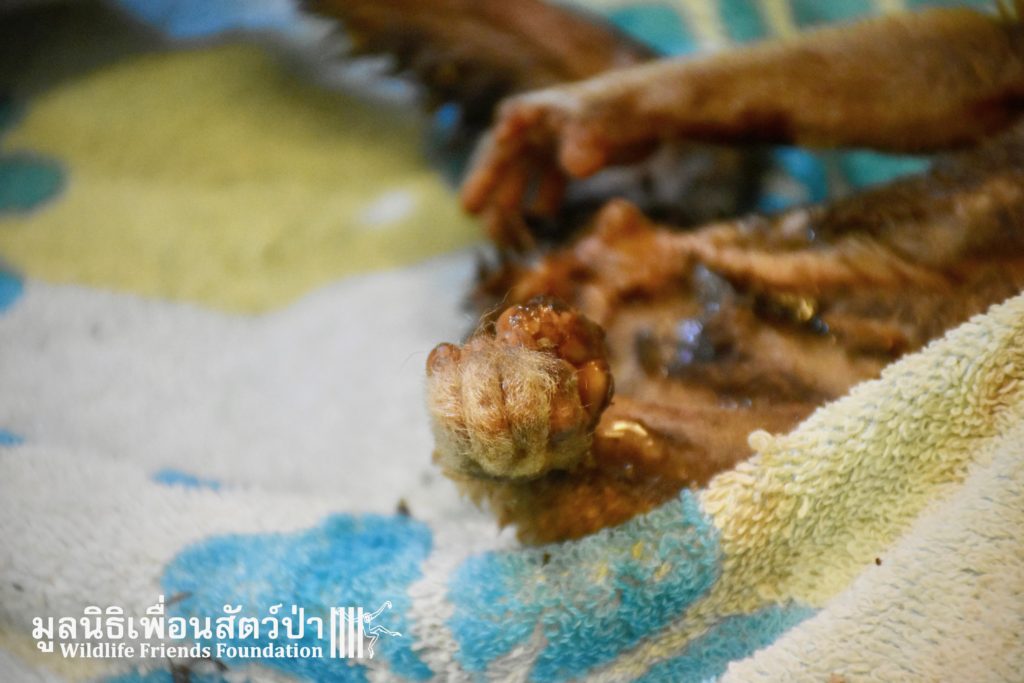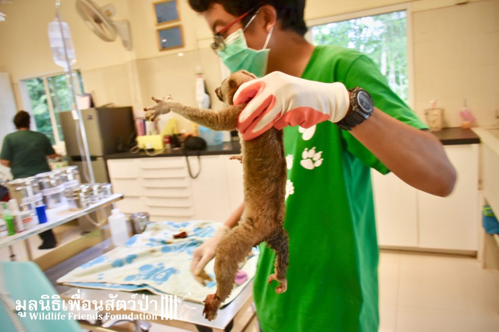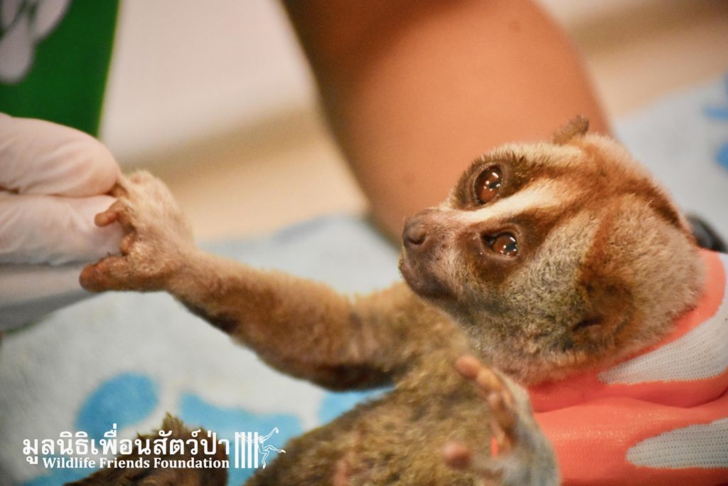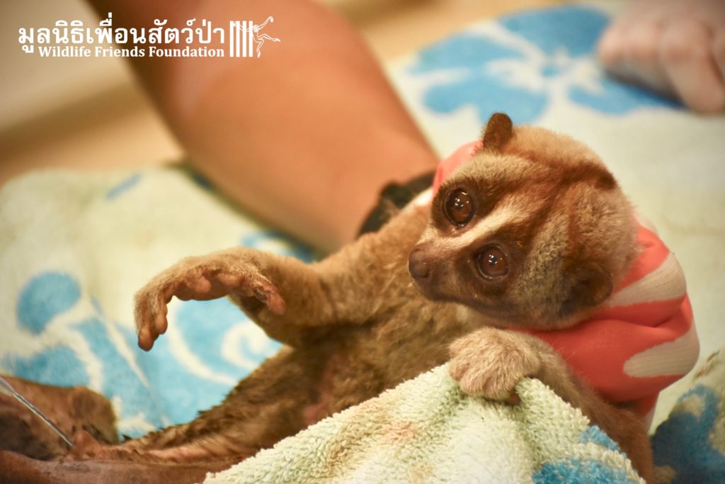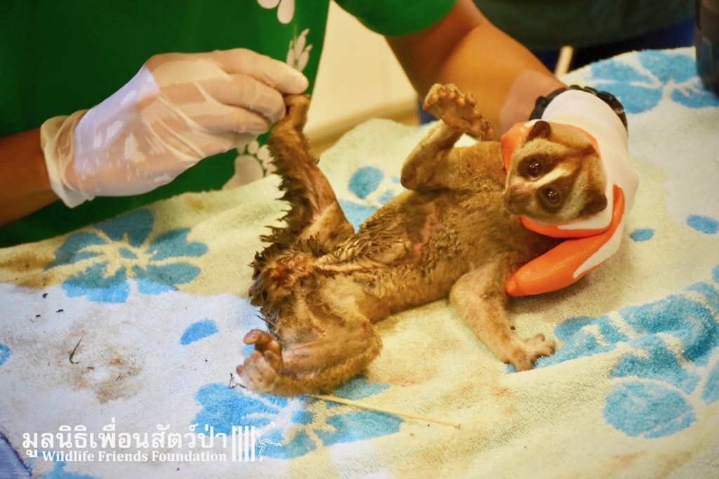 Earlier this week the Wildlife Hospital Vet Team at WFFT Centre received a phone call from the Phetchaburi Livestock Department about a Bengal Slow Loris who had been electrocuted. Luckily this was on the rescue teams way back and they were able to make a slight detour and pick up this injured animal within minutes of receiving the call to help. The team were on the way back to the WFFT Centre from Thong’s Rescue, the gibbon who spent Ten Years in a Trash Filled Shack (see her full story here: https://www.wfft.org/primates/thongs-ten-years-in-a-trash-filled-shack-is-over/ and the video of her rescue here: https://www.wfft.org/wildlife-general/video-diary-thongs-rescue/ )