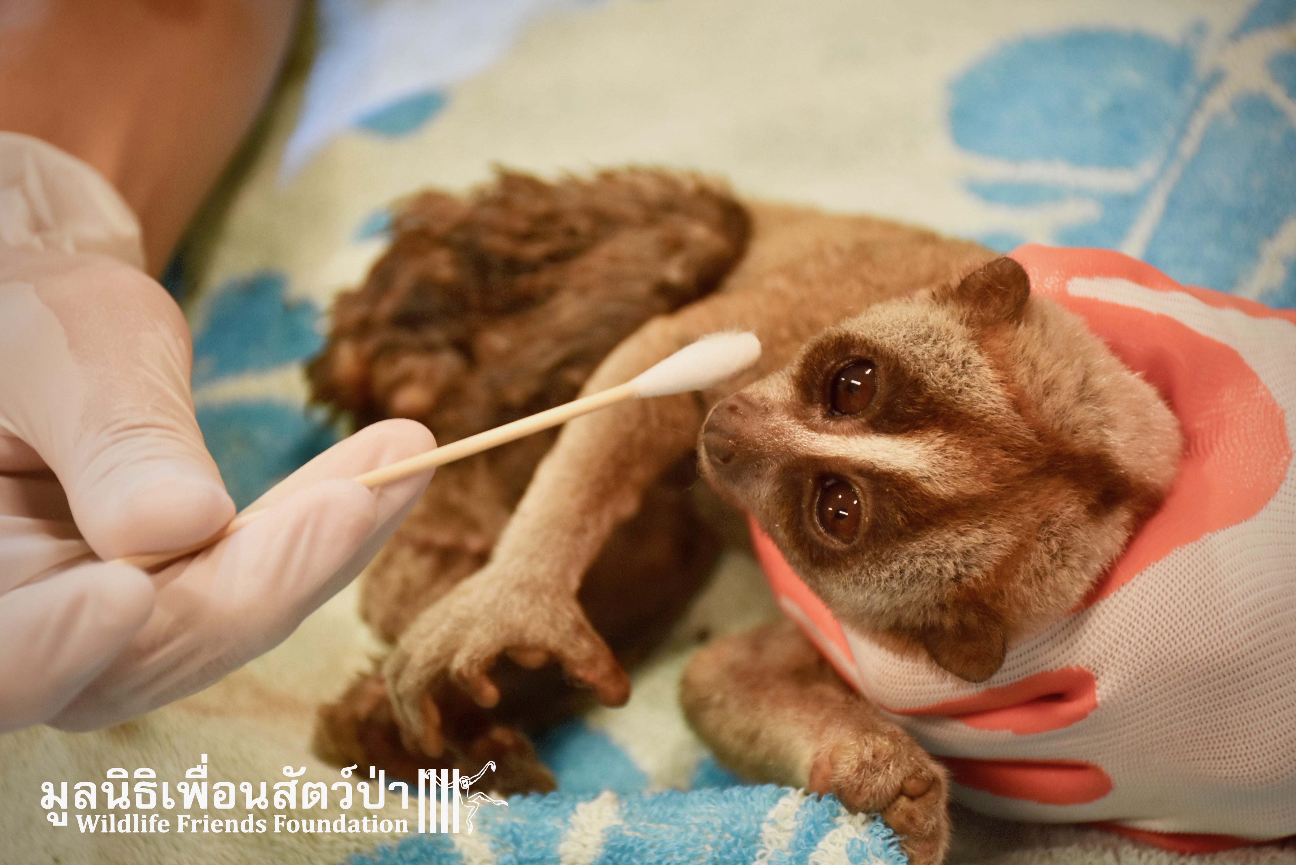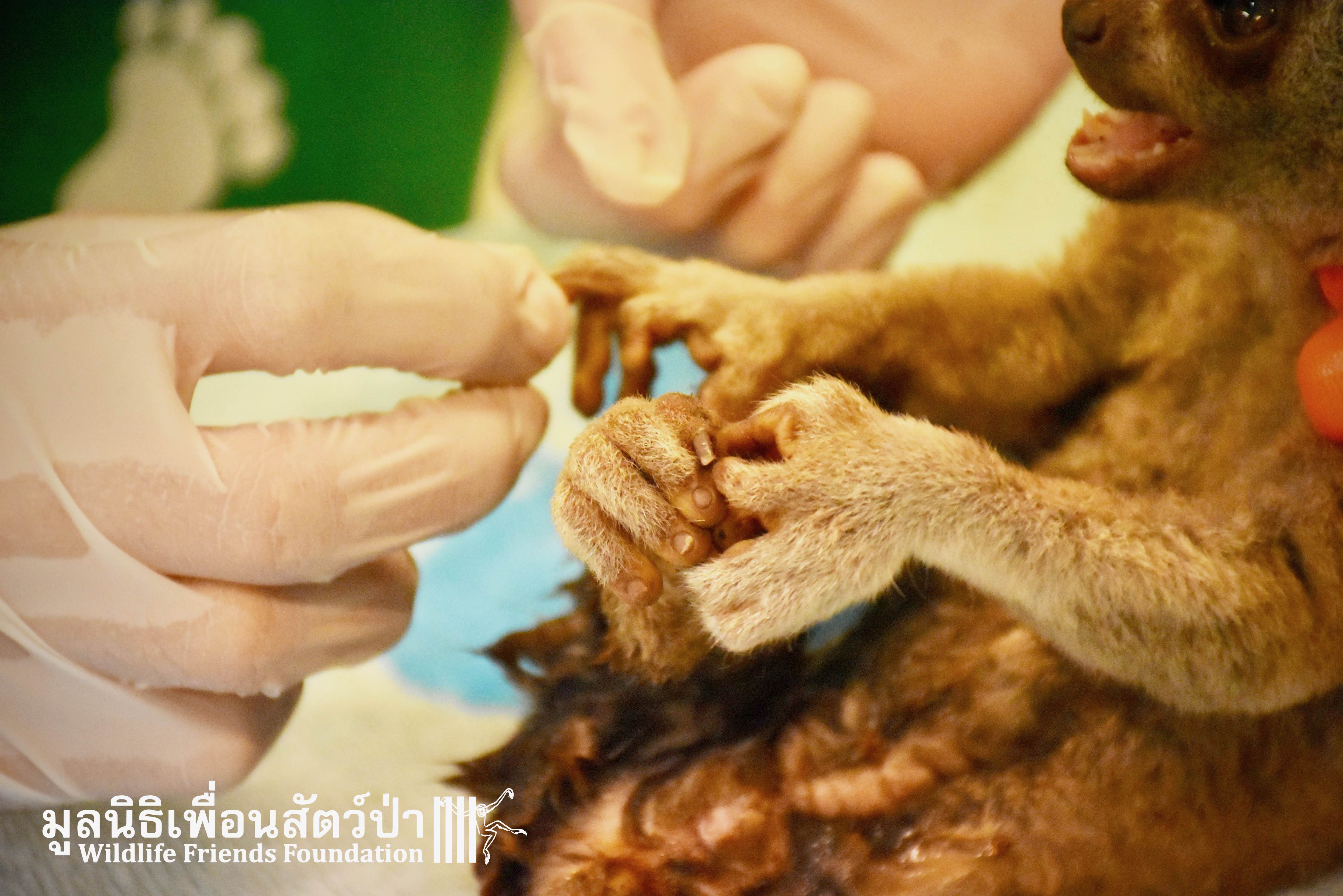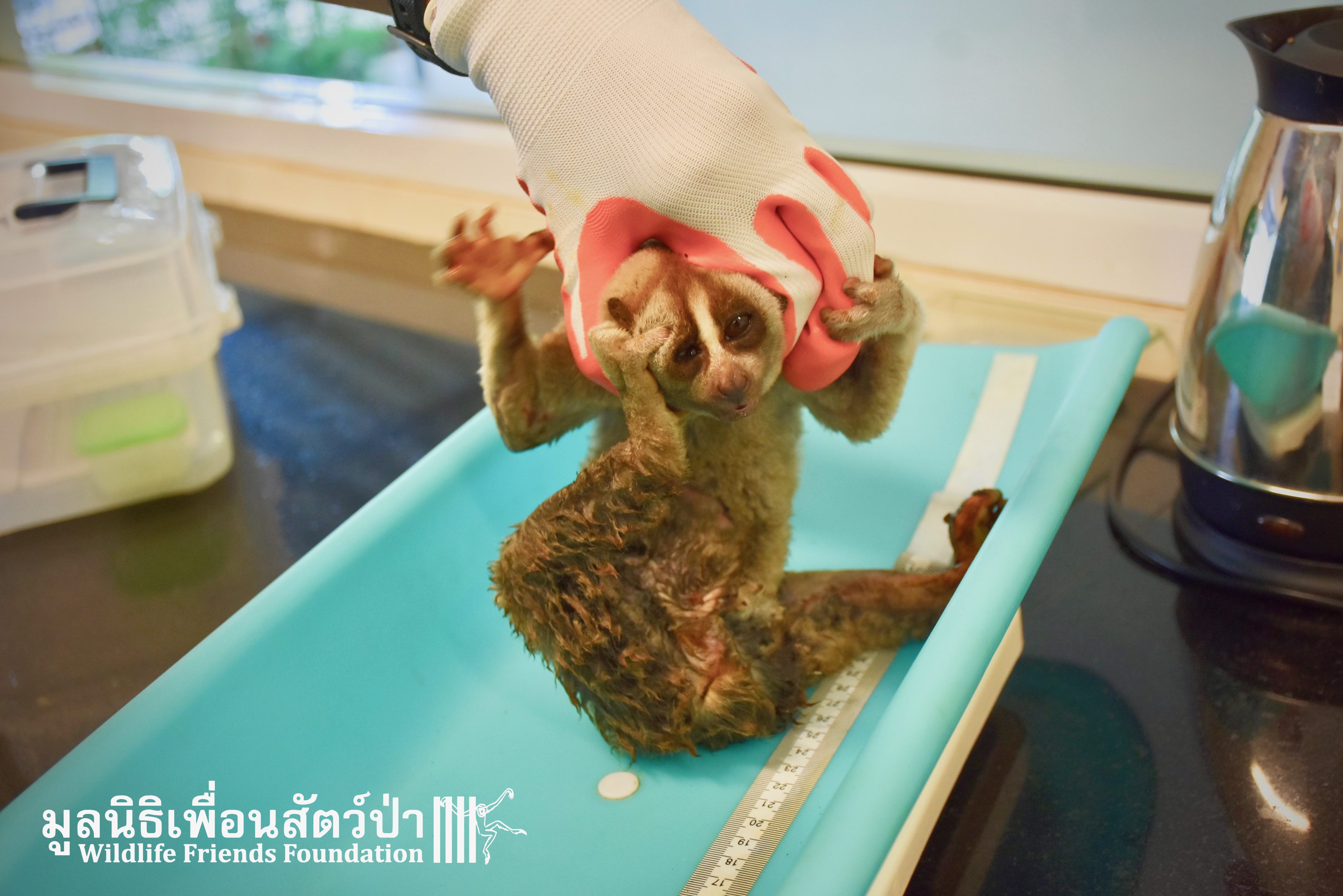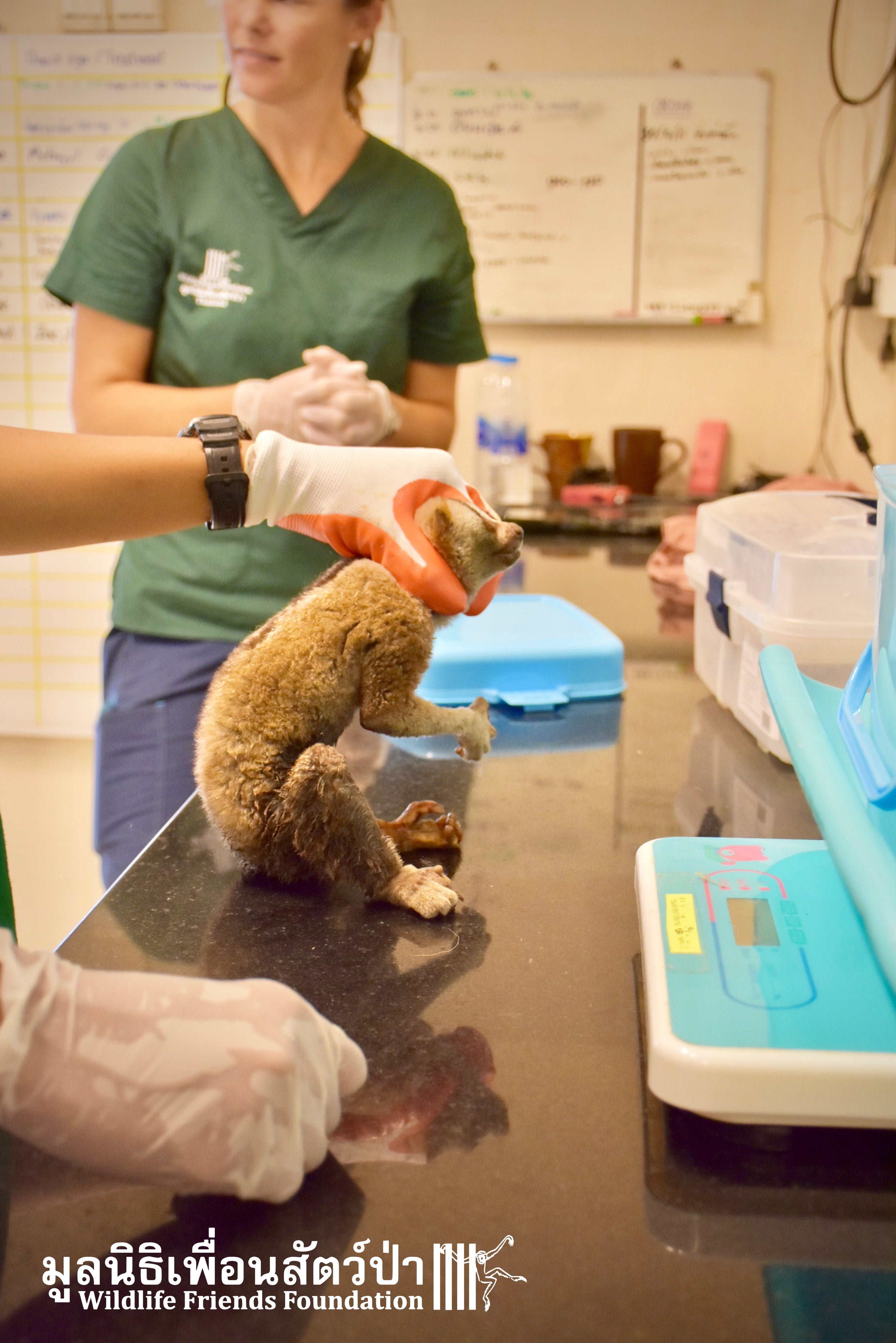 Earlier this week the Wildlife Hospital Vet Team at WFFT Centre received a phone call from the Phetchaburi Livestock Department about a Bengal Slow Loris who had been electrocuted. Luckily this was on the rescue teams way back and they were able to make a slight detour and pick up this injured animal within minutes of receiving the call to help. The team were on the way back to the WFFT Centre from Thong’s Rescue, the gibbon who spent Ten Years in a Trash Filled Shack (see her full story here: https://www.wfft.org/primates/thongs-ten-years-in-a-trash-filled-shack-is-over/ and the video of her rescue here: https://www.wfft.org/wildlife-general/video-diary-thongs-rescue/ )