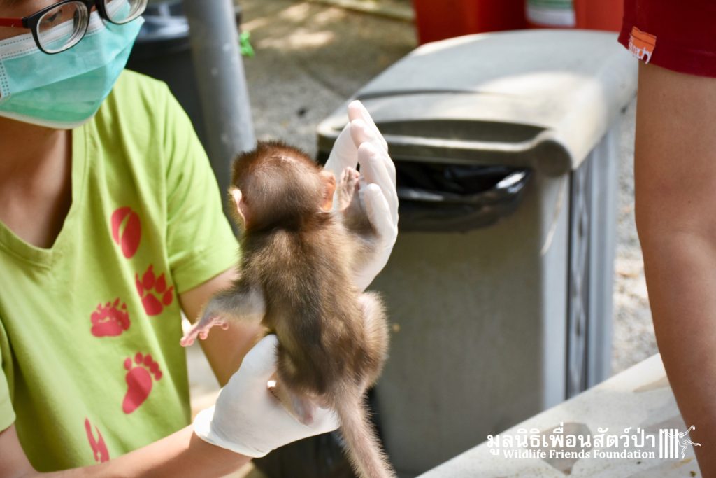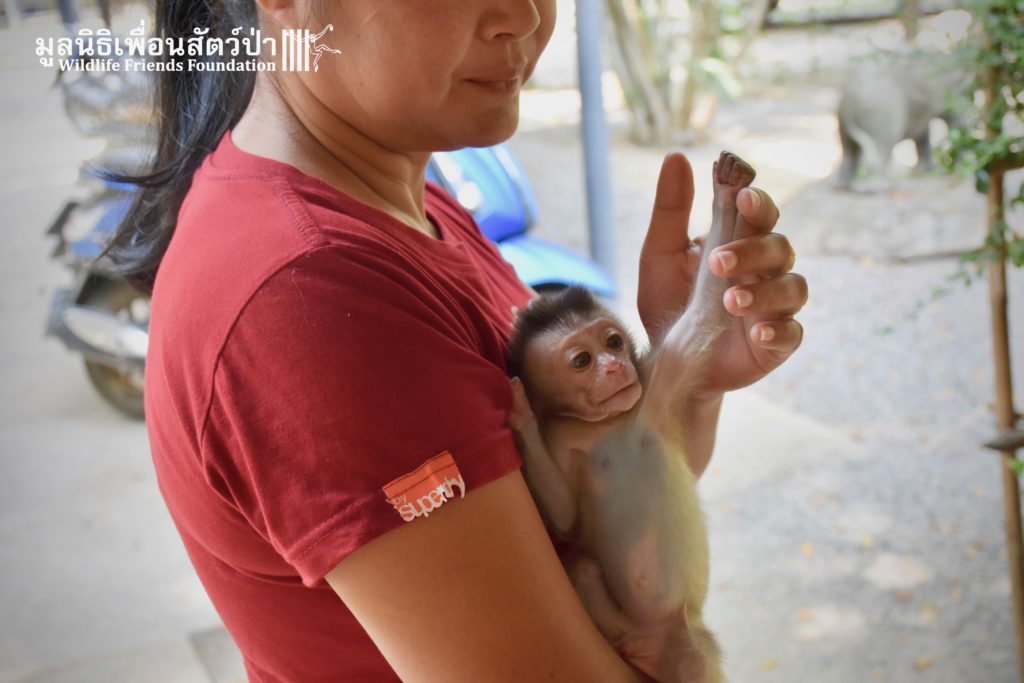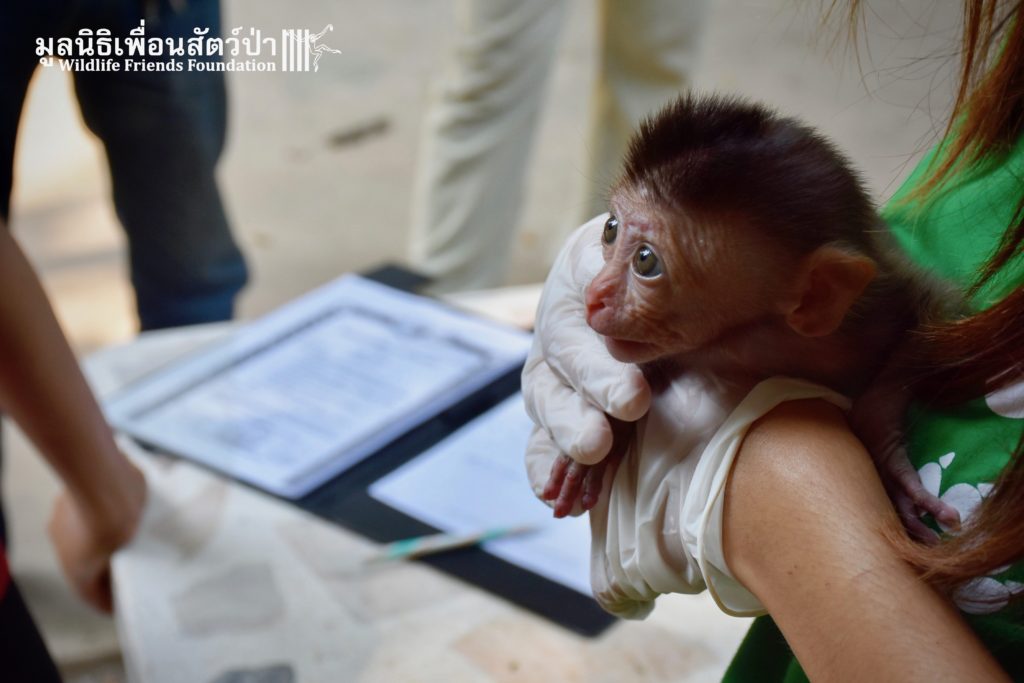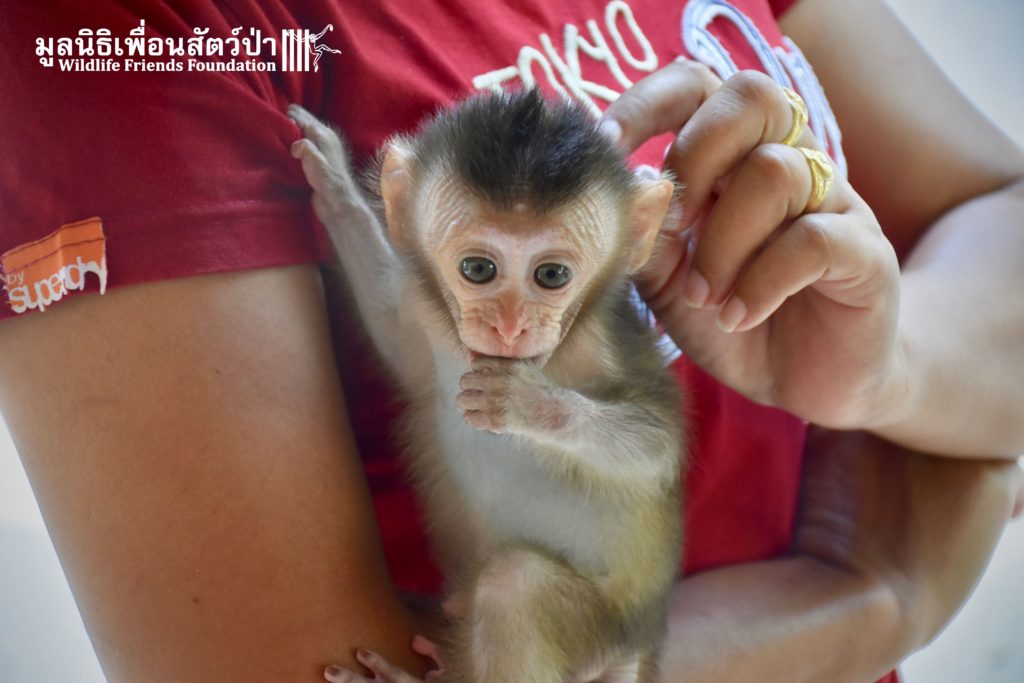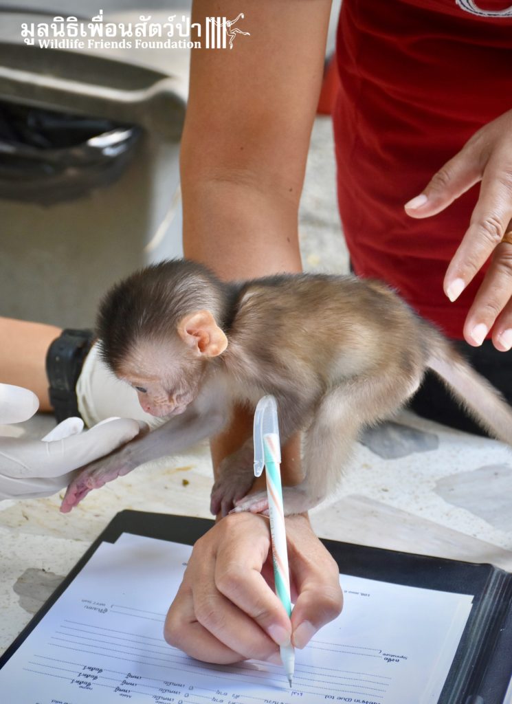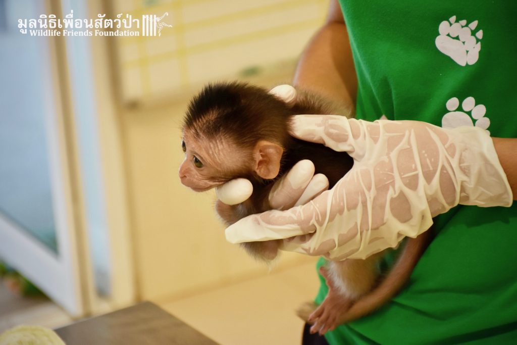 When Boon Ma was brought into the WFFT Wildlife Hospital, Pearl another recently rescued infant was outside being fed by vet nurse Gift. Boon Ma was a little stressed so we showed him Pearl, this calmed him down a little. They will be formally introduced once he has settled in. We estimate that little Boon Ma is around 6 weeks old. He is in good spirits, climbing around and is eating/drinking well. He will spend some time under the close observation of the WFFT Vet Team before being introduced to some other infant macaques that have recently been rescued. Updates will follow…