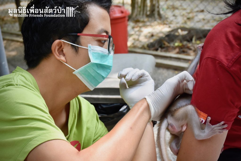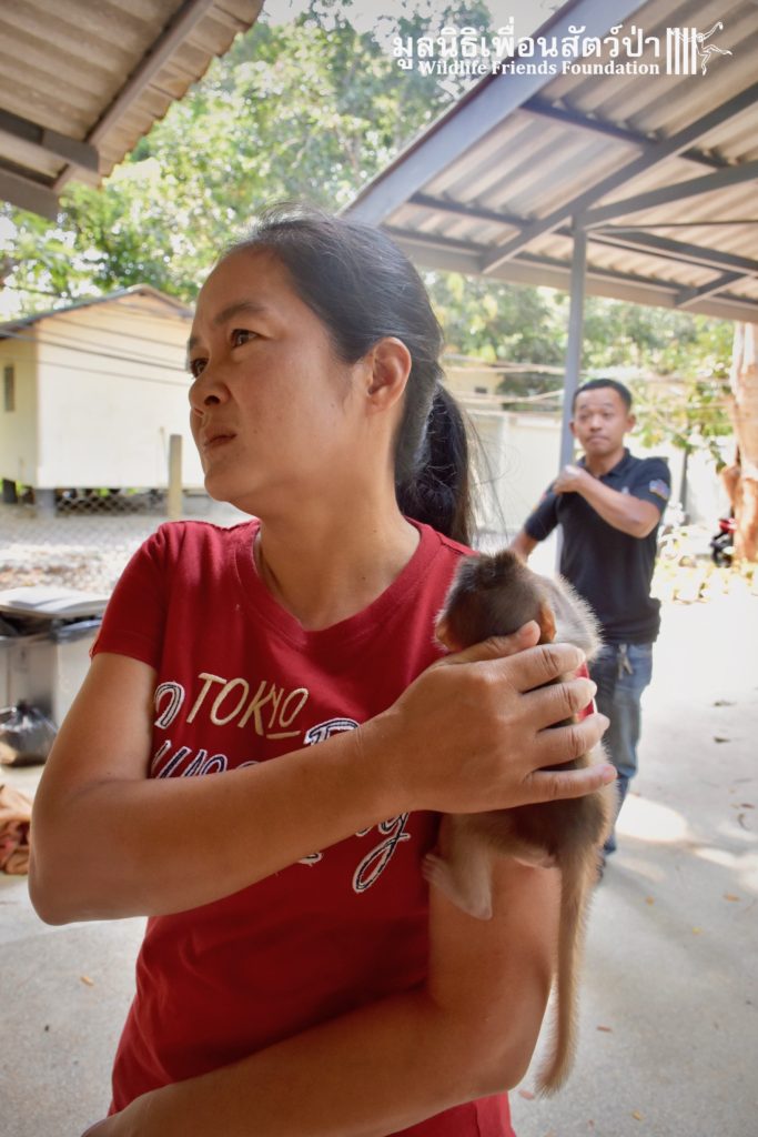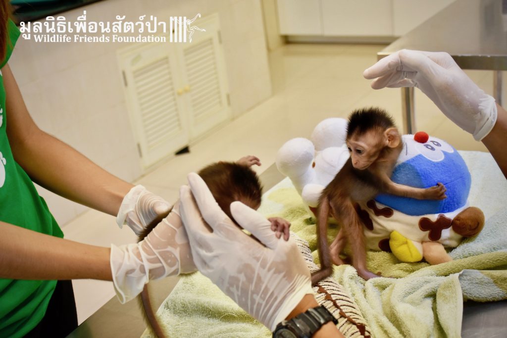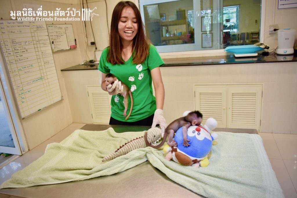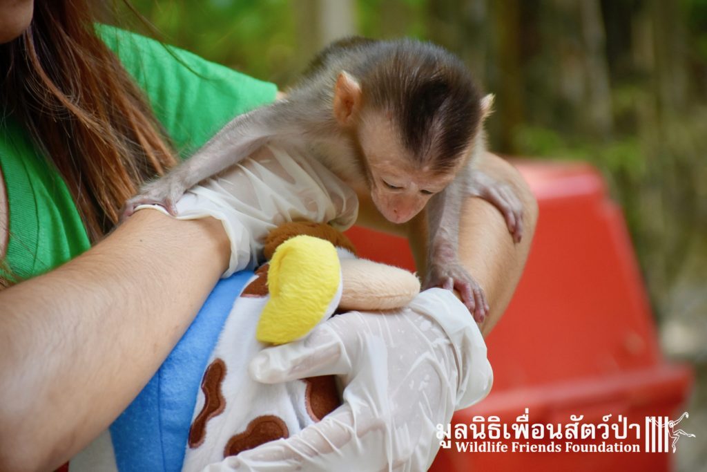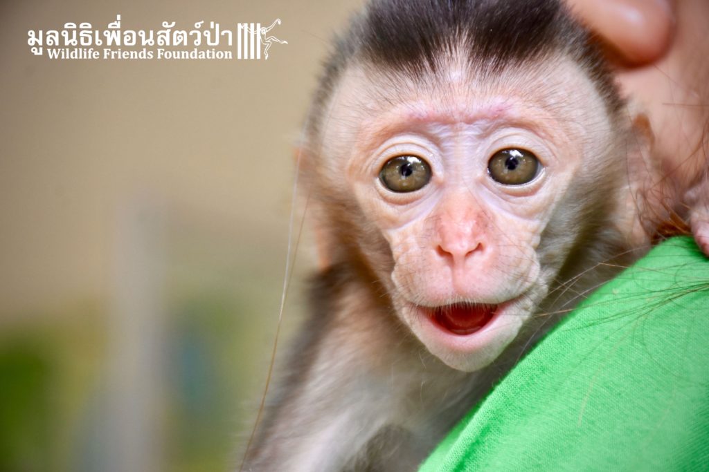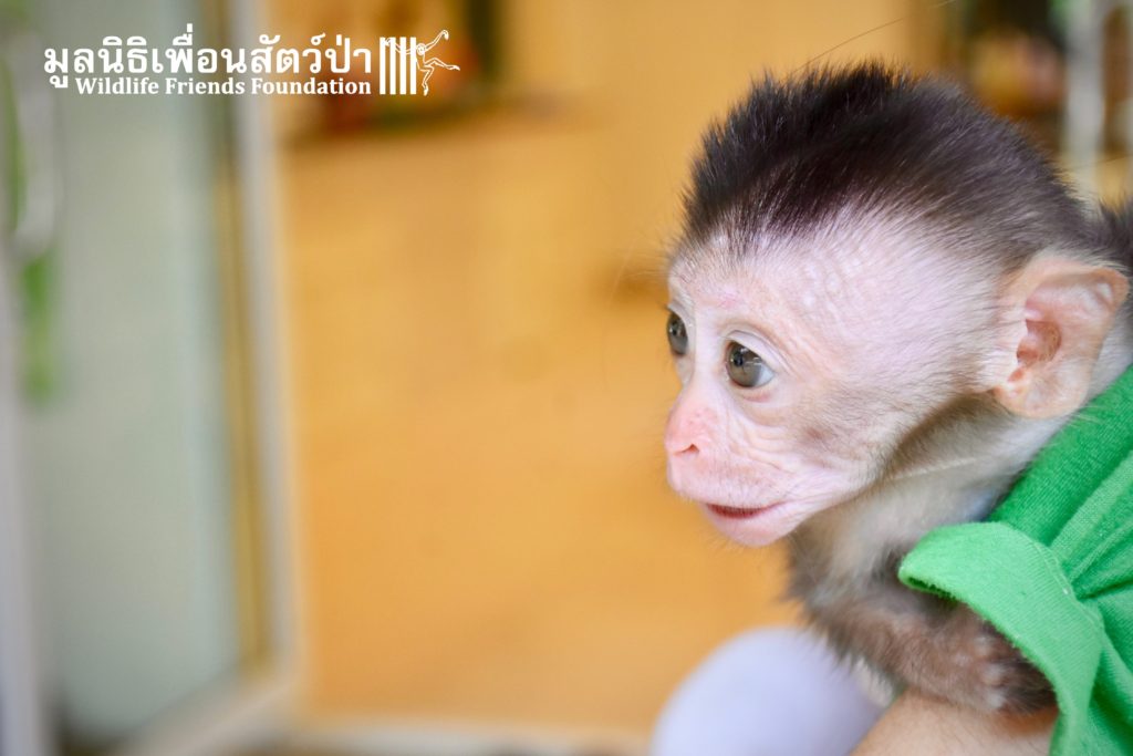 When Boon Ma was brought into the WFFT Wildlife Hospital, Pearl another recently rescued infant was outside being fed by vet nurse Gift. Boon Ma was a little stressed so we showed him Pearl, this calmed him down a little. They will be formally introduced once he has settled in. We estimate that little Boon Ma is around 6 weeks old. He is in good spirits, climbing around and is eating/drinking well. He will spend some time under the close observation of the WFFT Vet Team before being introduced to some other infant macaques that have recently been rescued. Updates will follow…