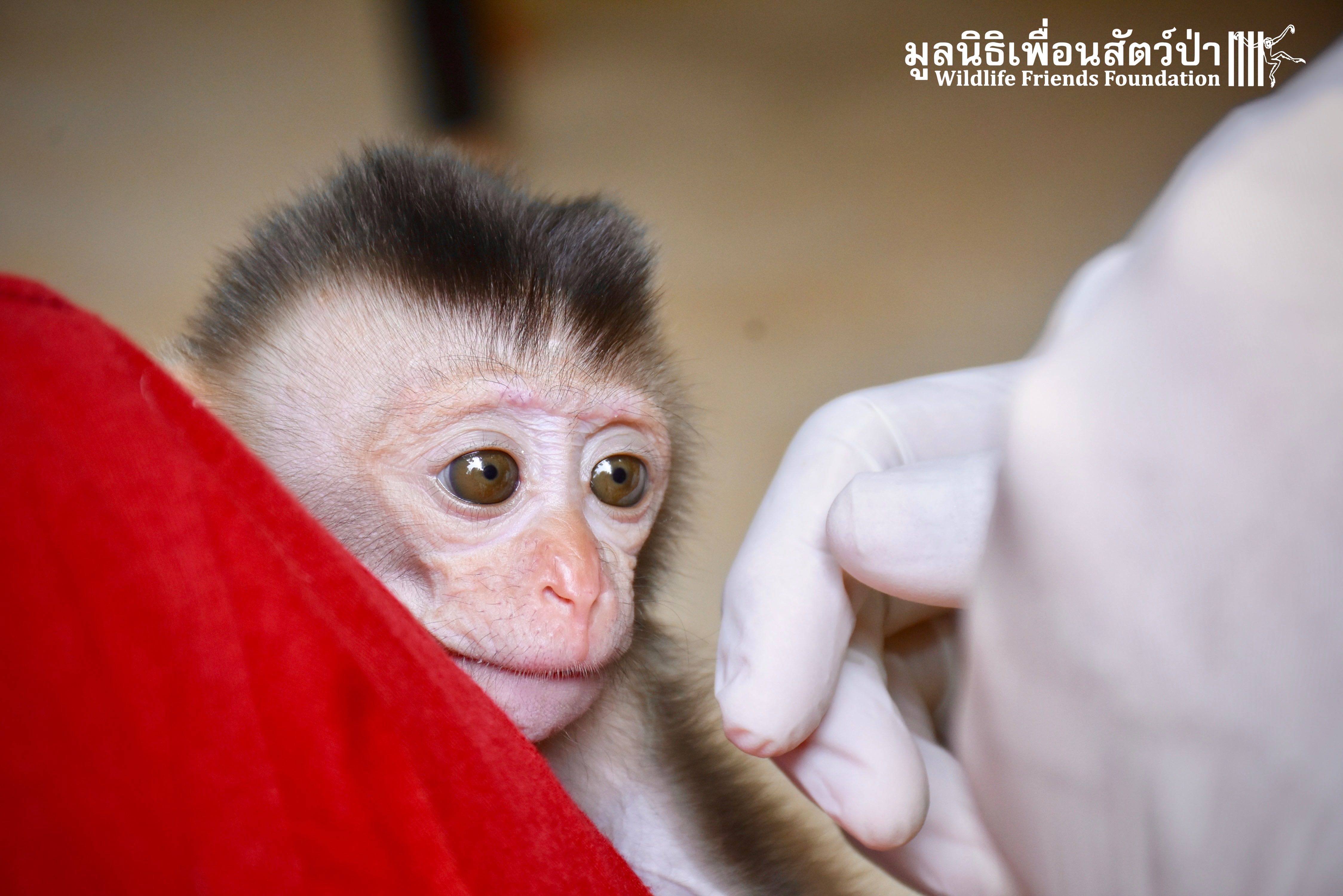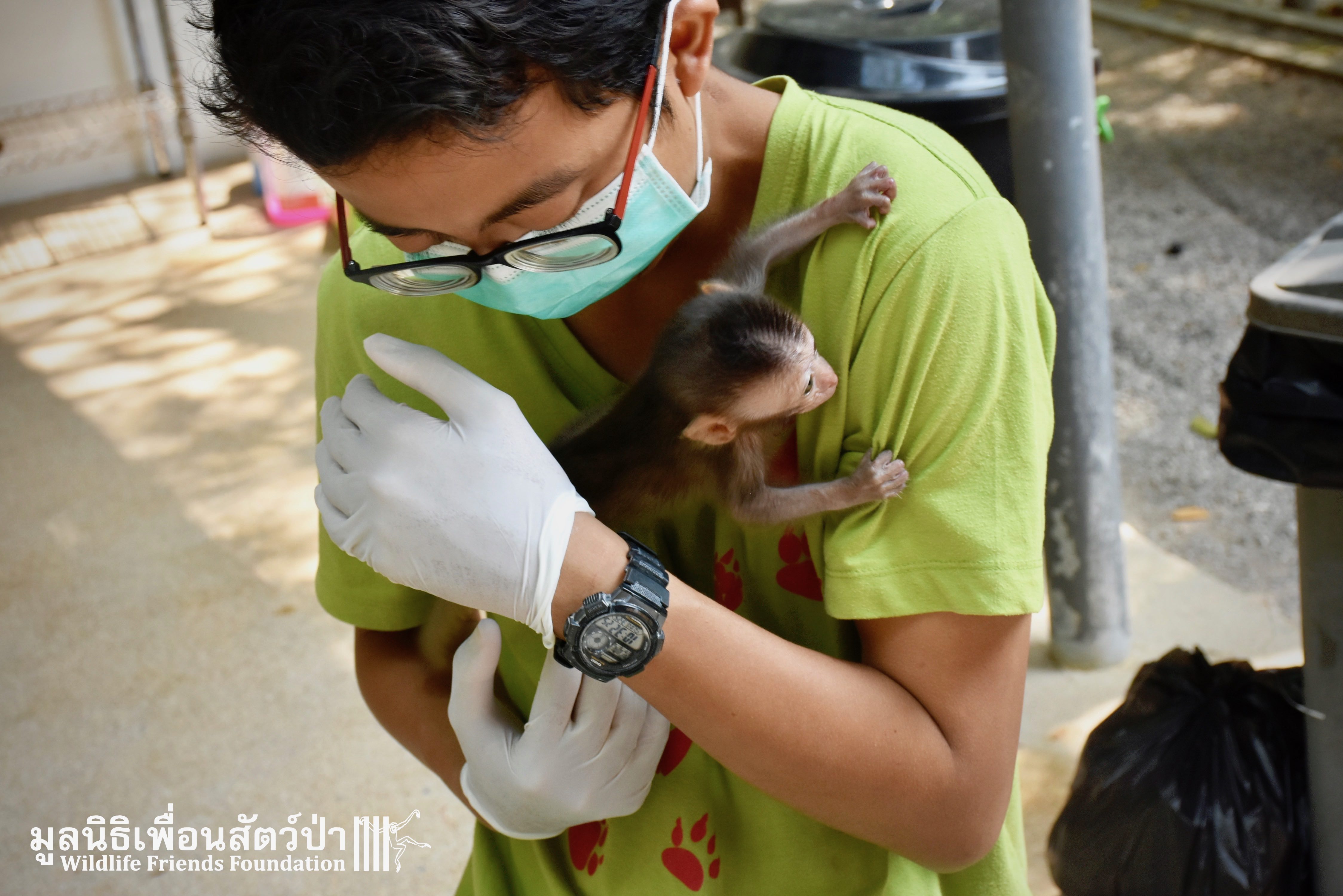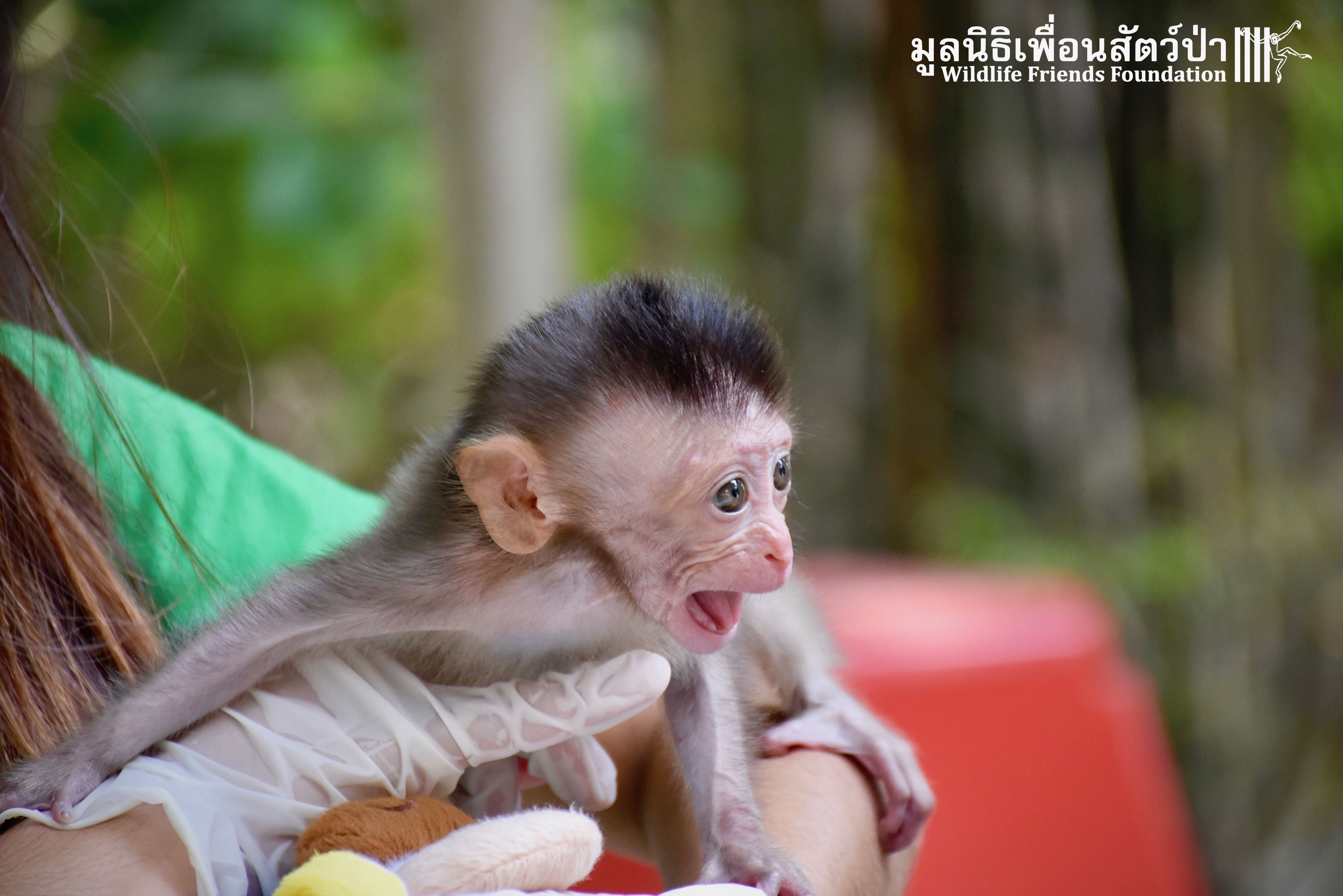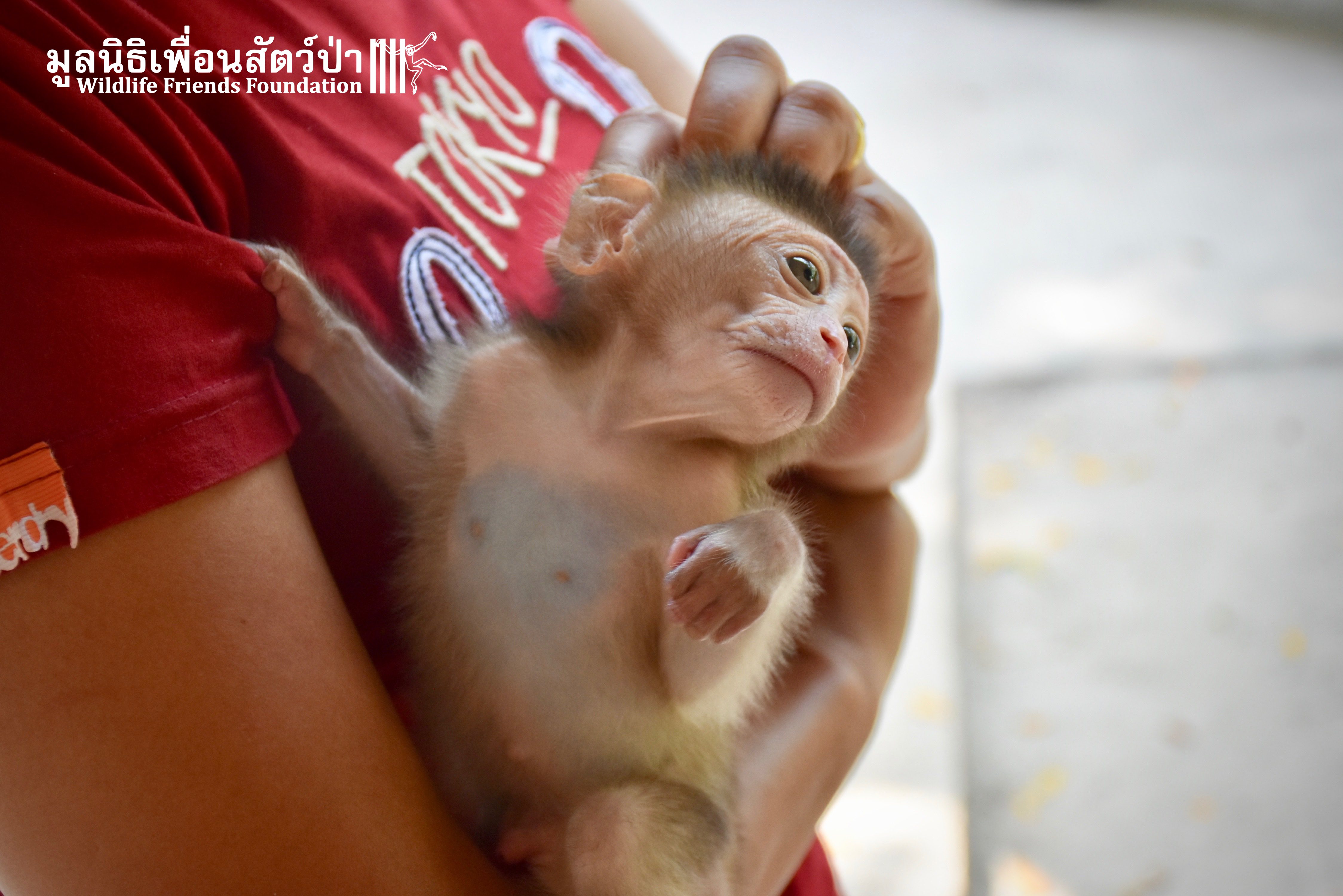When Boon Ma was brought into the WFFT Wildlife Hospital, Pearl another recently rescued infant was outside being fed by vet nurse Gift. Boon Ma was a little stressed so we showed him Pearl, this calmed him down a little. They will be formally introduced once he has settled in. We estimate that little Boon Ma is around 6 weeks old. He is in good spirits, climbing around and is eating/drinking well. He will spend some time under the close observation of the WFFT Vet Team before being introduced to some other infant macaques that have recently been rescued. Updates will follow…