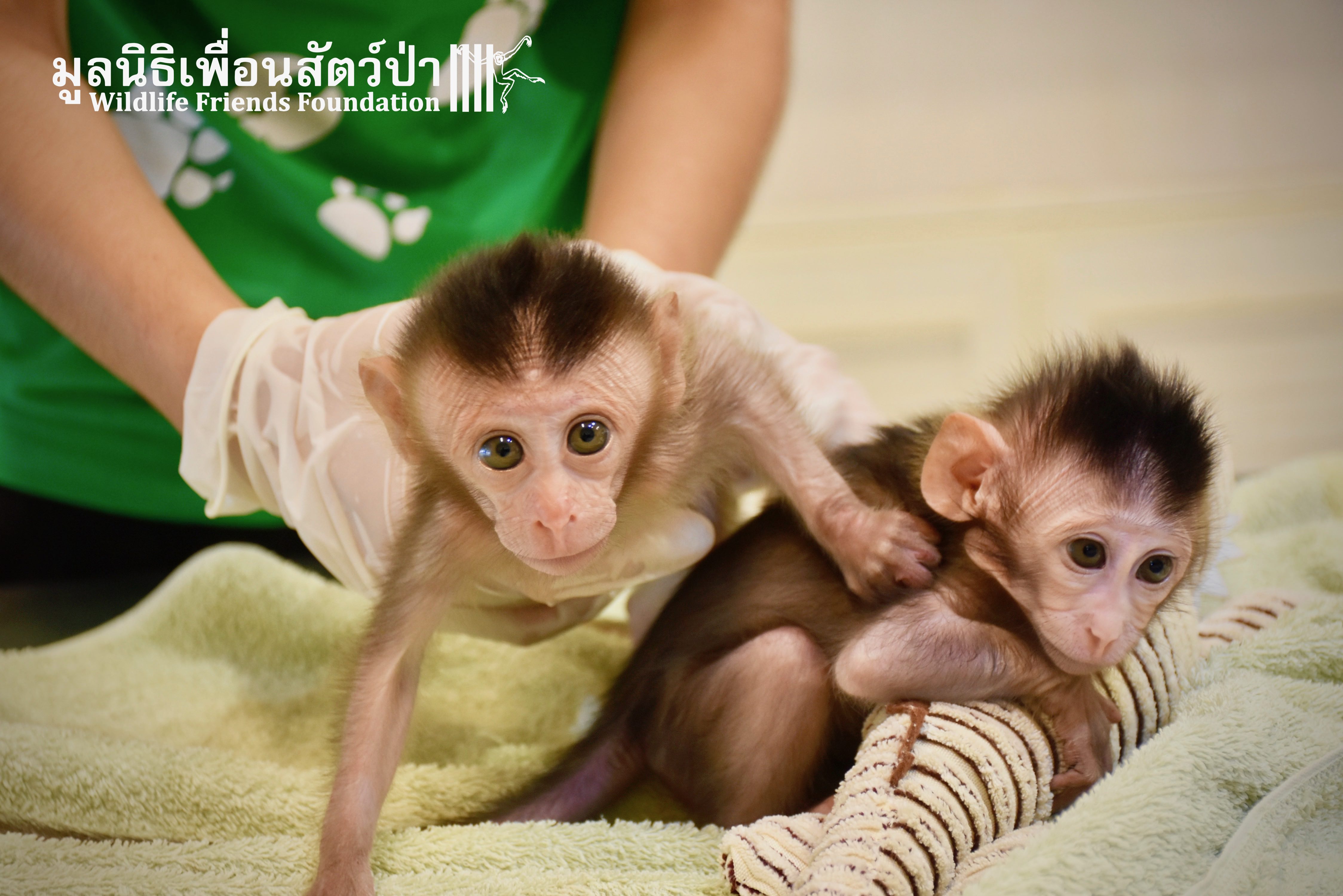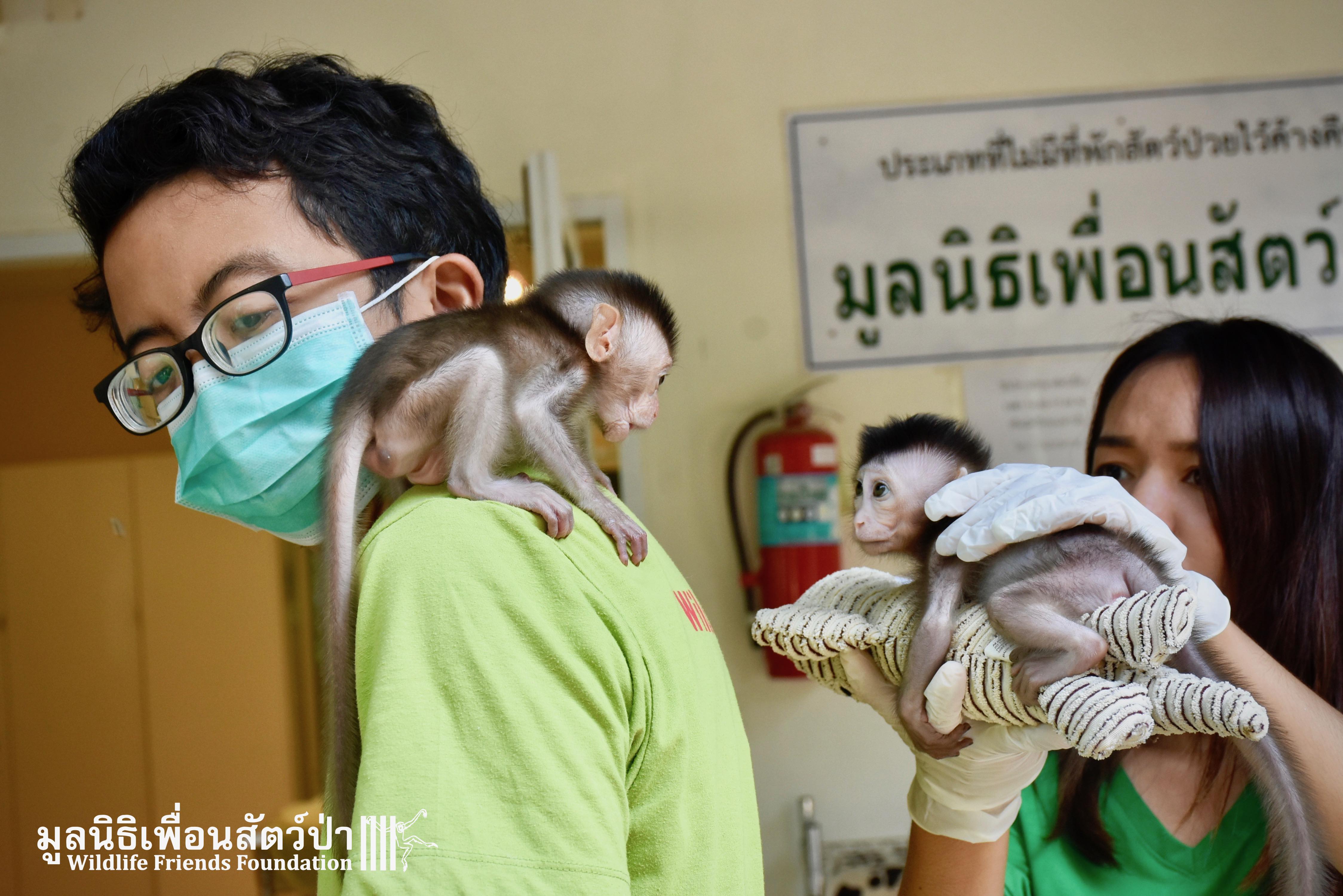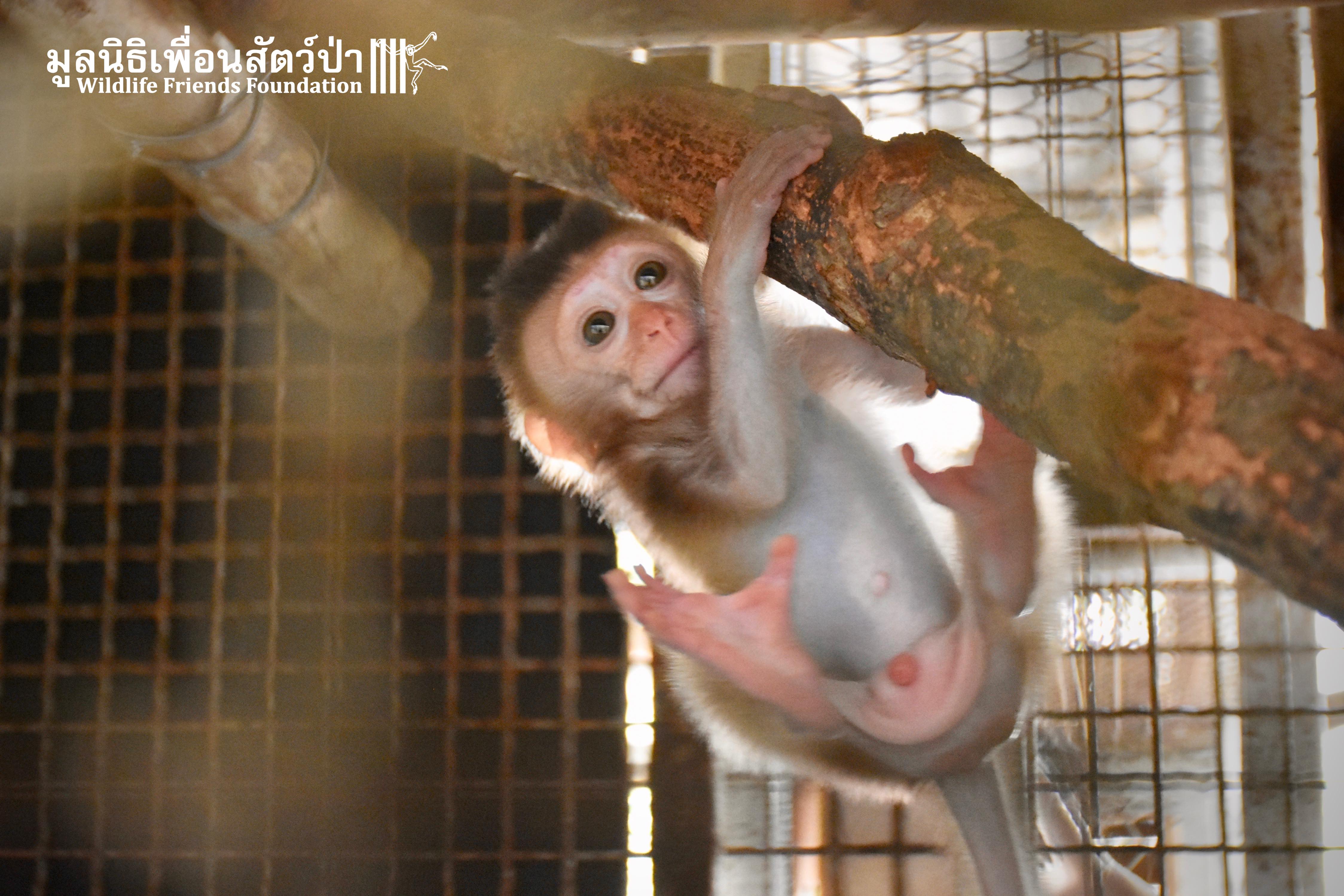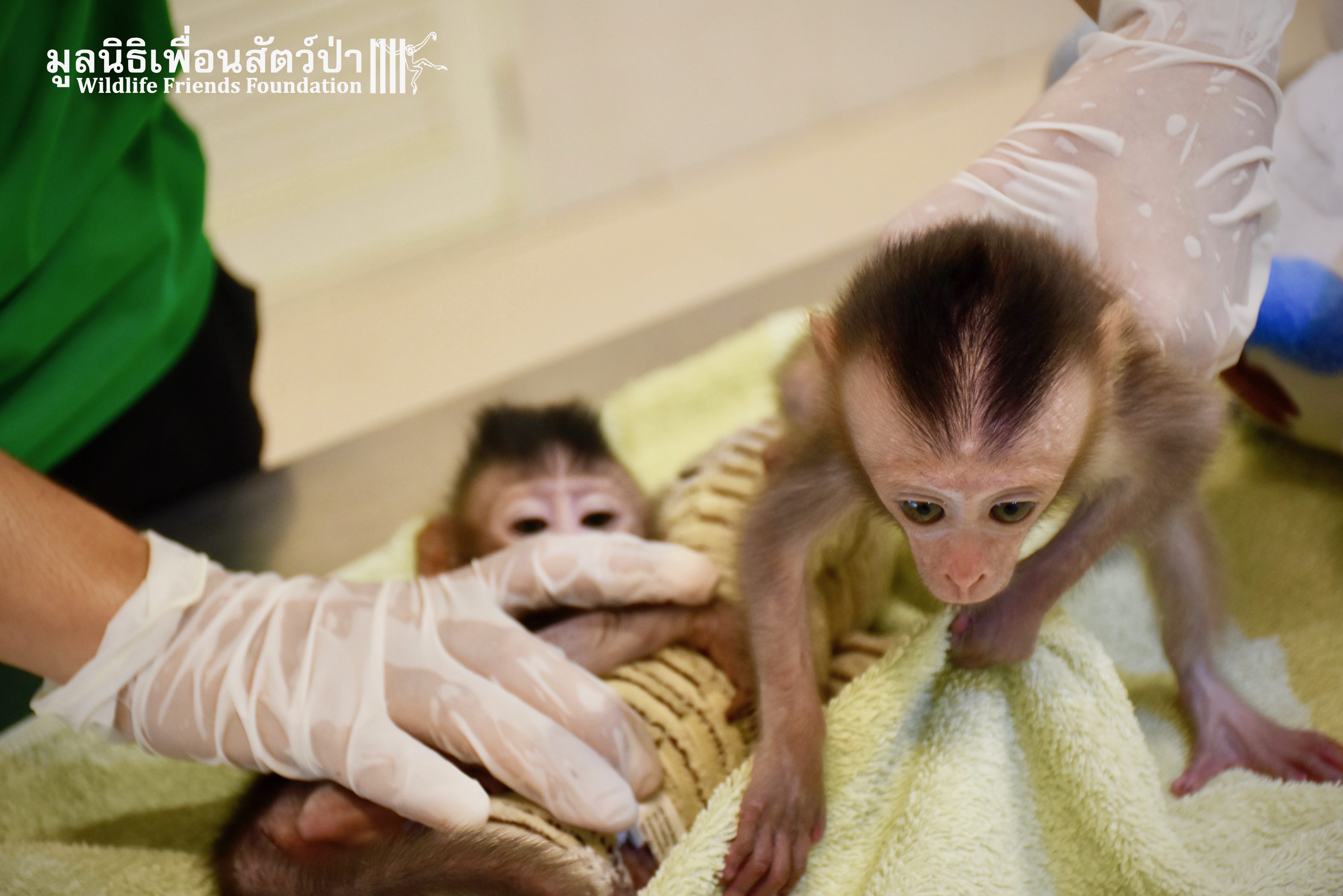 When Boon Ma was brought into the WFFT Wildlife Hospital, Pearl another recently rescued infant was outside being fed by vet nurse Gift. Boon Ma was a little stressed so we showed him Pearl, this calmed him down a little. They will be formally introduced once he has settled in. We estimate that little Boon Ma is around 6 weeks old. He is in good spirits, climbing around and is eating/drinking well. He will spend some time under the close observation of the WFFT Vet Team before being introduced to some other infant macaques that have recently been rescued. Updates will follow…