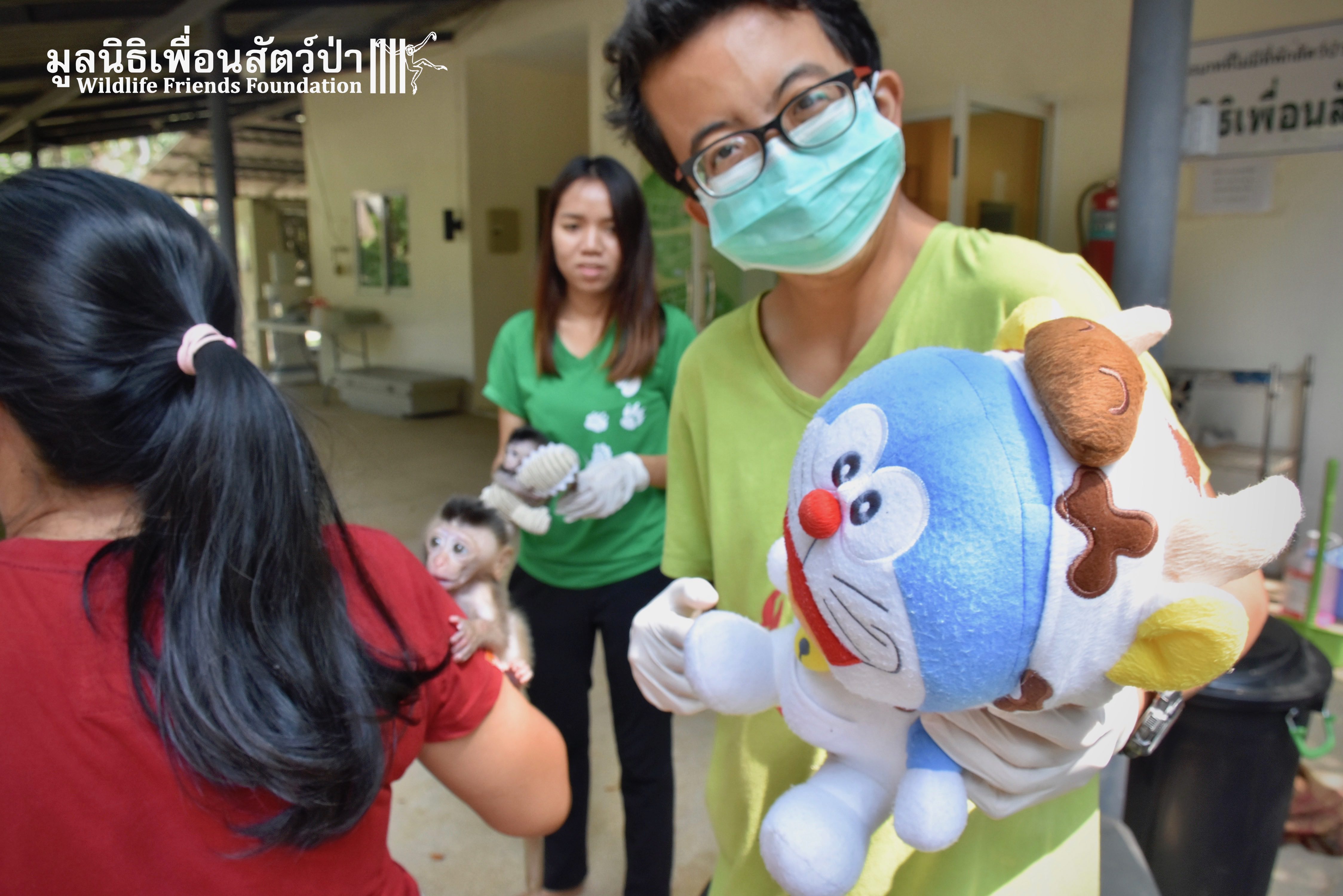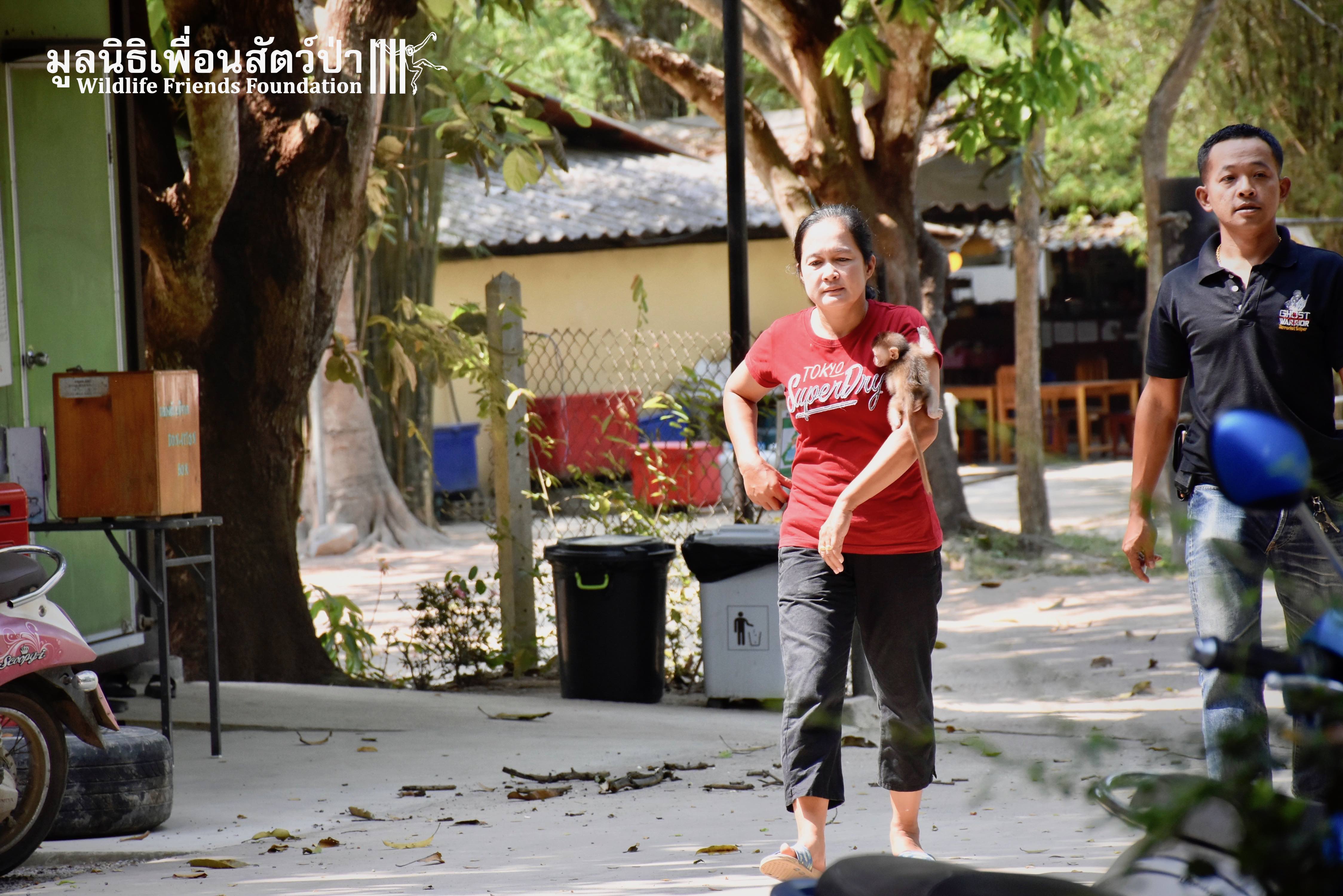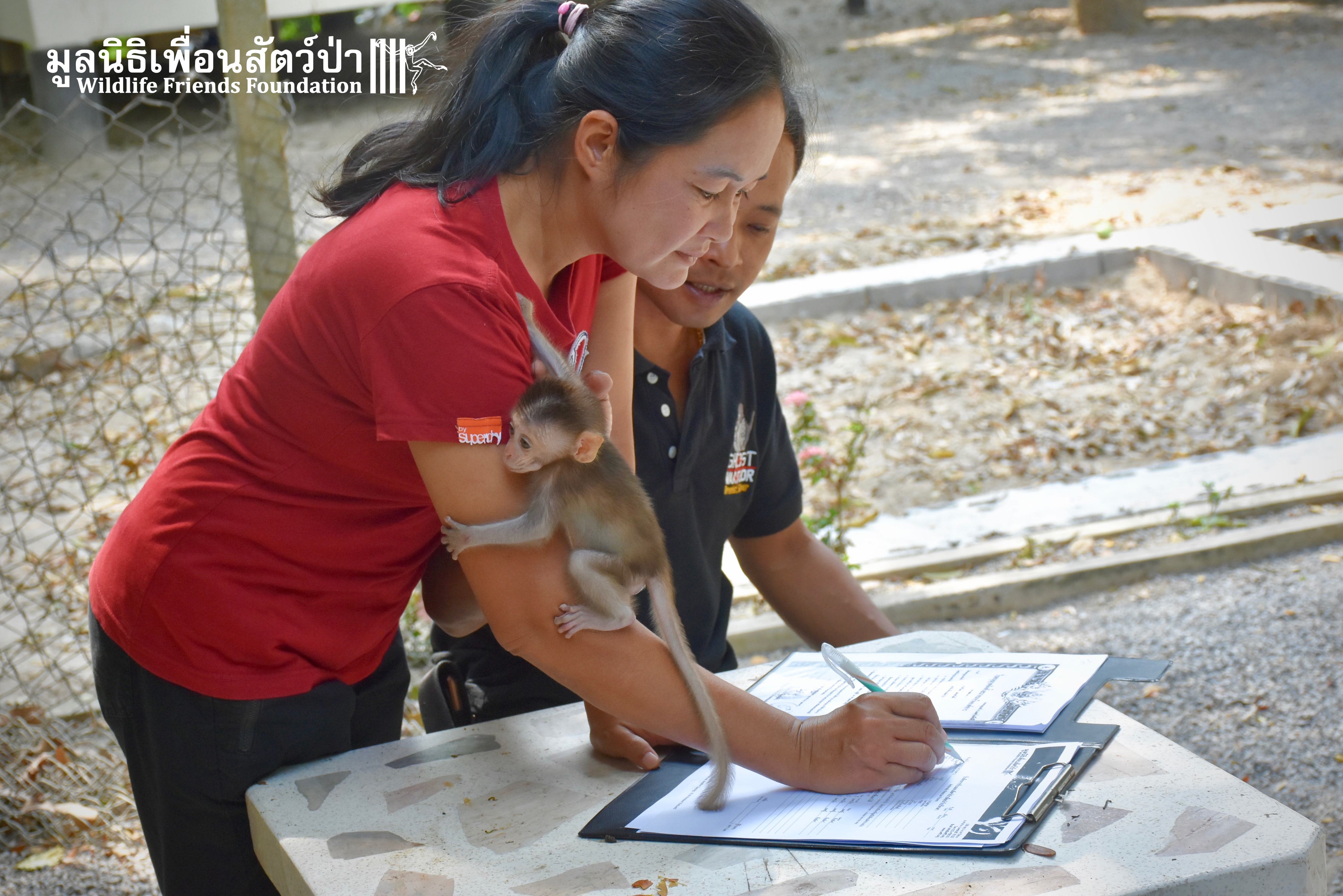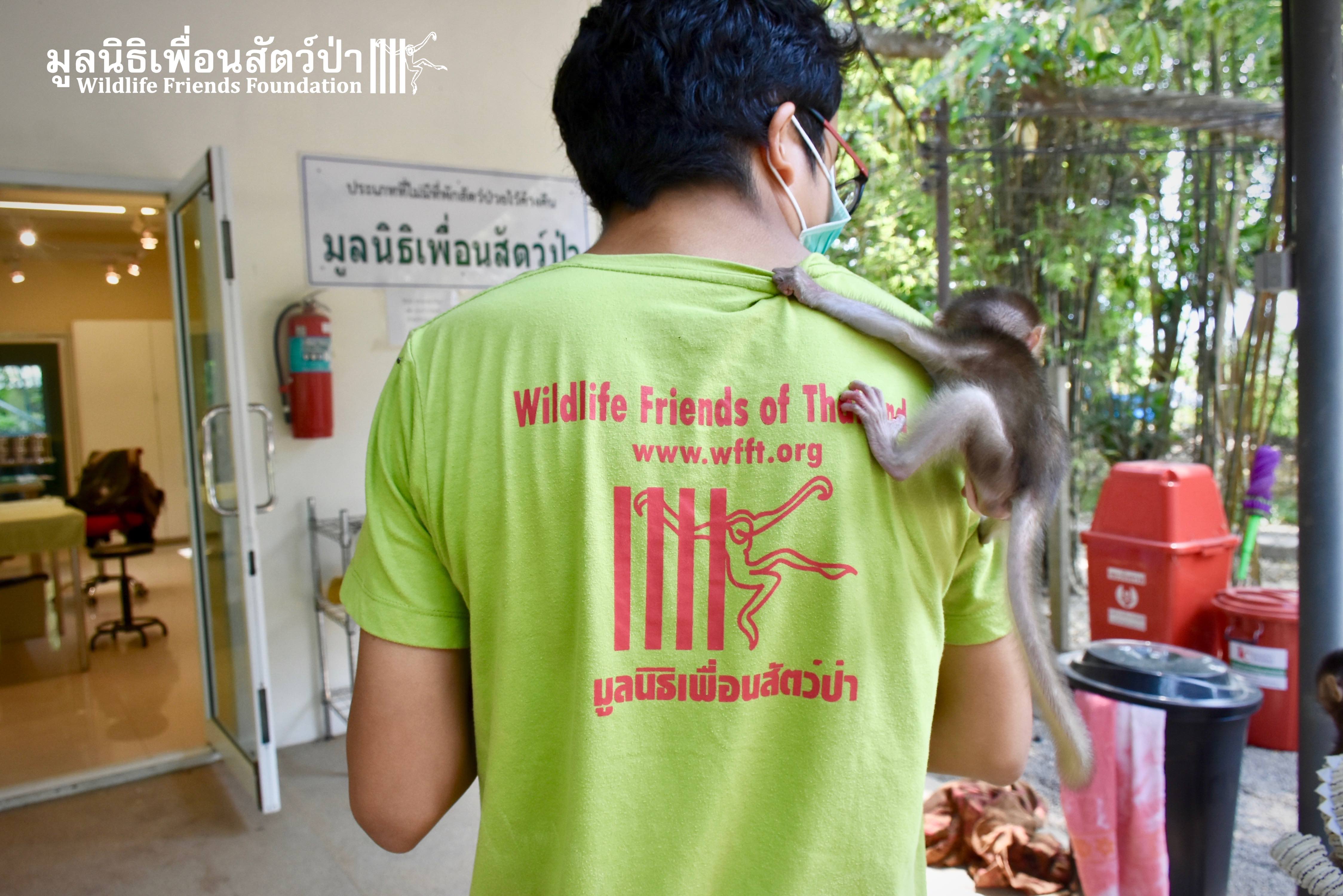 When Boon Ma was brought into the WFFT Wildlife Hospital, Pearl another recently rescued infant was outside being fed by vet nurse Gift. Boon Ma was a little stressed so we showed him Pearl, this calmed him down a little. They will be formally introduced once he has settled in. We estimate that little Boon Ma is around 6 weeks old. He is in good spirits, climbing around and is eating/drinking well. He will spend some time under the close observation of the WFFT Vet Team before being introduced to some other infant macaques that have recently been rescued. Updates will follow…