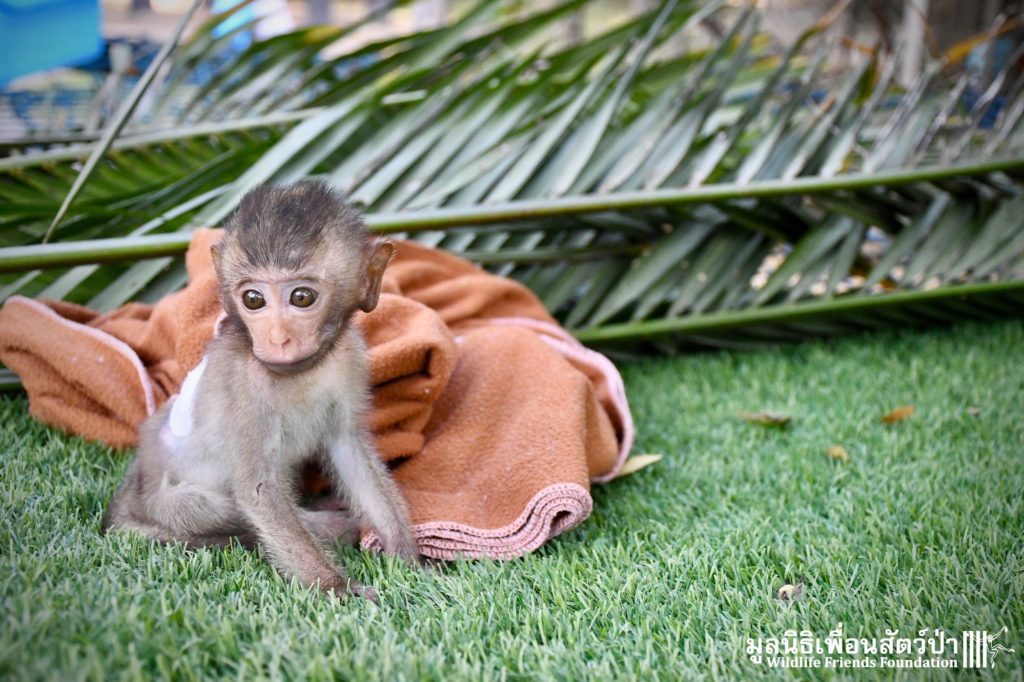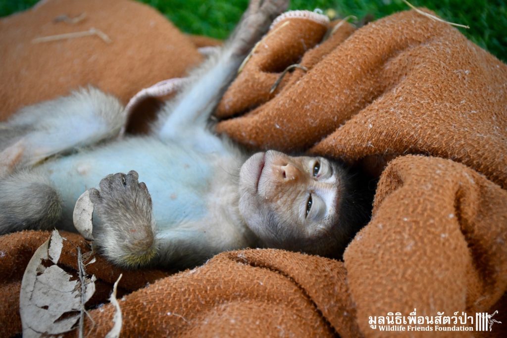 Meet ‘Foy Thong’ a very young infant Long-tailed macaque that was rescued after her mother was hit by a car in Phetchaburi just days ago. After her mother was killed other monkeys attacked her, leaving her with a spinal injuries. She has very limited use of both her legs. She is currently receiving round the clock care from the WFFT Vet Team. We are unsure if she will pull through this terrible ordeal so please send us positive thoughts.